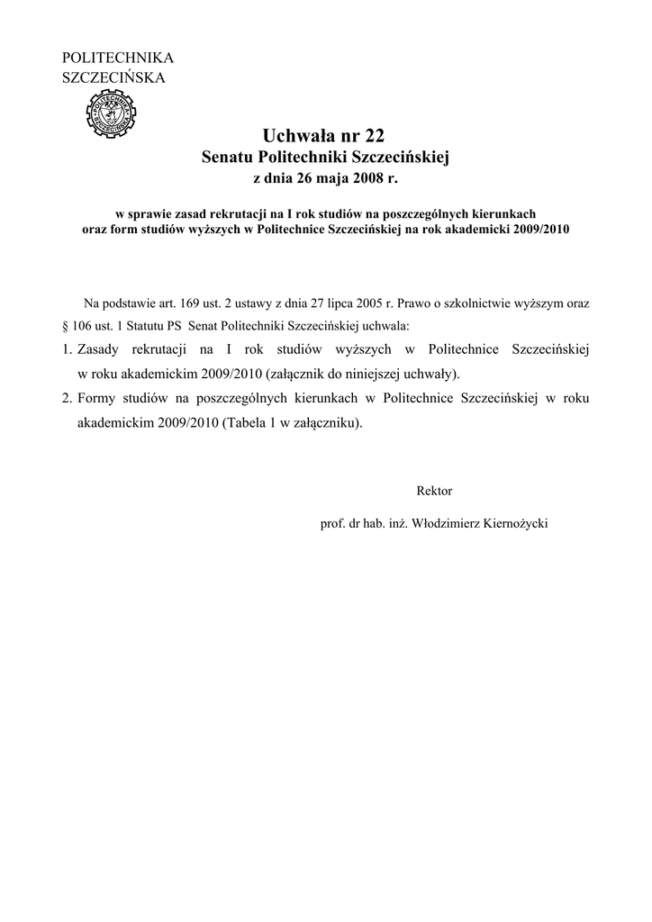 POLITECHNIKA SZCZECIŃSKA Uchwała nr 22 Senatu Politechniki Szczecińskiej z dnia 26 maja 2008 r. w sprawie zasad rekrutacji na I rok studiów na poszczególnych kierunkach oraz form studiów wyższych w Politechnice Szczecińskiej na rok akademicki 2009/2010 Na podstawie art. 169 ust. 2 ustawy z dnia 27 lipca 2005 r. Prawo o szkolnictwie wyższym oraz § 106 ust. 1 Statutu PS Senat Politechniki Szczecińskiej uchwala: 1. Zasady rekrutacji na I rok studiów wyższych w Politechnice Szczecińskiej w roku akademickim 2009/2010 (załącznik do niniejszej uchwały). 2. Formy studiów na poszczególnych kierunkach w Politechnice Szczecińskiej w roku akademickim 2009/2010 (Tabela 1 w załączniku). Rektor prof. dr hab. inż. Włodzimierz Kiernożycki Załącznik do uchwały nr 22 Senatu PS z dnia 26 maja 2008 r. ZASADY REKRUTACJI NA I ROK STUDIÓW WYŻSZYCH w POLITECHNICE SZCZECIŃSKIEJ w roku akademickim 2009/2010 1. KIERUNKI I FORMY STUDIÓW Politechnika Szczecińska w roku akademickim 2009/2010 prowadzi rekrutację na I rok następujących studiów wyższych (tabela 1): • • • • studiów stacjonarnych pierwszego stopnia (S1), studiów niestacjonarnych pierwszego stopnia (odpłatnych) (N1), studiów stacjonarnych drugiego stopnia (S2), studiów niestacjonarnych drugiego stopnia (odpłatnych) (N2), Tabela 1 Wydziały i kierunki oraz formy studiów i tryb realizowania studiów wyższych – rekrutacja na rok akademicki 2009/2010 FORMY STUDIÓW WYDZIAŁ Stacjonarne Niestacjonarne KIERUNEK STUDIÓW PROWADZĄCY I II I II stopnia stopnia stopnia stopnia Architektura i urbanistyka S1 S2 N2 Budownictwo S1 S2 N1 N2 Wydział Budownictwa Budownictwo – Inżynier Europejski S1 i Architektury Inżynieria środowiska S1 S2 Wzornictwo S1 Automatyka i robotyka S1 S2 N1 N2 Wydział Elektronika i telekomunikacja S1 S2 N1 N2 Elektryczny Elektrotechnika S1 S2 N1 N2 Wydział Informatyka S1 S2 N1 N2 Informatyki Zarządzanie i inżynieria produkcji* S1 S2 N1 N2 Inżynieria materiałowa S1 S2 Inżynieria materiałowa (w języku angielskim) ** S1 S2 Wydział Inżynierii Mechanika i budowa maszyn S1 S2 N1 N2 Mechanicznej S1 N1 i Mechatroniki Transport Zarządzanie i inżynieria produkcji * S1 S2 N1 N2 Mechatronika S1 Oceanotechnika S1 S2 N1 N2 Wydział Techniki Transport S1 S2 N1 N2 Morskiej Inżynieria bezpieczeństwa S1 Inżynieria chemiczna i procesowa S1 S2 N1 N2 Wydział Technologii Ochrona środowiska S1 S2 N1 N2 i Inżynierii Technologia chemiczna S1 S2 N1 N2 Chemicznej Towaroznawstwo S1 *) – kierunek prowadzony na Wydziale Informatyki w kooperacji z Wydziałem Inżynierii Mechanicznej i Mechatroniki. **) – kierunek prowadzony w języku angielskim – ODPŁATNIE 1 2. ZASADY REKRUTACJI NA POSZCZEGÓLNE KIERUNKI STUDIÓW 2.1. Zasady rekrutacji na studia stacjonarne i niestacjonarne pierwszego stopnia Podstawą przyjęcia na studia stacjonarne i niestacjonarne pierwszego stopnia w Politechnice Szczecińskiej w roku akademickim 2009/2010 będą wyniki pisemnego egzaminu maturalnego („nowa” matura – świadectwo wydane przez OKE) lub egzaminu dojrzałości („stara” matura) lub wyniki matury międzynarodowej z przedmiotów: język polski, język obcy nowożytny, matematyka oraz ze wskazanego przez maturzystę przedmiotu, którego wynik odnotowany jest na świadectwie maturalnym. Jeżeli maturzysta zdawał egzamin z danego przedmiotu na poziomie podstawowym (p) i rozszerzonym (r), podaje wówczas wynik tego egzaminu, który jest dla niego korzystniejszy uwzględniając współczynniki dla tych poziomów (oznaczenia do wzoru 1). Wyniki egzaminu dojrzałości, egzaminu maturalnego lub matury międzynarodowej wyrażone zostaną za pomocą liczby W – punktów uzyskanych przez kandydata w postępowaniu kwalifikacyjnym. Zasady wyznaczania liczby punktów W są następujące: 2.1.1. Kandydatom, którzy legitymują się świadectwem egzaminu maturalnego „nowej” matury liczba punktów W będzie obliczona według poniższego wzoru: wzór 1 W = [0,35 • Mp/r • Wp/r]1) + [0,2 • Dp/r • Wp/r]1) + 0,2 • Pp/r • Wp/r+0,25 • Jp/r/d • Wp/r/d 1) w przypadku, gdy kandydat nie zdawał egzaminu maturalnego z matematyki lub przedmiotu dodatkowego (zarówno na poziomie podstawowym, jak i rozszerzonym) odpowiedni człon we wzorze 1 przyjmuje wartość zerową [0,35 • Mp/r • Wp/r] = 0; [0,2 • Dp/r • Wp/r]=0 Symbole wprowadzone we wzorze 1 oznaczają liczbę punktów [%] uzyskanych przez kandydata na egzaminie maturalnym z przedmiotów: Pp/r – język polski – poziom podstawowy (p) lub rozszerzony (r), – język obcy nowożytny – poziom podstawowy (p), rozszerzony (r) lub poziom Jp/r/d klasy dwujęzycznej (d), Mp/r – matematyka – poziom podstawowy (p) lub rozszerzony (r), Dp/r – wskazany przedmiot – poziom podstawowy (p) lub rozszerzony (r), oraz określone są wartości współczynników dla poszczególnych poziomów egzaminu maturalnego: Wp = 1,0 – dla poziomu podstawowego, – dla poziomu rozszerzonego, Wr = 1,3 Wd = 1,4 – dla poziomu klasy dwujęzycznej (dotyczy tylko egzaminu z języka obcego) 2.1.2. Kandydatom, którzy legitymują się świadectwem egzaminu dojrzałości „starej matury” lub międzynarodowej matury liczba punktów W będzie obliczona według poniższego wzoru: wzór 2 W = 0,35[Mpis]* + 0,2 [Dpis]** + 0,2[Ppis]+ 0,25[J] *** * w przypadku, gdy kandydat nie zdawał egzaminu pisemnego z matematyki, a zdawał egzamin ustny z tego przedmiotu człon [Mpis]* wzoru 2 zastąpiony zostanie wyrażeniem [0,7 Mu], a w przypadku, gdy kandydat nie zdawał egzaminu z matematyki (zarówno pisemnego, jak i ustnego) wyrażeniem [0,35 Msw] ** w przypadku, gdy kandydat legitymujący się świadectwem egzaminu dojrzałości („stara” matura) nie zdawał egzaminu pisemnego ze wskazanego przedmiotu, a zdawał egzamin ustny z tego przedmiotu człon [Dpis] wzoru 2 zastąpiony zostanie wyrażeniem [0,7 Du], a w 2 przypadku, gdy kandydat nie zdawał egzaminu z tego przedmiotu