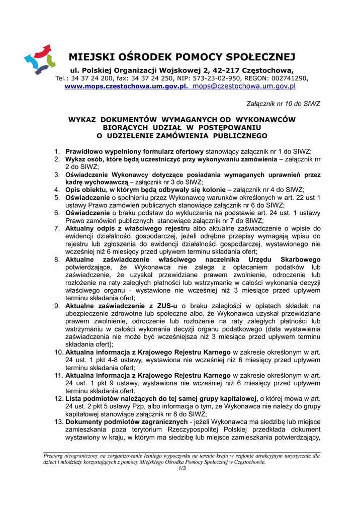 MIEJSKI OŚRODEK POMOCY SPOŁECZNEJ ul. Polskiej Organizacji Wojskowej 2, 42-217 Częstochowa, Tel.: 34 37 24 200, fax: 34 37 24 250, NIP: 573-23-02-950, REGON: 002741290, www.mops.czestochowa.um.gov.pl. [email protected] Załącznik nr 10 do SIWZ WYKAZ DOKUMENTÓW WYMAGANYCH OD WYKONAWCÓW BIORĄCYCH UDZIAŁ W POSTĘPOWANIU O UDZIELENIE ZAMÓWIENIA PUBLICZNEGO 1. Prawidłowo wypełniony formularz ofertowy stanowiący załącznik nr 1 do SIWZ; 2. Wykaz osób, które będą uczestniczyć przy wykonywaniu zamówienia – załącznik nr 2 do SIWZ; 3. Oświadczenie Wykonawcy dotyczące posiadania wymaganych uprawnień przez kadrę wychowawczą – załącznik nr 3 do SIWZ; 4. Opis obiektu, w którym będą odbywały się kolonie – załącznik nr 4 do SIWZ; 5. Oświadczenie o spełnieniu przez Wykonawcę warunków określonych w art. 22 ust 1 ustawy Prawo zamówień publicznych stanowiące załącznik nr 6 do SIWZ; 6. Oświadczenie o braku podstaw do wykluczenia na podstawie art. 24 ust. 1 ustawy Prawo zamówień publicznych stanowiące załącznik nr 7 do SIWZ; 7. Aktualny odpis z właściwego rejestru albo aktualne zaświadczenie o wpisie do ewidencji działalności gospodarczej, jeżeli odrębne przepisy wymagają wpisu do rejestru lub zgłoszenia do ewidencji działalności gospodarczej, wystawionego nie wcześniej niż 6 miesięcy przed upływem terminu składania ofert; 8. Aktualne zaświadczenie właściwego naczelnika Urzędu Skarbowego potwierdzające, że Wykonawca nie zalega z opłacaniem podatków lub zaświadczenie, że uzyskał przewidziane prawem zwolnienie, odroczenie lub rozłożenie na raty zaległych płatności lub wstrzymanie w całości wykonania decyzji właściwego organu - wystawione nie wcześniej niż 3 miesiące przed upływem terminu składania ofert; 9. Aktualne zaświadczenie z ZUS-u o braku zaległości w opłatach składek na ubezpieczenie zdrowotne lub społeczne albo, że Wykonawca uzyskał przewidziane prawem zwolnienie, odroczenie lub rozłożenie na raty zaległych płatności lub wstrzymaniu w całości wykonania decyzji organu podatkowego (data wystawienia zaświadczenia nie może być wcześniejsza niż 3 miesiące przed upływem terminu składania ofert); 10. Aktualna informacja z Krajowego Rejestru Karnego w zakresie określonym w art. 24 ust. 1 pkt 4-8 ustawy, wystawiona nie wcześniej niż 6 miesięcy przed upływem terminu składania ofert; 11. Aktualna informacja z Krajowego Rejestru Karnego w zakresie określonym w art. 24 ust. 1 pkt 9 ustawy, wystawiona nie wcześniej niż 6 miesięcy przed upływem terminu składania ofert. 12. Lista podmiotów należących do tej samej grupy kapitałowej, o której mowa w art. 24 ust. 2 pkt 5 ustawy Pzp, albo informacja o tym, że Wykonawca nie należy do grupy kapitałowej stanowiące załącznik nr 8 do SIWZ; 13. Dokumenty podmiotów zagranicznych - jeżeli Wykonawca ma siedzibę lub miejsce zamieszkania poza terytorium Rzeczypospolitej Polskiej przedkłada dokument wystawiony w kraju, w którym ma siedzibę lub miejsce zamieszkania potwierdzający, Przetarg nieograniczony na zorganizowanie organizowanie letniego wypoczynku na terenie kraju w regionie atrakcyjnym turystycznie dla dzieci i młodzieży korzystających z pomocy Miejskiego Ośrodka Pomocy Społecznej w Częstochowie. 1/3 MIEJSKI OŚRODEK POMOCY SPOŁECZNEJ ul. Polskiej Organizacji Wojskowej 2, 42-217 Częstochowa, Tel.: 34 37 24 200, fax: 34 37 24 250, NIP: 573-23-02-950, REGON: 002741290, www.mops.czestochowa.um.gov.pl. [email protected] że: a) nie otwarto jego likwidacji ani nie ogłoszono upadłości - wystawiony nie wcześniej niż 6 miesięcy przed upływem terminu składania ofert; b) nie zalega z uiszczaniem podatków, opłat, składek na ubezpieczenie społeczne i zdrowotne albo że uzyskał przewidziane prawem zwolnienie, odroczenie lub rozłożenie na raty zaległych płatności lub wstrzymanie w całości wykonania decyzji właściwego organu - wystawiony nie wcześniej niż 3 miesiące przed upływem terminu składania ofert; c) nie orzeczono wobec niego zakazu ubiegania się o zamówienie - wystawiony nie wcześniej niż 6 miesięcy przed upływem terminu składania ofert; 14. Oryginalne pełnomocnictwo potwierdzające uprawnienie osób podpisujących ofertę, jeżeli uprawnienie takie nie wynika wprost z dokumentu stwierdzającego status prawny Wykonawcy lub z przepisów prawa; 15. Wykaz wykonanych lub wykonywanych usług - załącznik nr 9 do SIWZ; 16. Poświadczenie z tym, że w odniesieniu do nadal wykonywanych usług poświadczenie powinno być wydane nie wcześniej niż na 3 miesiące przed upływem terminu składania ofert (w przypadku, gdy Zamawiający jest podmiotem, na rzecz którego wskazane w wykazie usługi zostały wcześniej wykonane, Wykonawca nie ma obowiązku przedkładania dowodów o których mowa w zdaniu powyżej); 17. Oświadczenie Wykonawcy, jeżeli z uzasadnionych przyczyn o obiektywnym charakterze Wykonawca nie jest w stanie uzyskać poświadczenie, o którym mowa w pkt 11; 18. Zaświadczenie o wpisie do Rejestru Organizatorów Turystyki i Pośredników Turystycznych właściwego Marszałka Województwa stwierdzające, że prowadzą działalność gospodarczą w zakresie organizowania imprez turystycznych – zgodnie z art. 4 ust.1 ustawy z dnia 29 sierpnia 1997 r. o usługach turystycznych (Dz. U. z 2004r. nr 223 poz. 2268 z późn. zm) wraz z potwierdzeniem jego ważności poprzez złożenie wydruku z Centralnej Ewidencji Organizatorów Turystyki i Pośredników Turystycznych; 19. Opłaconą ważną polisę, a w przypadku jej braku inny dokument potwierdzający, że Wykonawca jest ubezpieczony od odpowiedzialności cywilnej w zakresie prowadzonej działalności związanej z przedmiotem zamówienia; 20. Wykonawca, którego oferta zostanie wybrana jako najkorzystniejsza, zobowiązany będzie do przedstawienia do wglądu przy podpisywaniu umowy, zaświadczenia wydanego przez kuratora oświaty o zgłoszeni