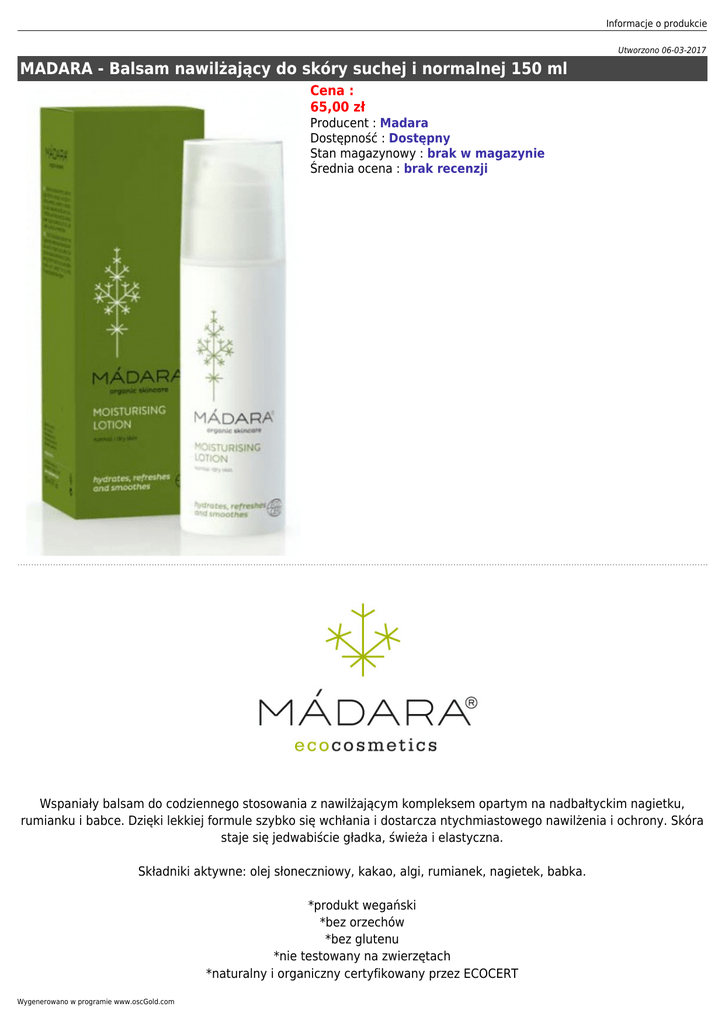 Informacje o produkcie Utworzono 06-03-2017 MADARA - Balsam nawilżający do skóry suchej i normalnej 150 ml Cena : 65,00 zł Producent : Madara Dostępność : Dostępny Stan magazynowy : brak w magazynie Średnia ocena : brak recenzji Wspaniały balsam do codziennego stosowania z nawilżającym kompleksem opartym na nadbałtyckim nagietku, rumianku i babce. Dzięki lekkiej formule szybko się wchłania i dostarcza ntychmiastowego nawilżenia i ochrony. Skóra staje się jedwabiście gładka, świeża i elastyczna. Składniki aktywne: olej słoneczniowy, kakao, algi, rumianek, nagietek, babka. *produkt wegański *bez orzechów *bez glutenu *nie testowany na zwierzętach *naturalny i organiczny certyfikowany przez ECOCERT Wygenerowano w programie www.oscGold.com Stosowanie: Nakładać na skórę całego ciała Skład: Aqua, Helianthus Annuus (Oil), Alcohol, Glycerin, Polyglyceryl-3, Methylglucose Distearate, Cetearyl Alcohol, Dicaprylyl Carbonate, Theobroma Cacao, Betain(-e), Algae, Calendula Officinalis, Chamomilla Recutita, Plantago Major, Stearic Acid, Tocopherol, Ascorbyl Palmitate, Xantan Gum, Lactic Acid, Aroma, Sodium phytate, Palmitic Acid.