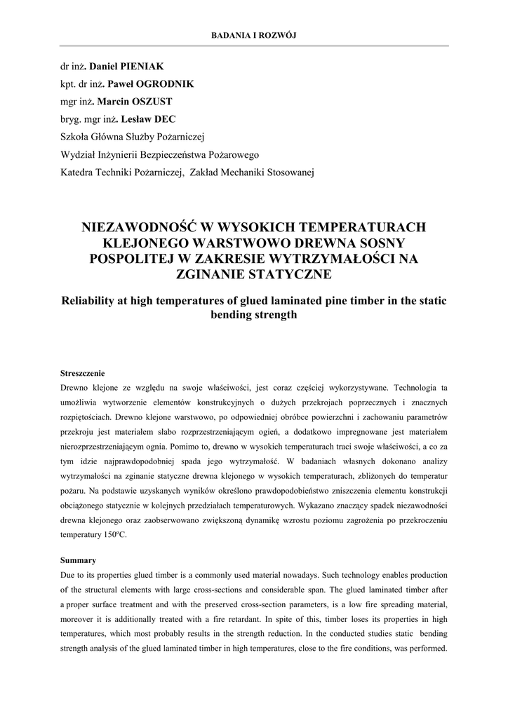 BADANIA I ROZWÓJ dr inż. Daniel PIENIAK kpt. dr inż. Paweł OGRODNIK mgr inż. Marcin OSZUST bryg. mgr inż. Lesław DEC Szkoła Główna Służby Pożarniczej Wydział Inżynierii Bezpieczeństwa Pożarowego Katedra Techniki Pożarniczej, Zakład Mechaniki Stosowanej NIEZAWODNOŚĆ W WYSOKICH TEMPERATURACH KLEJONEGO WARSTWOWO DREWNA SOSNY POSPOLITEJ W ZAKRESIE WYTRZYMAŁOŚCI NA ZGINANIE STATYCZNE Reliability at high temperatures of glued laminated pine timber in the static bending strength Streszczenie Drewno klejone ze względu na swoje właściwości, jest coraz częściej wykorzystywane. Technologia ta umożliwia wytworzenie elementów konstrukcyjnych o dużych przekrojach poprzecznych i znacznych rozpiętościach. Drewno klejone warstwowo, po odpowiedniej obróbce powierzchni i zachowaniu parametrów przekroju jest materiałem słabo rozprzestrzeniającym ogień, a dodatkowo impregnowane jest materiałem nierozprzestrzeniającym ognia. Pomimo to, drewno w wysokich temperaturach traci swoje właściwości, a co za tym idzie najprawdopodobniej spada jego wytrzymałość. W badaniach własnych dokonano analizy wytrzymałości na zginanie statyczne drewna klejonego w wysokich temperaturach, zbliżonych do temperatur pożaru. Na podstawie uzyskanych wyników określono prawdopodobieństwo zniszczenia elementu konstrukcji obciążonego statycznie w kolejnych przedziałach temperaturowych. Wykazano znaczący spadek niezawodności drewna klejonego oraz zaobserwowano zwiększoną dynamikę wzrostu poziomu zagrożenia po przekroczeniu temperatury 150ºC. Summary Due to its properties glued timber is a commonly used material nowadays. Such technology enables production of the structural elements with large cross-sections and considerable span. The glued laminated timber after a proper surface treatment and with the preserved cross-section parameters, is a low fire spreading material, moreover it is additionally treated with a fire retardant. In spite of this, timber loses its properties in high temperatures, which most probably results in the strength reduction. In the conducted studies static bending strength analysis of the glued laminated timber in high temperatures, close to the fire conditions, was performed. BADANIA I ROZWÓJ Based on the obtained results, probability of failure of the structural element statically loaded, in the subsequent temperature ranges, was estimated. A significant reliability decrease of the glued laminated timber and dynamic of the hazard level growth has been observed after exceeding 150ºC. Słowa kluczowe: drewno klejone, temperatury pożarowe, wytrzymałość na zginanie, niezawodność Keywords: glued timber, fire temperatures, bending strength, reliability 1. Wstęp Drewno budowlane ma korzystne właściwości fizyczne i technologiczne, wysoką wytrzymałość oraz niewielki ciężar własny. Wraz z pojawieniem się na rynku budowlanym wodoodpornych klejów na bazie żywic syntetycznych oraz zastosowanie prostego sposobu łączenia wzdłużnego za pomocą złączy klinowych, umożliwiających znacznie szybszy sposób budowania z wykorzystaniem klejonych elementów konstrukcyjnych o wymiarach większych niż naturalny produkt wyjściowy [1]. Drewno konstrukcyjne klejone warstwowo jest materiałem coraz częściej stosowanym w budownictwie. Począwszy od budowy domów jednorodzinnych i wielorodzinnych oraz obiektów wielkogabarytowych typu hale produkcyjne, handlowe, sportowe, baseny, kończąc na mostach jednoprzęsłowych i obiektach małej architektury. Do produkcji elementów z drewna klejonego najczęściej stosowanym gatunkiem drewna jest sosna oraz świerk rzadziej modrzew. Podstawowym klejem stosowanym do produkcji tego typu drewna jest klej melaminowy który jest odporny na działanie wody i ognia. Alternatywnym rozwiązaniem jest klej rezorcynowy który jest szczególnie odporny na działanie wilgoci. Obydwa rodzaje klejów nie wydzielają żadnych szkodliwych substancji nawet podczas pożaru [2]. W zależności od wytrzymałości charakterystycznej na zginanie drewno klejone zostało podzielone na 4 klasy od GL24 do GL36. Wytrzymałościowe sortowanie tarcicy budowlanokonstrukcyjnej zgodnie z wymaganiami normowymi (PN-D-91024:1982 [3]) odbywa się wizualnie (dla klas GL24 oraz GL28) oraz mechanicznie dla klas wyższych (GL32 oraz GL36). Taki sposób sortowania powoduje, że najbardziej dostępnymi klasami jest GL24 oraz GL28 (PN-EN 1194:2000 [4]). Drewno klejone warstwowo, po zapewnieniu odpowiednich warunków takich jak fazowane krawędzie oraz strugana powierzchnia, jest materiałem odpornym na działanie BADANIA I ROZWÓJ ognia. Zgodnie z wytycznymi Instytutu Techniki Budowlanej elementy tego typu przy szerokości poniżej 12 cm, klasyfikuje się jako SRO (słabo rozprzestrzeniające ogień). Przy szerokości przekraczającej 12 cm lub poniżej 12 cm przy dodatkowej impregnacji środkiem ogniochronnym jako elementy NRO (nierozprzestrzeniające ognia). Odporność ogniową w zakresie od R15 do R60 w drewnie klejonym uzyskuje się na etapie projektowania poprzez odpowiednią analizę statyczną oraz dobór przekrojów [2]. Wykonywane dotychczas przez autorów próby na typowych stanowiskach wytrzymałościowych z wstępnym nagrzaniem próbek w piecu a następnie z przenoszeniem na stanowisko badawcze powodowały spadek temperatury podczas przenoszenia próbek, a co za tym idzie duże rozrzuty wyników badań wytrzymałości. W związku z tym w Zakładzie Mechaniki Stosowanej Szkoły Głównej Służby Pożarniczej w Warszawie w ramach pracy statutowej zaprojektowano i zbudowano stanowisko do badań wytrzymałościowych z możliwością ogrzewania próbek bezpośrednio na stanowisku przy jednoczesnej realizacji obciążenia statycznego. Celem badań wykonanych na tym stanowisku było określenie wpływu podwyższonych temperatur na wytrzymałość drewna klejonego warstwowo. Ponadto, uzyskane wyniki badań wytrzymałości posłużyły do przep