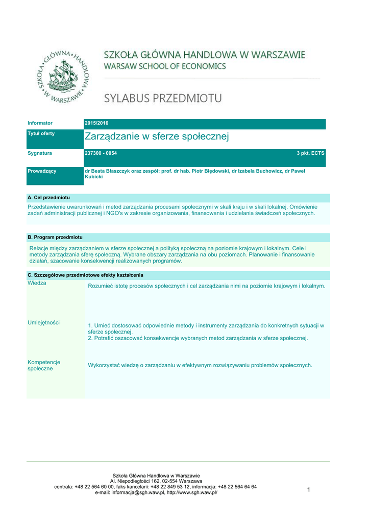 Informator 2015/2016 7\WXáRIHUW\ =DU]ąG]DQLHZVIHU]HVSRáHF]QHM Sygnatura 237300 - 0054 3URZDG]ąF\ GU%HDWD%áDV]F]\NRUD]]HVSyáSURIGUKDE3LRWU%áĊGRZVNLGU,]DEHOD%XFKRZLF]GU3DZHá Kubicki 3 pkt. ECTS A. Cel przedmiotu 3U]HGVWDZLHQLHXZDUXQNRZDĔLPHWRG]DU]ąG]DQLDSURFHVDPLVSRáHF]Q\PLZVNDOLNUDMXLZVNDOLORNDOQHM2PyZLHQLH ]DGDĔDGPLQLVWUDFMLSXEOLF]QHML1*2 VZ]DNUHVLHRUJDQL]RZDQLDILQDQVRZDQLDLXG]LHODQLDĞZLDGF]HĔVSRáHF]Q\FK B. Program przedmiotu 5HODFMHPLĊG]\]DU]ąG]DQLHPZVIHU]HVSRáHF]QHMDSROLW\NąVSRáHF]QąQDSR]LRPLHNUDMRZ\PLORNDOQ\P&HOHL PHWRG\]DU]ąG]DQLDVIHUĊVSRáHF]Qą:\EUDQHREV]DU\]DU]ąG]DQLDQDREXSR]LRPDFK3ODQRZDQLHLILQDQVRZDQLH G]LDáDĔV]DFRZDQLHNRQVHNZHQFMLUHDOL]RZDQ\FKSURJUDPyZ &6]F]HJyáRZHSU]HGPLRWRZHHIHNW\NV]WDáFHQLD Wiedza 5R]XPLHüLVWRWĊSURFHVyZVSRáHF]Q\FKLFHO]DU]ąG]DQLDQLPLQDSR]LRPLHNUDMRZ\PLORNDOQ\P 8PLHMĊWQRĞFL Kompetencje VSRáHF]QH 18PLHüGRVWRVRZDüRGSRZLHGQLHPHWRG\LLQVWUXPHQW\]DU]ąG]DQLDGRNRQNUHWQ\FKV\WXDFMLZ VIHU]HVSRáHF]QHM 23RWUDILüRV]DFRZDüNRQVHNZHQFMHZ\EUDQ\FKPHWRG]DU]ąG]DQLDZVIHU]HVSRáHF]QHM :\NRU]\VWDüZLHG]ĊR]DU]ąG]DQLXZHIHNW\ZQ\PUR]ZLą]\ZDQLXSUREOHPyZVSRáHF]Q\FK 6]NRáD*áyZQD+DQGORZDZ:DUV]DZLH $O1LHSRGOHJáRĞFL162, 02-554 Warszawa centrala: +48 22 564 60 00, faks kancelarii: +48 22 849 53 12, informacja: +48 22 564 64 64 e-mail: [email protected], http://www.sgh.waw.pl/ 1 FG=DU]ąG]DQLHZVIHU]HVSRáHF]QHM '6HPHVWUDOQ\SODQ]DMĊü 1 6IHUDVSRáHF]QDSRGVWDZRZHFHFK\3RGPLRW\G]LDáDMąFHZVIHU]HVSRáHF]QHMVWUXNWXUDL ]DNUHV]DGDĔ3ROLW\NDVSRáHF]QDD]DU]ąG]DQLHVIHUąVSRáHF]Qą 2 ,VWRWDSURFHVyZVSRáHF]Q\FKFHOHLRJUDQLF]HQLDVWHURZDQLDQLPL=DU]ąGDQLHZVIHU]H VSRáHF]QHMFKDUDNWHU\VW\NDFHOyZLPHWRG 3 =DU]ąG]DQLHVIHUąVSRáHF]QąZVNDOLNUDMXLZVNDOLORNDOQHM.UDMRZDLORNDOQDSROLW\NDVSRáHF]QD - relacje i struktura celów. 4 3ODQRZDQLHVSRáHF]QHFHOHLPHWRG\=DU]ąG]DQLHXVáXJDPLVSRáHF]Q\PL 5 =DU]ąG]DQLHU\QNLHPSUDF\ZVNDOLNUDMXLUHJLRQDOQHM 6 $NW\ZQDSROLW\NDU\QNXSUDF\ZVNDOLORNDOQHM=DU]ąG]DQLHORNDOQ\PU\QNLHPSUDF\SRGPLRW\ metody i instrumenty. 7 (GXNDFMDZV\VWHPLHXVáXJVSRáHF]Q\FK6\VWHPHGXNDFMLDLQQHV\VWHP\SROLW\NLVSRáHF]QHM 8 =DU]ąG]DQLHHGXNDFMąSRSU]H]FHOH=DU]ąG]DQLHU\QNLHPXVáXJHGXNDF\MQ\FK 9 %H]SLHF]HĔVWZR]GURZRWQHVSRáHF]HĔVWZD6WUXNWXUD]DGDĔDGPLQLVWUDFMLSXEOLF]QHMZRFKURQLH zdrowia. 10 =DU]ąG]DQLHXVáXJDPLVSRáHF]Q\PLZREV]DU]H]DSRELHJDQLDZ\NOXF]HQLXVSRáHF]QHPX 11 =DU]ąG]DQLHRFKURQą]GURZLDQDSR]LRPLHORNDOQ\PFHOHLLQVWUXPHQW\ 12 =DU]ąG]DQLHMDNRĞFLąĞZLDGF]HĔVSRáHF]Q\FK.RQWURODĞZLDGF]HĔLHZDOXDFMDSURJUDPyZ 13 :VSyáSUDFDSRGPLRWyZ]DU]ąG]DMąF\FK]RUJDQL]DFMDPLSR]DU]ąGRZ\PL 14 )LQDQVRZDQLHG]LDáDĔZVIHU]HVSRáHF]QHM 15 'REUHSUDNW\NLZ]DNUHVLH]DU]ąG]DQLDVIHUąVSRáHF]QąZNUDMXL]DJUDQLFą (/LWHUDWXUDSRGVWDZRZDRERZLą]NRZHSRGUĊF]QLNL =DU]ąG]DQLHSXEOLF]QHZORNDOQHMSROLW\FHVSRáHF]QHMUHG$)UąF]NLHZLF]:URQND:63:DUV]DZD2007;=DU]ąG]DQLH SXEOLF]QHHOHPHQW\WHRULLLSUDNW\NLUHG$)UąF]NLHZLF]:URQND:63:DUV]DZD2009. )/LWHUDWXUDX]XSHáQLDMąFD $)UąF]NLHZLF]:URQND=DU]ąG]DQLHSXEOLF]QHZWHRULLLSUDNW\FHRFKURQ\]GURZLD:ROWHU.OXZHU:DUV]DZD *1DMZDĪQLHMV]HSXEOLNDFMHDXWRUDyZGRW\F]ąFHSURSRQRZDQ\FK]DMĊü 3%áĊGRZVNL3.XELFNL6DPRU]ąGORNDOQ\ZREHFXEyVWZDLZ\NOXF]HQLDVSRáHF]QHJRZ3DĔVWZRVDPRU]ąG\ RUJDQL]DFMHSR]DU]ąGRZHLZVSyOQRW\ORNDOQHZREHFXEyVWZDLZ\NOXF]HQLDVSRáHF]QHJRUHG3%URGD:\VRFNL3ROVND Bieda III, IPiSS, Warszawa 2007;0LĊG]\WUDQVIRUPDFMąDLQWHJUDFMą3ROLW\NDVSRáHF]QDZREHFSUREOHPyZ ZVSyáF]HVQRĞFLUHG3%áĊGRZVNL6*+:DUV]DZD2004. H. Sygnatury wymaganych prerekwizytów QLHVąZ\PDJDQH 6]NRáD*áyZQD+DQGORZDZ:DUV]DZLH $O1LHSRGOHJáRĞFL162, 02-554 Warszawa centrala: +48 22 564 60 00, faks kancelarii: +48 22 849 53 12, informacja: +48 22 564 64 64 e-mail: [email protected], http://www.sgh.waw.pl/ 2 FG=DU]ąG]DQLHZVIHU]HVSRáHF]QHM ,:\PLDULIRUPD]DMĊü Stacj. Sob. niedz. 3RSRáXG 2JyáHP 30 14 30 :\NáDG 30 14 30 -(OHPHQW\RFHQ\NRĔFRZHM egzamin tradycyjny 50% egzamin testowy 50% .:\PDJDQD]QDMRPRĞüMĊ]\NDREFHJR nie jest wymagana L. Kryteria selekcji 00HWRG\SURZDG]HQLD]DMĊü :\NáDG 6]NRáD*áyZQD+DQGORZDZ:DUV]DZLH $O1LHSRGOHJáRĞFL162, 02-554 Warszawa centrala: +48 22 564 60 00, faks kancelarii: +48 22 849 53 12, informacja: +48 22 564 64 64 e-mail: [email protected], http://www.sgh.waw.pl/ 3