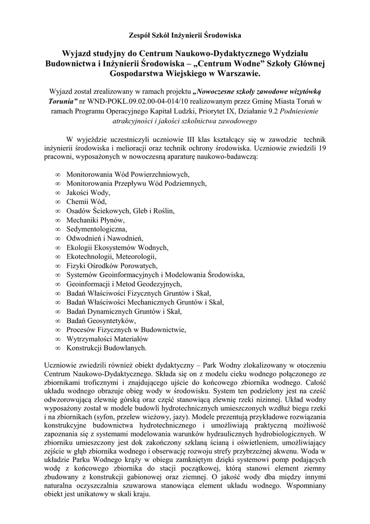 Zespół Szkół Inżynierii Środowiska Wyjazd studyjny do Centrum Naukowo-Dydaktycznego Wydziału Budownictwa i Inżynierii Środowiska – „Centrum Wodne” Szkoły Głównej Gospodarstwa Wiejskiego w Warszawie. Wyjazd został zrealizowany w ramach projektu „Nowoczesne szkoły zawodowe wizytówką Torunia” nr WND-POKL.09.02.00-04-014/10 realizowanym przez Gminę Miasta Toruń w ramach Programu Operacyjnego Kapitał Ludzki, Priorytet IX, Działanie 9.2 Podniesienie atrakcyjności i jakości szkolnictwa zawodowego W wyjeździe uczestniczyli uczniowie III klas kształcący się w zawodzie technik inżynierii środowiska i melioracji oraz technik ochrony środowiska. Uczniowie zwiedzili 19 pracowni, wyposażonych w nowoczesną aparaturę naukowo-badawczą: • • • • • • • • • • • • • • • • • • • • Monitorowania Wód Powierzchniowych, Monitorowania Przepływu Wód Podziemnych, Jakości Wody, Chemii Wód, Osadów Ściekowych, Gleb i Roślin, Mechaniki Płynów, Sedymentologiczna, Odwodnień i Nawodnień, Ekologii Ekosystemów Wodnych, Ekotechnologii, Meteorologii, Fizyki Ośrodków Porowatych, Systemów Geoinformacyjnych i Modelowania Środowiska, Geoinformacji i Metod Geodezyjnych, Badań Właściwości Fizycznych Gruntów i Skał, Badań Właściwości Mechanicznych Gruntów i Skał, Badań Dynamicznych Gruntów i Skał, Badań Geosyntetyków, Procesów Fizycznych w Budownictwie, Wytrzymałości Materiałów Konstrukcji Budowlanych. Uczniowie zwiedzili również obiekt dydaktyczny – Park Wodny zlokalizowany w otoczeniu Centrum Naukowo-Dydaktycznego. Składa się on z modelu cieku wodnego połączonego ze zbiornikami troficznymi i znajdującego ujście do końcowego zbiornika wodnego. Całość układu wodnego obrazuje obieg wody w środowisku. System ten podzielony jest na cześć odwzorowującą zlewnię górską oraz część stanowiącą zlewnię rzeki nizinnej. Układ wodny wyposażony został w modele budowli hydrotechnicznych umieszczonych wzdłuż biegu rzeki i na zbiornikach (syfon, przelew wieżowy, jazy). Modele prezentują przykładowe rozwiązania konstrukcyjne budownictwa hydrotechnicznego i umożliwiają praktyczną możliwość zapoznania się z systemami modelowania warunków hydraulicznych hydrobiologicznych. W zbiorniku umieszczony jest dok zakończony szklaną ścianą i oświetleniem, umożliwiający zejście w głąb zbiornika wodnego i obserwację rozwoju strefy przybrzeżnej akwenu. Woda w układzie Parku Wodnego krąży w obiegu zamkniętym dzięki systemowi pomp podających wodę z końcowego zbiornika do stacji początkowej, którą stanowi element ziemny zbudowany z konstrukcji gabionowej oraz ziemnej. O jakość wody dba między innymi naturalna oczyszczalnia szuwarowa stanowiąca element układu wodnego. Wspomniany obiekt jest unikatowy w skali kraju.