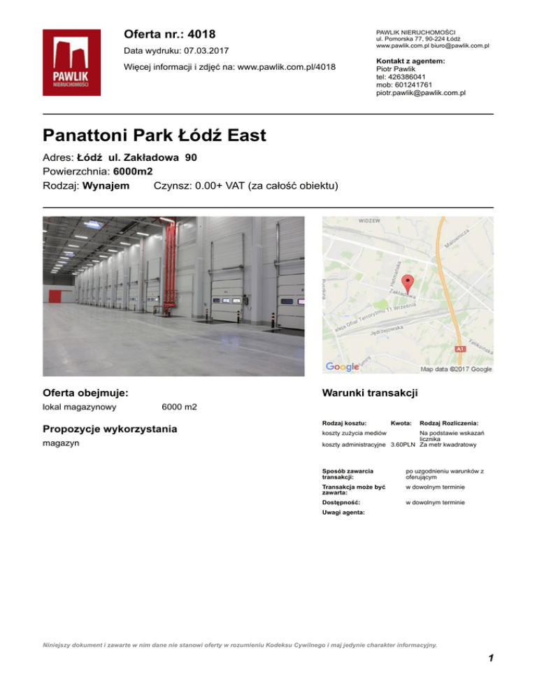 Oferta nr.: 4018 PAWLIK NIERUCHOMOŚCI ul. Pomorska 77, 90-224 Łódź www.pawlik.com.pl [email protected] Data wydruku: 07.03.2017 Więcej informacji i zdjęć na: www.pawlik.com.pl/4018 Kontakt z agentem: Piotr Pawlik tel: 426386041 mob: 601241761 [email protected] Panattoni Park Łódź East Adres: Łódź ul. Zakładowa 90 Powierzchnia: 6000m2 Rodzaj: Wynajem Czynsz: 0.00+ VAT (za całość obiektu) Oferta obejmuje: lokal magazynowy Warunki transakcji 6000 m2 Propozycje wykorzystania magazyn Rodzaj kosztu: Kwota: Rodzaj Rozliczenia: koszty zużycia mediów Na podstawie wskazań licznika koszty administracyjne 3.60PLN Za metr kwadratowy Sposób zawarcia transakcji: po uzgodnieniu warunków z oferującym Transakcja może być zawarta: w dowolnym terminie Dostępność: w dowolnym terminie Uwagi agenta: Niniejszy dokument i zawarte w nim dane nie stanowi oferty w rozumieniu Kodeksu Cywilnego i maj jedynie charakter informacyjny. 1 Oferta nr.: 4018 Więcej informacji i zdjęć na: www.pawlik.com.pl/4018 Opis oferty Powierzchnia magazynowa w Panattoni Park Łódź East. Nowoczesny obiekt magazynowy wysokości 10 m, wyposażony w 7 doków rozładunkowych oraz dostęp z poziomu "0". Możliwość wykonania dowolnej wielkości powierzchni biurowej. Możliwość najmu powierzchni mniejszej bądź większej. Zachęcam do kontaktu. Na indywidualne zapytanie przygotujemy dla Państwa bardzo atrakcyjną ofertę cenową. Oferta obejmuje lokal magazynowy Klasa obiektu: A Powierzchnia: 6000 m2 Kondygnacja: Parter z parterowy Stan techniczny: bardzo dobry Rodzaje powierzchni użytkowych Kondygnacja Rodzaj powierzchni Powierzchnia Liczba pomieszczeń Parter magazynowy 6000.00 m2 1 Kondygnacja Charakter powierzchni Powierzchnia Podłoga Parter magazynowy 6000.00 m2 Standard Ściana beton niepylny modułowa Sufit Okna bez wykończenia świetliki dachowe Stan techniczny Budynek Rok budowy Opis techniczny Konstrukcja budynku: stalowa Strop: Kondygnacja Rodzaj powierzchni Powierzchnia Wysokość Siatka słupów Parter magazynowy 6000.00 m2 10.00 225.00 m x 120.00 m Dostęp Rodzaj wrót Strop Wyposażenie Liczba Szerokość wrota towarowe z poziomu "0" 2 0.00 m dok rozładunkowy 7 0.00 m Wysokość 0.00 m 0.00 m Bezpieczeństwo Ochrona fizyczna P-poż Teleinformatyka Ogrzewanie/klimatyzacja Dojazd TIR Ogrzewanie plac manewrowy Parking Niniejszy dokument i zawarte w nim dane nie stanowi oferty w rozumieniu Kodeksu Cywilnego i maj jedynie charakter informacyjny. 2 Oferta nr.: 4018 Więcej informacji i zdjęć na: www.pawlik.com.pl/4018 Media Toaleta Położenie w lokalu Droga utwardzona? Tak Przyłącza elektryczne Instalacja elektryczna Instalacja siłowa Przylącza gazowe Przyłącze wodne Instalacja wodno-kanalizacyjna ZDJĘCIA OFERTY Niniejszy dokument i zawarte w nim dane nie stanowi oferty w rozumieniu Kodeksu Cywilnego i maj jedynie charakter informacyjny. 3