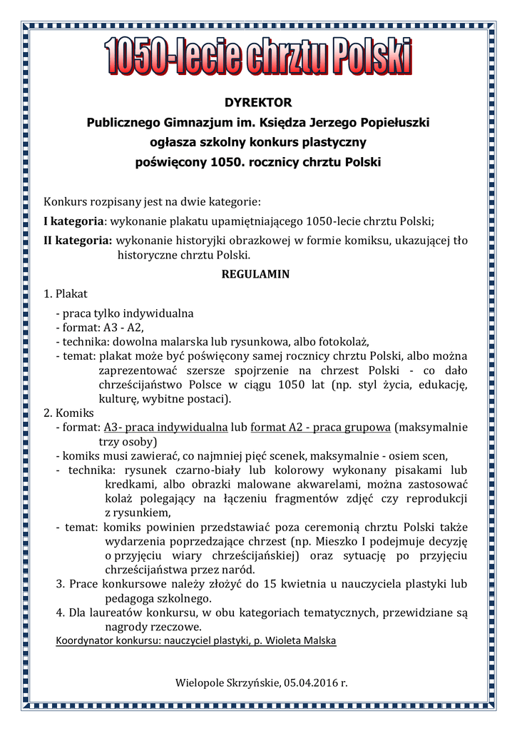 DYREKTOR Publicznego Gimnazjum im. Księdza Jerzego Popiełuszki ogłasza szkolny konkurs plastyczny poświęcony 1050. rocznicy chrztu Polski Konkurs rozpisany jest na dwie kategorie: I kategoria: wykonanie plakatu upamiętniającego 1050-lecie chrztu Polski; II kategoria: wykonanie historyjki obrazkowej w formie komiksu, ukazującej tło historyczne chrztu Polski. REGULAMIN 1. Plakat - praca tylko indywidualna - format: A3 - A2, - technika: dowolna malarska lub rysunkowa, albo fotokolaż, - temat: plakat może być poświęcony samej rocznicy chrztu Polski, albo można zaprezentować szersze spojrzenie na chrzest Polski - co dało chrześcijaństwo Polsce w ciągu 1050 lat (np. styl życia, edukację, kulturę, wybitne postaci). 2. Komiks - format: A3- praca indywidualna lub format A2 - praca grupowa (maksymalnie trzy osoby) - komiks musi zawierać, co najmniej pięć scenek, maksymalnie - osiem scen, - technika: rysunek czarno-biały lub kolorowy wykonany pisakami lub kredkami, albo obrazki malowane akwarelami, można zastosować kolaż polegający na łączeniu fragmentów zdjęć czy reprodukcji z rysunkiem, - temat: komiks powinien przedstawiać poza ceremonią chrztu Polski także wydarzenia poprzedzające chrzest (np. Mieszko I podejmuje decyzję o przyjęciu wiary chrześcijańskiej) oraz sytuację po przyjęciu chrześcijaństwa przez naród. 3. Prace konkursowe należy złożyć do 15 kwietnia u nauczyciela plastyki lub pedagoga szkolnego. 4. Dla laureatów konkursu, w obu kategoriach tematycznych, przewidziane są nagrody rzeczowe. Koordynator konkursu: nauczyciel plastyki, p. Wioleta Malska Wielopole Skrzyńskie, 05.04.2016 r.