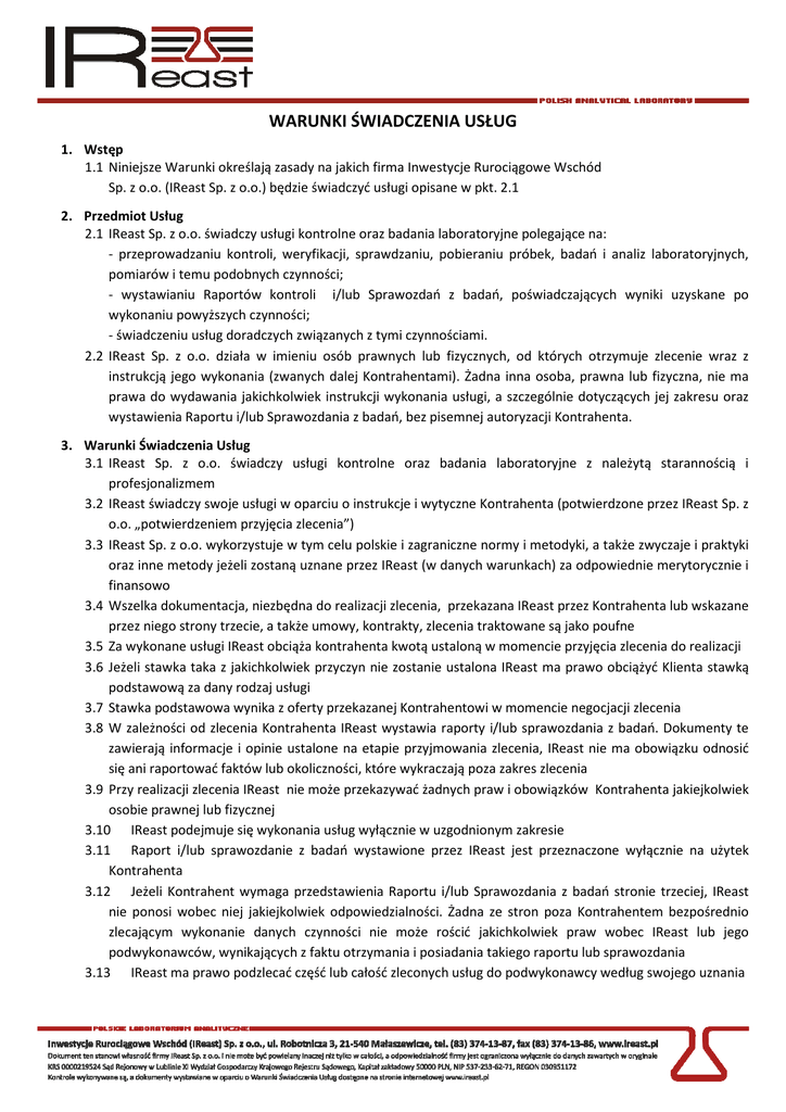 WARUNKI ŚWIADCZENIA USŁUG 1. Wstęp 1.1 Niniejsze Warunki określają zasady na jakich firma Inwestycje Rurociągowe Wschód Sp. z o.o. (IReast Sp. z o.o.) będzie świadczyć usługi opisane w pkt. 2.1 2. Przedmiot Usług 2.1 IReast Sp. z o.o. świadczy usługi kontrolne oraz badania laboratoryjne polegające na: - przeprowadzaniu kontroli, weryfikacji, sprawdzaniu, pobieraniu próbek, badań i analiz laboratoryjnych, pomiarów i temu podobnych czynności; - wystawianiu Raportów kontroli i/lub Sprawozdań z badań, poświadczających wyniki uzyskane po wykonaniu powyższych czynności; - świadczeniu usług doradczych związanych z tymi czynnościami. 2.2 IReast Sp. z o.o. działa w imieniu osób prawnych lub fizycznych, od których otrzymuje zlecenie wraz z instrukcją jego wykonania (zwanych dalej Kontrahentami). Żadna inna osoba, prawna lub fizyczna, nie ma prawa do wydawania jakichkolwiek instrukcji wykonania usługi, a szczególnie dotyczących jej zakresu oraz wystawienia Raportu i/lub Sprawozdania z badań, bez pisemnej autoryzacji Kontrahenta. 3. Warunki Świadczenia Usług 3.1 IReast Sp. z o.o. świadczy usługi kontrolne oraz badania laboratoryjne z należytą starannością i profesjonalizmem 3.2 IReast świadczy swoje usługi w oparciu o instrukcje i wytyczne Kontrahenta (potwierdzone przez IReast Sp. z o.o. „potwierdzeniem przyjęcia zlecenia”) 3.3 IReast Sp. z o.o. wykorzystuje w tym celu polskie i zagraniczne normy i metodyki, a także zwyczaje i praktyki oraz inne metody jeżeli zostaną uznane przez IReast (w danych warunkach) za odpowiednie merytorycznie i finansowo 3.4 Wszelka dokumentacja, niezbędna do realizacji zlecenia, przekazana IReast przez Kontrahenta lub wskazane przez niego strony trzecie, a także umowy, kontrakty, zlecenia traktowane są jako poufne 3.5 Za wykonane usługi IReast obciąża kontrahenta kwotą ustaloną w momencie przyjęcia zlecenia do realizacji 3.6 Jeżeli stawka taka z jakichkolwiek przyczyn nie zostanie ustalona IReast ma prawo obciążyć Klienta stawką podstawową za dany rodzaj usługi 3.7 Stawka podstawowa wynika z oferty przekazanej Kontrahentowi w momencie negocjacji zlecenia 3.8 W zależności od zlecenia Kontrahenta IReast wystawia raporty i/lub sprawozdania z badań. Dokumenty te zawierają informacje i opinie ustalone na etapie przyjmowania zlecenia, IReast nie ma obowiązku odnosić się ani raportować faktów lub okoliczności, które wykraczają poza zakres zlecenia 3.9 Przy realizacji zlecenia IReast nie może przekazywać żadnych praw i obowiązków Kontrahenta jakiejkolwiek osobie prawnej lub fizycznej 3.10 IReast podejmuje się wykonania usług wyłącznie w uzgodnionym zakresie 3.11 Raport i/lub sprawozdanie z badań wystawione przez IReast jest przeznaczone wyłącznie na użytek Kontrahenta 3.12 Jeżeli Kontrahent wymaga przedstawienia Raportu i/lub Sprawozdania z badań stronie trzeciej, IReast nie ponosi wobec niej jakiejkolwiek odpowiedzialności. Żadna ze stron poza Kontrahentem bezpośrednio zlecającym wykonanie danych czynności nie może rościć jakichkolwiek praw wobec IReast lub jego podwykonawców, wynikających z faktu otrzymania i posiadania takiego raportu lub sprawozdania 3.13 IReast ma prawo podzlecać część lub całość zleconych usług do podwykonawcy według swojego uznania 4. Obowiązki Kontrahenta 4.1 Kontrahent udzieli wszelkich wymaganych informacji dotyczących zakresu zlecenia z odpowiednim wyprzedzeniem czasowym, co umożliwi bezkonfliktową jego realizację 4.2 Kontrahent zapewni dostęp przedstawicielom IReast do towaru i/lub środków transportu, w zależności od zakresu zlecenia, w celu jego sprawnej realizacji zlecenia 4.3 Kontrahent podejmie niezbędne kroki eliminujące ewentualne przeszkody lub przerwy mogące wpłynąć na czas realizacji zlecenia 4.4 Kontrahent ma obowiązek powiadomić IReast, w trakcie uzgodnień, co do zakresu zlecenia, o wszelkich zagrożeniach występujących lub mogących wystąpić podczas realizacji zlecenia, w szczególności o: radioaktywności, materiałach toksycznych, wybuchowych, zagrożeniach środowiskowych, zdrowotnych oraz wymaganiach formalno-prawnych, które mogłyby lub mogą mieć wpływ na zachowanie przedstawicieli IReast lub na wykonywaną przez nich pracę 4.5 Kontrahent zobowiązuje się do realizacji płatności w terminie, o ile w trakcie ustalania warunków realizacji zlecenia termin ten nie został określony inaczej, 14 dni od daty wystawienia faktury. 4.6 IReast ma prawo naliczania odsetek karnych do płatności opóźnionych 4.7 W przypadku, gdy kontynuacja lub ukończenie zlecenia przez IReast zostanie uniemożliwione z przyczyn od niego niezależnych, Kontrahent wypłaci wynagrodzenie proporcjonalne do nakładu pracy wykonanej przed jej zawieszeniem. W takim przypadku IReast będzie zwolniona z odpowiedzialności za nieukończenie zlecenia. 5. Odpowiedzialność IReast Sp. z o.o. 5.1 IReast Sp. z o.o. zobowiązuje się zachować należytą staranność i umiejętności przy realizacji usług i zgadza się ponieść odpowiedzialność wyłącznie w przypadkach udowodnionego zaniedbania 5.2 Odpowiedzialność IReast odnosić się będzie do zakresu reklamacji związanej ze stratą Kontrahenta powstałą w sposób pośredni lub bezpośredni w związku z wykonywaną usługą 5.3 Wysokość uznania w żadnym przypadku nie przekroczy kwoty wynagrodzenia ustalonego za usługę objętą reklamacją 5.4 IReast nie ponosi odpowiedzialności za jakiekolwiek inne reklamacje mające związek z usługą, a spowodowane przez strony trzecie, 5.5 IReast nie jest ubezpieczycielem ani gwarantem jakości lub ilości kontrolowanych lub badanych towarów, wyrobów i materiałów oraz nie ponosi jakiejkolwiek odpowiedzialności w tej mierze. Kontrahent zainteresowany zabezpieczeniem przed ewentualną utratą wartości towaru lub jego zniszczeniem/uszkodzeniem winien wystąpić o stosowne ubezpieczenie swojej transakcji handlowej. 6. 