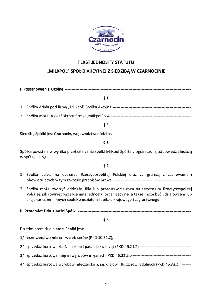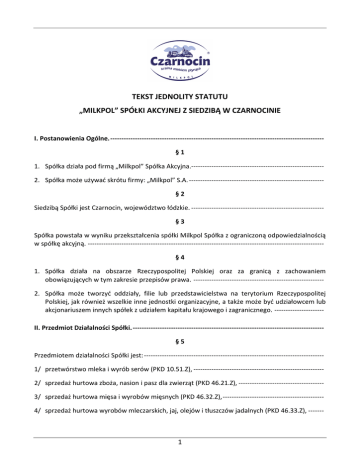 TEKST JEDNOLITY STATUTU „MILKPOL” SPÓŁKI AKCYJNEJ Z SIEDZIBĄ W CZARNOCINIE I. Postanowienia Ogólne.----------------------------------------------------------------------------------------------§1 1. Spółka działa pod firmą „Milkpol” Spółka Akcyjna.----------------------------------------------------------2. Spółka może używać skrótu firmy: „Milkpol” S.A. -----------------------------------------------------------§2 Siedzibą Spółki jest Czarnocin, województwo łódzkie. ----------------------------------------------------------§3 Spółka powstała w wyniku przekształcenia spółki Milkpol Spółka z ograniczoną odpowiedzialnością w spółkę akcyjną. --------------------------------------------------------------------------------------------------------§4 1. Spółka działa na obszarze Rzeczypospolitej Polskiej oraz za granicą z zachowaniem obowiązujących w tym zakresie przepisów prawa. ---------------------------------------------------------2. Spółka może tworzyć oddziały, filie lub przedstawicielstwa na terytorium Rzeczypospolitej Polskiej, jak również wszelkie inne jednostki organizacyjne, a także może być udziałowcem lub akcjonariuszem innych spółek z udziałem kapitału krajowego i zagranicznego. ---------------------II. Przedmiot Działalności Spółki. ------------------------------------------------------------------------------------§5 Przedmiotem działalności Spółki jest: -------------------------------------------------------------------------------1/ przetwórstwo mleka i wyrób serów (PKD 10.51.Z), ---------------------------------------------------------2/ sprzedaż hurtowa zboża, nasion i pasz dla zwierząt (PKD 46.21.Z), -------------------------------------3/ sprzedaż hurtowa mięsa i wyrobów mięsnych (PKD 46.32.Z),--------------------------------------------4/ sprzedaż hurtowa wyrobów mleczarskich, jaj, olejów i tłuszczów jadalnych (PKD 46.33.Z), ------- 1 5/ sprzedaż detaliczna w nie wyspecjalizowanych sklepach z przewagą żywności, napojów i wyrobów tytoniowych (PKD 47.11.Z), --------------------------------------------------------------------------6/ sprzedaż detaliczna wyrobów mlecznych i jaj w wyspecjalizowanych sklepach (PKD 47.29.Z),---7/ transport drogowy towarów (PKD 49.41.Z). ------------------------------------------------------------------III. Kapitał Spółki. --------------------------------------------------------------------------------------------------------§6 Kapitał zakładowy spółki wynosi 1.060.350 zł (jeden milion sześćdziesiąt tysięcy trzysta pięćdziesiąt ) złotych i dzieli się na: --------------------------------------------------------------------------------------------------a) 1 000 000 (jeden milion) akcji na okaziciela serii A od numeru 0000001 do numeru 1000000 o wartości nominalnej 1 złoty (jeden złoty) każda, ------------------------------------------------------------b) 60.350 (sześćdziesiąt tysięcy trzysta pięćdziesiąt) akcji na okaziciela serii B od numeru 0000001 do numeru 60.350 o wartości nominalnej 1 złoty (jeden złoty) każda.---------------------------------§7 1. Akcje Spółki mogą być umorzone za zgodą akcjonariusza (umorzenie dobrowolne).---------------2. Umorzenie dobrowolne następuje poprzez nabycie przez Spółkę akcji własnych w celu umorzenia.------------------------------------------------------------------------------------------------------------3. Nabycie przez spółkę akcji własnych w celu umorzenia może nastąpić na wniosek akcjonariusza jak również na wniosek Spółki.-----------------------------------------------------------------------------------4. Zarząd Spółki jest zobowiązany do niezwłocznego zwołania Walnego Zgromadzenia i umieszczenia w jego porządku obrad punktów umożliwiających umorzenie akcji. -----------------§8 1. Spółka może podwyższyć kapitał akcyjny w drodze emisji nowych akcji, których cenę oraz termin otwarcia i zamknięcia subskrypcji może oznaczyć Rada Nadzorcza, uprawniona przez Walne Zgromadzenie Akcjonariuszy. ---------------------------------------------------------------------------Podwyższenie kapitału akcyjnego może nastąpić również poprzez podwyższenie wartości nominalnej akcji. ----------------------------------------------------------------------------------------------------2. Akcje z nowej emisji mogą być także objęte poprzez ich publiczną subskrypcję. --------------------3. Na żądanie akcjonariusza akcje na okaziciela mogą zostać zamienione na akcje imienne, jak również akcje imienne mogą za zgodą Rady Nadzorczej zamienione na akcje na okaziciela. -----IV. Organy Spółki. -------------------------------------------------------------------------------------------------------§9 Organami Spółki są: ------------------------------------------------------------------------------------------------------ 2 1. Zarząd Spółki. ------------------------------------------------------------------------------------------------------2. Rada Nadzorcza. --------------------------------------------------------------------------------------------------3. Walne Zgromadzenie. -------------------------------------------------------------------------------------------A. ZARZĄD SPÓŁKI § 10 1. Zarząd Spółki liczy od jednej do trzech osób powoływanych i odwoływanych przez Walne Zgromadzenie, na okres 3 letniej kadencji. -------------------------------------------------------------------2. Każdy członek zarządu ma prawo i obowiązek prowadzenia spraw spółki.----------------------------3. Członek Zarządu nie może bez zezwolenia Rady Nadzorczej zajmować się interesami konkurencyjnymi ani też uczestniczyć w Spółce konkurencyjnej jako wspólnik jawny lub członek władz. ------------------------------------------------------------------------------------------------------------------4. W przypadku zarządu wieloos