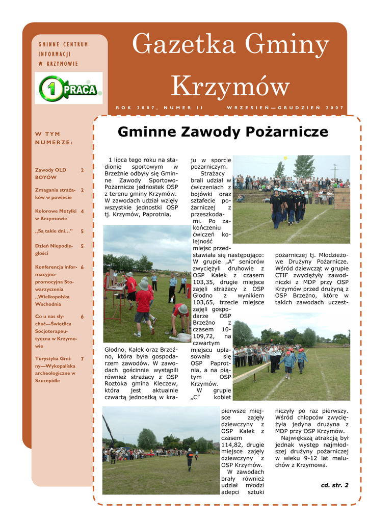 Gazetka Gminy GMINNE CENTRUM INFORMACJI W KRZYMOWIE Krzymów R O K 2 0 0 7 , N U M E R W R Z E S I E Ń — G R U D Z I E Ń 2 0 0 7 Gminne Zawody PoŜarnicze W TYM NUMERZE: Zawody OLD BOYÓW 2 Zmagania straŜaków w powiecie 2 Kolorowe Motylki 4 w Krzymowie „Są takie dni…” 5 Dzień Niepodległości 5 1 lipca tego roku na stadionie sportowym w Brzeźnie odbyły się Gminne Zawody SportowoPoŜarnicze jednostek OSP z terenu gminy Krzymów. W zawodach udział wzięły wszystkie jednostki OSP tj. Krzymów, Paprotnia, Konferencja infor- 6 macyjnopromocyjna Stowarzyszenia „Wielkopolska Wschodnia Co u nas sły6 chać—Świetlica Socjoterapeutyczna w Krzymowie Turystyka Gminy—Wykopaliska archeologiczne w Szczepidle I I 7 Głodno, Kałek oraz Brzeźno, która była gospodarzem zawodów. W zawodach gościnnie wystąpili równieŜ straŜacy z OSP Roztoka gmina Kleczew, która jest aktualnie czwartą jednostką w kra- ju w sporcie poŜarniczym. StraŜacy brali udział w ćwiczeniach z bojówki oraz sztafecie poŜarniczej z przeszkodami. Po zakończeniu ćwiczeń kolejność miejsc przedstawiała się następująco: W grupie „A” seniorów zwycięŜyli druhowie z OSP Kałek z czasem 103,35, drugie miejsce zajęli straŜacy z OSP Głodno z wynikiem 103,65, trzecie miejsce zajęli gospodarze OSP Brzeźno z czasem 10109,72, na czwartym miejscu uplasowała się OSP Paprotnia, a na piątym OSP Krzymów. W grupie „C” kobiet pierwsze miejsce zajęły dziewczyny z OSP Kałek z czasem 114,82, drugie miejsce zajęły dziewczyny z OSP Krzymów. W zawodach brały równieŜ udział młodzi adepci sztuki poŜarniczej tj. MłodzieŜowe DruŜyny PoŜarnicze. Wśród dziewcząt w grupie CTIF zwycięŜyły zawodniczki z MDP przy OSP Krzymów przed druŜyną z OSP Brzeźno, które w takich zawodach uczest- niczyły po raz pierwszy. Wśród chłopców zwycięŜyła jedyna druŜyna z MDP przy OSP Krzymów. Największą atrakcją był jednak występ najmłodszej druŜyny poŜarniczej w wieku 9-12 lat maluchów z Krzymowa. cd. str. 2 STR. 2 Gminne Zawody PoŜarnicze cd. rywalizacji. Przebieg konkurencji oceniali sędziowie z Państwowej StraŜy PoŜarnej na czele z Sędzią Głównym młodszym brygadierem Jarosławem Sakowskim, którzy ze swego obowiązku wywiązali się wzorowo. Ich ćwiczenia bojowe „na sucho”, sztafeta poŜarnicza oraz ćwiczenia z musztry wzbudziły serdeczny aplauz publiczności. Część jednostek walczyła w trzeciej konkurencji tj. ćwiczeniach z musztry o puchar Komendanta Gminnego, który wywalczyła druŜyna dziewcząt z MDP OSP Brzeźno. Zawody odbyły się zgodnie z regulaminem w prawdziwie sportowej STRAśAK Zawody OLD BOYÓW 1 września 2007 roku w Woli PodłęŜnej odbyło się uroczyste oddanie świeŜo odremontowanej świetlicy wiejskiej zaadaptowanej z miejscowej remizy OSP. Remont tego obiektu był moŜliwy dzięki funduszom unijnym przeznaczonym na rozwój wsi. Po uroczystym oddaniu budynku na boisku przy sali OSP odbyły się zawody straŜackie OLD Boyów- seniorów powyŜej 50-tego roku Ŝycia. Naszą gminę reprezentowała grupa straŜaków z OSP Kałek i Krzymów. Pierwszą konkurencją była sztafeta z siedmiu odcinków, która polegała na przykład na: przeniesieniu dwóch wiader napełnionych wodą, przecięciu piłą ręczną belki drewnianej lub przecięciu przewodów pod napięciem. W tej konkurencji naszym „Dziadkom” poszło w miarę dobrze. Następną konkurencja była bojówka jak za dawnych lat czyli przy uŜyciu pompy wodnej „Twoje –moje” napędzanej siłą mięśni naszych seniorów. JednakŜe złośliwość rzeczy martwych (uszkodzony wąŜ) czy teŜ siły juŜ nie takie naszych weteranów, nie pozwoliły na dopchanie wody do stanowiska gaśniczego. Pomimo wielu starań i wielu kropel potu na czołach z węŜa nie poleciała ani jedna kropla wody. Za to śmiechu i braw było co niemiara. Sędziowie zlitowali się nad naszą delegacją i dano im drugie pięć minut, jednakŜe czy to woda za gęsta czy węŜe za grube, zajęliśmy dopiero 8 lokatę. W zawodach tych były liczone punkty preferencyjne za wiek, im więcej lat tym lepsze miejsce, lecz pomimo podeszłego wieku naszych wybrańców, nie poprawiło to ogólnej punktacji. Dla najstarszego zawodnika ufundowano nagrodę statuetkę świętego Floriana oraz pamiątkowy dyplom. I tu doszło do niespodzianki, najstarszym zawodnikiem był druh Rafał śmijewski z OSP Kałek, który liczył sobie 82 lata. Po zakończeniu zawodów organizatorzy zaprosili uczestników na tradycyjną grochówkę straŜacką. Nasi seniorzy z zawodów wracali w jak najlepszych humorach. STRAśAK ZMAGANIA STRAśAKÓW W POWIECIE 15 września br. W Mąkolnie gmina Sompolno odbyły się zawody sportowo-poŜarnicze powiatu konińskiego na stadionie tamtejszego klubu sportowego. Nasza gminę reprezentowały dwie druŜyny tzn. zwycięzcy zawodów gminnych bieŜącego roku, druŜyna seniorów w grupie A męŜczyzn z OSP Kałek oraz druŜyna kobieca w grupie GAZETKA GMINY KRZYMÓW C równieŜ z OSP w Kałku. Po oficjalnym rozpoczęciu zawodów nastąpiło omówienie regulaminu przez Przewodniczącego Komisji Sędziowskiej brygadiera Andrzeja Pośpieszyńskiego oraz losowanie miejsc startowych. Zawody były rozgrywane wg nowego regulaminu Komendanta Głównego PSP. cd. na następnej stronie ROK 2007, NUMER II STR. ZMAGANIA STRAśAKÓW W POWIECIE cd. Jako pierwsi startowali panowie, jednak druhom z Kałku nie powiodło się, podczas ćwiczeń bojowych i sztafety źle wykonali swoje zadania, co zaowo- cowało punktami karnymi i pomimo dobrego czasu ostatecz- Niemiec. Czas tej druŜyny był duŜo lepszy, a to z powodu innego regulaminu oraz motopompy z XXI wieku. W szrankach kobiet duŜo więcej szczęścia miały dziewczyny z Kałku, które po nienajlepszej sztafecie w bojówce pokazały, kto tu naprawdę rządzi i w ostatecznej klasyfikacji zajęły I miejsce zdobywając puchar oraz złote me- dale. Warto przypomnieć, 