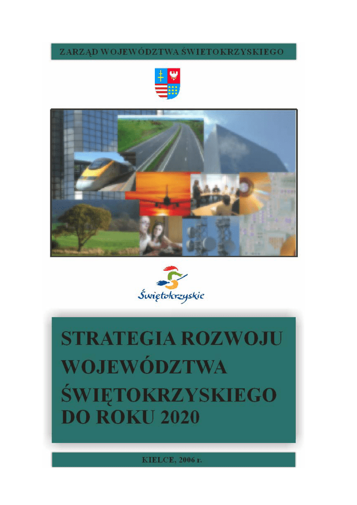 Spis treści 1. Przesłanki aktualizacji strategii.......................................................................................... 4 2. Diagnoza sytuacji społeczno-gospodarczo-przestrzennej województwa........................... 6 2.1. Charakterystyka Województwa Świętokrzyskiego .................................................. 6 2.2. gospodarka, zagadnienia dotyczące innowacyjności ...................................................... 9 2.3. zasoby ludzkie ............................................................................................................... 14 2.4. rynek pracy.................................................................................................................... 15 2.5. nauka i edukacja ............................................................................................................ 18 2.6. ochrona zdrowia ............................................................................................................ 20 2.7. warunki życia i bezpieczeństwa ................................................................................... 21 2.8. pomoc społeczna ........................................................................................................... 22 2.9. infrastruktura ................................................................................................................. 23 2.10. mieszkalnictwo............................................................................................................ 29 2.11. rozwój obszarów wiejskich i rolnictwo...................................................................... 31 2.12. turystyka ..................................................................................................................... 33 2.13. kultura, ochrona dziedzictwa kulturowego ................................................................ 35 3. Analiza SWOT ................................................................................................................. 38 4. Dotychczasowa pomoc publiczna dla Województwa Świętokrzyskiego ........................ 43 4.1. Pomoc krajowa.............................................................................................................. 43 4.2. Pomoc zagraniczna........................................................................................................ 44 5. Wizja przyszłości – Województwo Świętokrzyskie w roku 2020 ................................... 56 5.1. 5.2. 5.3. 5.4. 5.5. 5.6. 5.7. 6. Najważniejsze uwarunkowania rozwoju..................................................................... 56 Scenariusz zagrożeń ..................................................................................................... 59 Scenariusz szans........................................................................................................... 60 Wizja rozwoju województwa ....................................................................................... 61 Podstawowe zasady...................................................................................................... 67 Kierunki przekształceń struktury funkcjonalno-przestrzennej województwa ............. 69 Płaszczyzny współpracy międzywojewódzkiej ........................................................... 73 Misja, cele i główne priorytety Strategii Rozwoju Województwa................................... 79 6.1. Misja............................................................................................................................. 79 6.2. Cel generalny................................................................................................................ 81 6.3. Cele warunkujące, priorytety i kierunki działań ......................................................... 82 7. Instrumenty i wdrażanie Strategii .................................................................................. 103 8. Źródła finansowania rozwoju województwa świętokrzyskiego w latach 2000-2013. 112 9. System monitorowania i oceny realizacji strategii......................................................... 114 9.1. Monitoring dokumentu strategii.................................................................................. 114 9.2. Monitoring programów operacyjnych i wojewódzkich .............................................. 115 9.3. Podmioty zaangażowane w monitorowanie strategii .................................................. 116 9.4. Kategorie wskaźników monitorowania....................................................................... 117 10. Załączniki .....................................................................Błąd! Nie zdefiniowano zakładki. Tabela priorytetów ...........................................................Błąd! Nie zdefiniowano zakładki. 2 Konsultacje społeczne ......................................................Błąd! Nie zdefiniowano zakładki. Instytucje biorące udział w konsultacjach........................Błąd! Nie zdefiniowano zakładki. Synteza oceny przewidywanego wpływu Strategii na środowisko.. Błąd! Nie zdefiniowano zakładki. Zespół Koordynacyjny .....................................................Błąd! Nie zdefiniowano zakładki. Zespół Redakcyjny...........................................................Błąd! Nie zdefiniowano zakładki. Załącznik statystyczny .....................................................Błąd! Nie zdefiniowano zakładki. 3 1. Przesłanki aktualizacji strategii Dokument „Strategia Rozwoju Województwa Świętokrzyskiego” został przyjęty uchwałą Nr XIV/225/2000 Sejmiku Województwa Świętokrzyskiego z dnia 30 czerwca 2000 roku. Strategia stanowiąc całościową koncepcję rozwoju województwa w kilkunastoletnim horyzoncie czasowym (do roku 2015) wskazała cele oraz zidentyfikowała programy wojewódzkie, poprzez które będzie realizowana. Zgodnie z zapisami § 4 Uchwały, Zarząd Wojewódz