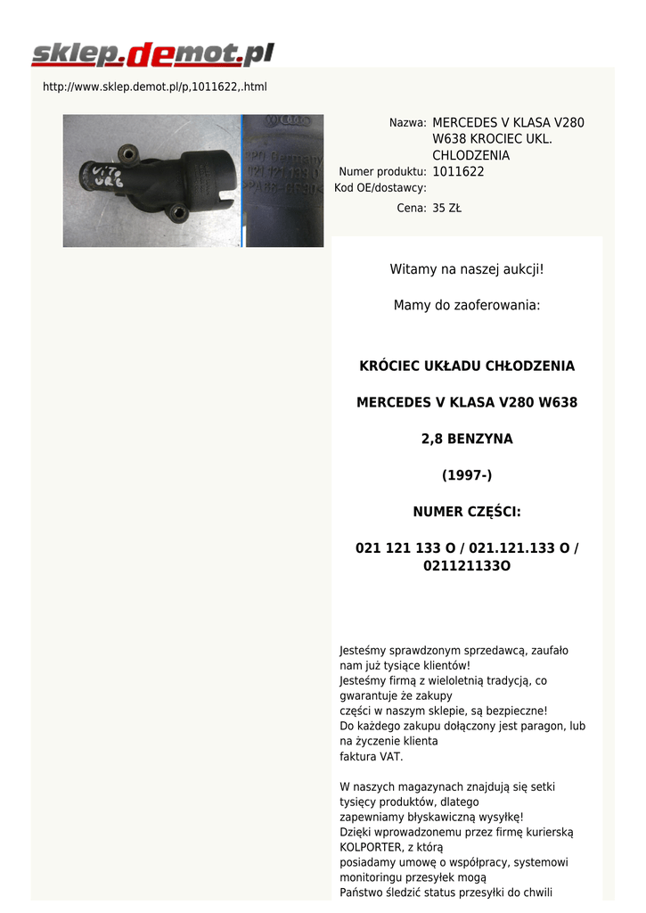 http://www.sklep.demot.pl/p,1011622,.html Nazwa: MERCEDES V KLASA V280 W638 KROCIEC UKL. CHLODZENIA Numer produktu: 1011622 Kod OE/dostawcy: Cena: 35 ZŁ Witamy na naszej aukcji! Mamy do zaoferowania: KRÓCIEC UKŁADU CHŁODZENIA MERCEDES V KLASA V280 W638 2,8 BENZYNA (1997-) NUMER CZĘŚCI: 021 121 133 O / 021.121.133 O / 021121133O Jesteśmy sprawdzonym sprzedawcą, zaufało nam już tysiące klientów! Jesteśmy firmą z wieloletnią tradycją, co gwarantuje że zakupy części w naszym sklepie, są bezpieczne! Do każdego zakupu dołączony jest paragon, lub na życzenie klienta faktura VAT. W naszych magazynach znajdują się setki tysięcy produktów, dlatego zapewniamy błyskawiczną wysyłkę! Dzięki wprowadzonemu przez firmę kurierską KOLPORTER, z którą posiadamy umowę o współpracy, systemowi monitoringu przesyłek mogą Państwo śledzić status przesyłki do chwili doręczenia! Praca odbywa się we wszystkie dni tygodnia poza niedzielami. Telefony są czynne w godzinach od 8-17 w dni powszednie oraz od 8-14 w soboty W pozostałych godzinach prosimy o kontakt mailowy, Jeżeli telefony są zajęte, poza zasięgiem, lub występują błędy w połączeniu, wszelkie zamówienia i zapytania proszę kierować na maila, czytamy i odpowiadamy wszystkie e-maile! Przy zakupie powyżej 200 zł choinka zapachowa do Twojego samochodu GRATIS !!! UWAGA! Kupując na kilku naszych aukcjach - za przesyłkę płacisz tylko raz! Posiadamy w ofercie tysiące oryginalnych części oraz zamienników do takich marek jak: AUDI, Alfa Romeo, Bmw, Chevrolet, Chrysler, Citroen, Dacia, Daewoo, Daihatsu, Dodge, Fiat, Ford, Honda, Hyundai, Jaguar, Jeep, Kia, Lancia, Land Rover, Lexus, Łada, Mazda, Mercedes, MG, Mini, Mitsubishi, Nissan, Opel, Peugeot, Polonez, Pontiac, Porsche, Renault, Rover, Saab, Seat, Skoda, Smart, Ssang Yong, Subaru, Suzuki, Tata, Toyota, Volkswagen, Volvo, ponadto posiadamy w ofercie części dla miłośników pojazdów zabytkowych i klasycznych. Zapraszamy na inne aukcje sklepu demot! Posiadamy w sprzedaży auto alarmy, zestawy słuchawkowe, radioodtwarzacze, mp3, DVD, TV, CB radio, CD, nawigacja GPS, aktualna mapa oraz filmy i gry o tematyce motoryzacyjnej. Jesteśmy autoryzowanym sprzedawcą produktów Castrol, posiadamy własny serwis zapewniający bezpłatną wymianę zakupionych u nas olejów. Staramy się aby klasa naszych usług była najwyższa! Oferujemy serwis wulkanizacyjny, oraz sprzedaż opon nowych, bieżnikowanych oraz używanych pochodzących ze stacji demontażu pojazdów. Przy zakupie kompletu opon używanych montaż gratis! W naszej firmie istnieje możliwość złomowania pojazdu. Złomowanie i kasacja samochodów oraz motocykli i skuterów jest możliwa dzięki uzyskanym zezwoleniom. Stacja demontażu wystawia zaświadczenia umożliwiające wyrejestrowanie pojazdu. Nasza oferta jest skierowana do wszystkich ceniących sobie wysoki standard oferowanych usług!