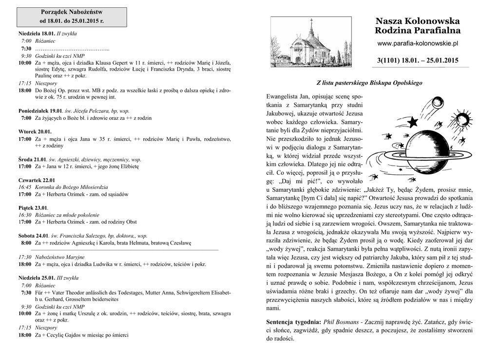 Porządek Nabożeństw od 18.01. do 25.01.2015 r. Niedziela 18.01. II zwykła 7:00 Różaniec 7:30 ………………………………….. 9:30 Godzinki ku czci NMP 10:00 Za + męża, ojca i dziadka Klausa Gepert w 11 r. śmierci, ++ rodziców Marię i Józefa, siostrę Edytę, szwagra Rudolfa, rodziców Łucję i Franciszka Drynda, 3 braci, siostrę Paulinę oraz ++ z pokr. 17:15 Nieszpory 18:00 Do Bożej Op. przez wst. MB z podz. za wszelkie łaski z prośbą o dalsza opiekę i zdrowie z ok. 75 r. urodzin w pewnej int. Poniedziałek 19.01. św. Józefa Pelczara, bp, wsp. 7:00 Za żyjących o Boże bł. i zdrowie oraz za ++ z rodzin Wtorek 20.01. 17:00 Za + męża i ojca Jana w 35 r. śmierci, ++ rodziców Marię i Pawła, rodzeństwo, ++ z rodziny Środa 21.01. św. Agnieszki, dziewicy, męczennicy, wsp. 17:00 Za + Jana w 12 r. śmierci, + jego żonę Elżbietę Czwartek 22.01 16:45 Koronka do Bożego Miłosierdzia 17:00 Za + Herberta Ozimek - zam. od sąsiadów Piątek 23.01. 16:30 Różaniec za młode pokolenie 17:00 Za + Herberta Ozimek - zam. od rodziny Obst Sobota 24.01. św. Franciszka Salezego, bp, doktora,, wsp. 8:00 Za ++ rodziców Agnieszkę i Karola, brata Helmuta, bratową Czesławę ————————–—–———————————————————————— 17:30 Nabożeństwo Maryjne 18:00 Za + męża, ojca i dziadka Ludwika w r. śmierci, ++ rodziców, teściów i pokr. Niedziela 25.01. III zwykła 7:00 Różaniec 7:30 Für ++ Vater Theodor anlässlich des Todestages, Mutter Anna, Schwigereltern Elisabeth u. Gerhard, Grosseltern beiderseites 9:30 Godzinki ku czci NMP 10:00 Za + żonę i matkę Urszulę z ok. urodzin, ++ rodziców, teściów, siostrę, brata, szwagra oraz ++ z pokr. 17:15 Nieszpory 18:00 Za + Cecylię Gajdos w miesiąc po śmierci Nasza Kolonowska Rodzina Parafialna www.parafia-kolonowskie.pl 3(1101) 18.01. – 25.01.2015 Z listu pasterskiego Biskupa Opolskiego Ewangelista Jan, opisując scenę spotkania z Samarytanką przy studni Jakubowej, ukazuje otwartość Jezusa wobec każdego człowieka. Samarytanie byli dla Żydów nieprzyjaciółmi. Nie przeszkodziło to jednak Jezusowi w podjęciu dialogu z Samarytanką, w której widział przede wszystkim człowieka. Dlatego jej nie odtrącił. Co więcej, poprosił ją o przysługę: „Daj mi pić!”, co wywołało u Samarytanki głębokie zdziwienie: „Jakżeż Ty, będąc Żydem, prosisz mnie, Samarytankę [bym Ci dała] się napić?” Otwartość Jesusa prowadzi do spotkania i do bliższego wzajemnego poznania się. Jezus uczy nas, że w relacjach z ludźmi nie wolno kierować się uprzedzeniami czy stereotypami. One często odtrącają ludzi od siebie i są zarzewiem wrogości. Owszem, Samarytanka nie traktowała Jezusa z wrogością, jednakże okazywała Mu swoją wyższość. Najpierw wyraziła zdziwienie, że będąc Żydem prosił ją o wodę. Kiedy zaoferował jej dar „wody żywej”, reakcja Samarytanki była pełna wątpliwości. Z nutą ironii zapytała więc Jezusa, czy jest większy od patriarchy Jakuba, który sam pił z tej studni i podarował ją swemu potomstwu. Zmieniła nastawienie dopiero z momentem rozpoznania w Jezusie Mesjasza Bożego, a On z kolei pomógł jej odkryć i uznać prawdę o sobie. Podobnie i nam, współczesnym chrześcijanom, Jezus uświadamia różne braki i grzechy. On też ofiaruje nam dar „wody żywej” dla przezwyciężenia naszych słabości, które są źródłem podziałów w nas i między nami. Sentencja tygodnia: Phil Bosmans - Zacznij naprawdę żyć. Zatańcz, gdy świeci słońce, zagwiżdż, gdy spadnie deszcz, a poczujesz, że zostaliśmy stworzeni do radości. 3/2015 św. Jan Paweł II o życiu konsekrowanym: „W ciągu stuleci nigdy nie zabrakło ludzi, którzy wybrali tę drogę specjalnego naśladowania Chrystusa, aby oddać się Jemu sercem „niepodzielnym”. Oni także porzucili wszystko jak Apostołowie, aby przebywać z Nim i tak jak On oddać się na służbę Bogu i braciom”. Kiedy spojrzymy do martyrologium – „spisu” świętych, to nie ma tygodnia, w którym nie wspominalibyśmy jakiegoś mnicha, zakonnicy, osoby konsekrowanej. Ich szczególne przebywanie z Bogiem zaczęło się przez śluby i trwa na zawsze. „Obecność życia konsekrowanego w całym świecie oraz ewangeliczny charakter jego świadectwa to przekonujące dowody na to, że nie jest ono rzeczywistością odosobnioną i drugorzędna, ale sprawą całego Kościoła”. Na „widowni życia” w pierwszym rzędzie obok małżeństwa i kapłaństwa znajduje się także życie konsekrowane. Czasem skryte, często niedoceniane, jest jednak ważną „cegiełką” w budowli Kościoła. Uwierzmy w to! ————————–—————–————————————— Listy od ukochanej: Pewien Europejczyk - pisze duński teolog i filozof, Kierkegaard - wyjechał na Daleki Wschód i zakochał się po uszy w pięknej Chince. Wróciwszy do domu, czekał z utęsknieniem na list od ukochanej. Po jakimś czasie przyszedł rzeczywiście wyczekiwany list - pisany chińszczyzną. Nic z tego nie rozumiał, ale wiedział, że jest to znak odwzajemnionej miłości. Poświadczył mu to zresztą tłumacz przysięgły. Pośrednictwo trzeciej osoby nie było jednak najwygodniejszym rozwiązaniem, więc zaczął sam studiować język chiński. Miłość pchała go do szybkiego postępu w nauce. I w istocie już po paru latach mógł swobodnie odczytywać chińskie znaki. Ale nasz Europejczyk tak się rozmiłował w tym egzotycznym języku, że wkrótce został profesorem i docentem w katedrze literatury chińskiej. Niestety, w tym czasie zdążył zapomnieć o zasadniczej przyczynie nauki owego obcego języka. No cóż? Zakochał się w literze, a zapomniał o sercu; oddał się nauczaniu, a przestał być tym, który kocha. ————————–—————–————————————— Nasza Książka: Dzisiaj p