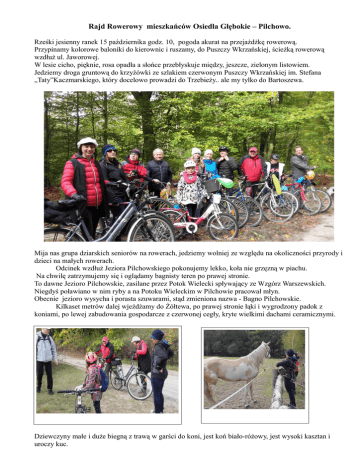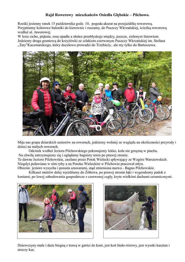 Rajd Rowerowy mieszkańców Osiedla Głębokie – Pilchowo. Rześki jesienny ranek 15 października godz. 10, pogoda akurat na przejażdżkę rowerową. Przypinamy kolorowe baloniki do kierownic i ruszamy, do Puszczy Wkrzańskiej, ścieżką rowerową wzdłuż ul. Jaworowej. W lesie cicho, pięknie, rosa opadła a słońce przebłyskuje między, jeszcze, zielonym listowiem. Jedziemy droga gruntową do krzyżówki ze szlakiem czerwonym Puszczy Wkrzańskiej im. Stefana „Taty”Kaczmarskiego, który docelowo prowadzi do Trzebieży.. ale my tylko do Bartoszewa. Mija nas grupa dziarskich seniorów na rowerach, jedziemy wolniej ze względu na okoliczności przyrody i dzieci na małych rowerach. Odcinek wzdłuż Jeziora Pilchowskiego pokonujemy lekko, koła nie grzęzną w piachu. Na chwilę zatrzymujemy się i oglądamy bagnisty teren po prawej stronie. To dawne Jezioro Pilchowskie, zasilane przez Potok Wielecki spływający ze Wzgórz Warszewskich. Niegdyś poławiano w nim ryby a na Potoku Wieleckim w Pilchowie pracował młyn. Obecnie jezioro wysycha i porasta szuwarami, stąd zmieniona nazwa - Bagno Pilchowskie. Kilkaset metrów dalej wjeżdżamy do Żółtewa, po prawej stronie łąki i wygrodzony padok z koniami, po lewej zabudowania gospodarcze z czerwonej cegły, kryte wielkimi dachami ceramicznymi. Dziewczyny małe i duże biegną z trawą w garści do koni, jest koń biało-różowy, jest wysoki kasztan i uroczy kuc. Żółtew, to mała miejscowość praktycznie ograniczona do zabudowy ośrodka jeździeckiego; dawniej mała osada w Puszczy Wkrzańskiej, na pocz. XIXw. istniała tu oberża o nazwie „Psie Ustronie”, tu w latach 30-stych XIX w. zlokalizowano stację wymiany koni kurierskich – może stąd tradycja trzymania koni. Po wojnie majątek Żółtew włączono do PGR Dobra Szczecińska, a w 1990 r. utworzono ośrodek jeździecki. ... a skąd nazwa? prawdopodobnie nawiązuje do niegdysiejszego koloru tynków zabudowań gospodarczych. Szkoda,że nie ma oberży „Psie Ustronie”.. siadamy na rowery i jedziemy żwirową drogą do Bartoszewa. Mijamy po lewej stronie wygrodzone posesje domków letniskowych, pustawe o tej porze ogródki Gospody Bartoszewo i Karczmy Uroczysko. Dojeżdżamy do skrzyżowania ze szlakiem żółtym „Polickim”. Dzieci zostają z dyżurnym wujkiem na lodach, przy sklepiku „U pomidora”, reszta decyduje się na objazd małego jeziorka rynnowego. Jezioro Bartoszewskie ma tylko ok. 3 ha powierzchni i zmniejszyło się o połowę od przedwojnia. Na początku XXw. istniała tu przystań i pomosty dla łodzi, kąpielisko i plaża; w latach 50-tych organizowano w Bartoszewie kolonie dla dzieci, atrakcyjność miejsca spowodowała,że w pobliżu wybudowano ok 400 domów letniskowych. Zaskoczeni, zobaczyliśmy nad samym jeziorem, zabudowę mieszkaniową. Wracamy do „Pomidora” i kiedy ostatni lód zniknął, ruszyliśmy na Głębokie, część ekipy drogą gruntową przez las, część utwardzona ścieżką rowerową, przez Pilchowo, a wszyscy na Polanę Sportową. Kiedy lekko zmęczeni, ale tylko pytaniami „ a daleko jeszcze?”, docieramy na miejsce, czeka na nas rozpalone ognisko, kijki, kiełbaski, ketchupy, popitki i te wszystkie lubiane i niezbędne do „posiadu” rzeczy. Pogadaliśmy, pojedli, pośmiali, wsiedliśmy na rowery i pojechali. Do zobaczenia następnym razem! Opracowała Iwona Trzaska korzystałam z „ SZCZECIN STARY I NOWY – T. Białecki, Lucyna Turek-Kwiatkowska 1991 „Leksykon Puszczy Wkrzańskiej” pod red. T. Białeckiego i St. Krzywickiego 2013