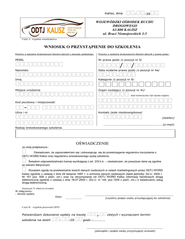 Kalisz, dnia --20 WOJEWÓDZKI OŚRODEK RUCHU DROGOWEGO 62-800 KALISZ ul. Braci Niemojowskich 3-5 Część A –wypełnia wnioskodawca WNIOSEK O PRZYSTĄPIENIE DO SZKOLENIA Prosimy o wpisanie drukowanymi literami danych z dowodu osobistego: Prosimy o wpisanie drukowanymi literami danych z prawa jazdy: PESEL Nr prawa jazdy /z pozycji nr 5/ // Nazwisko Data wydania prawa jazdy /z pozycji nr 4a/ Imię Kategorie /z pozycji nr 9/ Miejsce urodzenia Organ wydający /z pozycji nr 4c/ -- Kod pocztowy i miejscowość - kod numeryczny lub nazwa organu Ulica i nr Kontakt /pole nieobowiązkowe/ (telefon) ……………………………………………………………………(e-mail) Rodzaj wnioskowanego szkolenia OŚWIADCZENIE Ja niżej podpisany/a : Oświadczam, że zapoznałem/am się i zobowiązuję się do przestrzegania regulaminu korzystania z ODTJ WORD Kalisz oraz regulaminu wnioskowanego wyżej szkolenia. Świadom odpowiedzialności karnej wynikającej z art. 233 k.k. – oświadczam, że powyższe dane są zgodne ze stanem faktycznym. Wyrażam zgodę na przetwarzanie swoich danych osobowych w celach marketingowych przez ODTJ WORD Kalisz zgodnie z ustawą z dnia 29 sierpnia 1997 r. o ochronie danych osobowych (tekst jednolity: Dz.U. 2002 r. Nr 101 poz. 926 z późn. zm.) oraz na otrzymywanie od ODTJ WORD Kalisz informacji handlowych drogą elektroniczną zgodnie z ustawą z dnia 18.07.2002 r. (Dz.U. nr 144, poz.1204 z późn. zm.) o świadczeniu usług drogą elektroniczną. Zaznaczyć X właściwy kwadrat W załączeniu: - dowód wpłaty Data: .............................................................................. ……………….... (czytelny podpis osoby przystępującej do szkolenia) Część B – wypełnia pracownik ODTJ Potwierdzam dokonanie wpłaty na kwotę szkolenia na dzień , złotych i wyznaczam termin --20 godz.:………….. ................................................................... (pieczątka i podpis osoby przyjmującej wniosek)