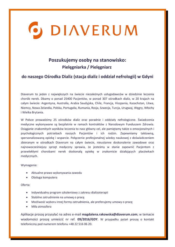 Poszukujemy osoby na stanowisko: Pielęgniarka / Pielęgniarz do naszego Ośrodka Dializ (stacja dializ i oddział nefrologii) w Gdyni Diaverum to jeden z największych na świecie niezależnych usługodawców w dziedzinie leczenia chorób nerek. Dbamy o ponad 25400 Pacjentów, w ponad 307 ośrodkach dializ, w 20 krajach na całym świecie: Argentyna, Australia, Arabia Saudyjska, Chile, Francja, Hiszpania, Kazachstan, Litwa, Niemcy, Nowa Zelandia, Polska, Portugalia, Rumunia, Rosja, Szwecja, Turcja, Urugwaj, Węgry, Włochy i Wielka Brytania. W Polsce prowadzimy 25 ośrodków dializ oraz poradnie i oddziały nefrologiczne. Świadczenia medyczne wykonywane są bezpłatnie w ramach kontraktów z Narodowym Funduszem Zdrowia. Osiąganie znakomitych wyników leczenia to nasz główny cel, ale pamiętamy także o emocjonalnych i psychologicznych potrzebach naszych Pacjentów i ich rodzin. Zapewniamy taktowną, spersonalizowaną opiekę i wsparcie. Połączenie profesjonalnej wiedzy naukowej z doświadczeniem zbieranym w ośrodkach Diaverum na całym świecie, nieustanne doskonalenie zawodowe oraz najnowocześniejszy sprzęt medyczny sprawia, że jesteśmy w stanie zapewnid Pacjentom z przewlekłymi chorobami nerek doskonałą opiekę w znakomicie działających placówkach medycznych. Wymagania: Aktualne prawo wykonywania zawodu Obsługa komputera Oferta: Indywidualny program szkoleniowy z zakresu dializoterapii Stabilne zatrudnienie na umowę o pracę Możliwośd wyboru innej formy zatrudnienia, ale preferujemy umowy o pracę Miła atmosfera Aplikacje proszę przysyład na adres e-mail [email protected]; w temacie wiadomości proszę umieścid nr ref. 09/2016/GDY. W przypadku pytao proszę o kontakt telefoniczny pod numerem telefonu +48 22 516 06 20.
