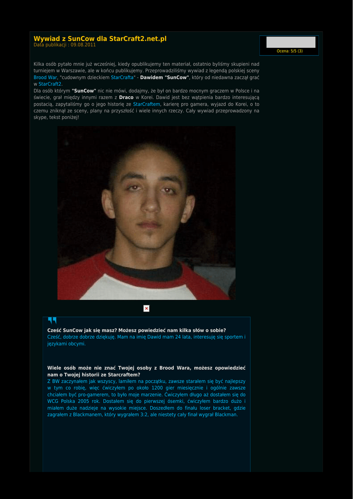 Wywiad z SunCow dla StarCraft2.net.pl Data publikacji : 09.08.2011 Ocena: 5/5 (3) Kilka osób pytało mnie już wcześniej, kiedy opublikujemy ten materiał, ostatnio byliśmy skupieni nad turniejem w Warszawie, ale w końcu publikujemy. Przeprowadziliśmy wywiad z legendą polskiej sceny Brood War, "cudownym dzieckiem StarCrafta" - Dawidem "SunCow", który od niedawna zaczął grać w StarCraft2. Dla osób którym "SunCow" nic nie mówi, dodajmy, że był on bardzo mocnym graczem w Polsce i na świecie, grał między innymi razem z Draco w Korei. Dawid jest bez wątpienia bardzo interesującą postacią, zapytaliśmy go o jego historię ze StarCraftem, karierę pro gamera, wyjazd do Korei, o to czemu zniknął ze sceny, plany na przyszłość i wiele innych rzeczy. Cały wywiad przeprowadzony na skype, tekst poniżej! Cześć SunCow jak się masz? Możesz powiedzieć nam kilka słów o sobie? Cześć, dobrze dobrze dziękuję. Mam na imię Dawid mam 24 lata, interesuję się sportem i językami obcymi. Wiele osób może nie znać Twojej osoby z Brood Wara, możesz opowiedzieć nam o Twojej historii ze Starcraftem? Z BW zaczynałem jak wszyscy, lamiłem na początku, zawsze starałem się być najlepszy w tym co robię, więc ćwiczyłem po około 1200 gier miesięcznie i ogólnie zawsze chciałem być pro-gamerem, to było moje marzenie. Ćwiczyłem długo aż dostałem się do WCG Polska 2005 rok. Dostałem się do pierwszej ósemki, ćwiczyłem bardzo dużo i miałem duże nadzieje na wysokie miejsce. Doszedłem do finału loser bracket, gdzie zagrałem z Blackmanem, który wygrałem 3:2, ale niestety cały finał wygrał Blackman. Możesz opowiedzieć o Korei, jak to się zaczęło? Ogólnie na początku po WCG zacząłem dużo trenować, grałem na WEST serwerze, miałem okazję dostać się do klanu SIZ, który później zmienił nazwę na BY, aktualnie w tym klanie gra mistrz świata BW - Flash. Z liderem tego teamu gadałem dość długo, powiedziałem mu, że moim marzeniem jest przyłączenie się do pro temu i zdobycie licencji pro gamera. Po dłuższych rozmowach dostałem propozycję przyjechania do Korei, gdzie pojechałem razem z Draco. W tym czasie obaj graliśmy dla MYM, który zasponsorował nam przelot i mieszkanie. Z jakimi znanymi graczami miałeś okazje zagrać w Korei? Miałem okazję zagrać praktycznie z całą elitą: Nada, Boxer, July, OGOGO, Spear[Shield] , Nal_keke inni, ogólnie koreańska czołówka w tamtym czasie. Możesz opowiedzieć jak to było z turniejem "Courage", w ilu brałeś udział i jak daleko zaszedłeś? Miałem okazję po miesiącu treningu pójść na Courage, trenowałem wtedy po 15h dziennie, wiedziałem że nie będzie łatwo. Razem z Draco byliśmy wtedy jednymi graczami spoza Korei w tym bardzo prestiżowym turnieju. W mojej grupie było 256 graczy i u Draco 256, doszedłem do półfinału, wszystkie mecze wcześniej wygrałem 2:0, niestety na koniec przegrałem z Lomo[fOu]. Dlaczego przerwałeś pro gaming w BW? byłeś top graczem na świecie. Miałem małe problemy z trenerem, było dużo plotek, jednak historia jest taka, że był on bardzo chamski, wymagał bym kąpał się 4-5 razy dziennie, to było trochę nienormalne, ja uważałem że 2 razy dziennie wystarczy. Gość powiedział bym wyszedł z domu, w którym trenowałem więc wyszedłem. Team MYM po pół roku przestał nas obu sponsorować, pamiętam że mieszkanie wtedy kosztowało około 2500zł miesięcznie. Wróciłem do Polski. Największe osiągnięcia? WCG 2005 Polska - 2 miejsce Turniej w Koszalinie - 2 miejsce Turniej w Gorzowie - 1 miejsce Turniej Gdańsk - 1 miejsce Turniej Gdańsk - 2 miejsce Turniej Ełk - 1 miejsce Turniej MgZ 2005 - 1 miejsce Turniej z Czechach - 1 miejsce Turniej Elbląg - 1 miejsce iG Invite 2006 - 1 miejsce LZN final - 1 miejsce Intel Qpad Play - 1 miejsce i było tego więcej. Ustaliliśmy przed wywiadem, że pominiemy kilka kwestii z Twojego życia, ale muszę zapytać o inne, wiem że mówisz płynnie po niemiecku, mieszkałeś w Niemczech? gdzie się nauczyłeś? Całe życie za bardzo nie lubiłem szkoły, jednak języków obcych zawsze szybko się uczyłem, głównie z TV hehe. Gdy miałem 8 lat pojechałem do Niemiec z mamą i mieszkałem tam 4 lata. Jakie znasz jeszcze języki? Rosyjski, angielski, polski, niemiecki i arabski. Cofnijmy się jeszcze trochę wstecz, mieszkałeś w Polsce, później pół roku w Korei, później byłeś instruktorem tenisa w Egipcie, następnie słuch o Tobie zaginął i nagle pojawiłeś się na ladderze SC2. Można by było napisać nowele o Tobie, możesz opowiedzieć jak to było, gdzie i kiedy w ogóle nauczyłeś się grać w tenisa ? :) Od 6 roku życia grałem w tenisa, mam dobre znajomości z Agnieszką Radwańską i Karoliną Woźniak - mistrzyni świata w tenisa ziemnego. Byłem w pierwszej 10stce w Polsce i w pierwszej 100tce na świecie, gdy jeszcze grałem. Ogólnie skończyłem z BW bo ludzie zaczęli pisać głupoty na mój temat, które nie były prawdą. Wszystko co zrobiłem dla sceny, wywiady, wypowiedzi, dawałem wiele repów z Korei, nikt tego nie docenił. Ogólnie dużo zrobiłem dla sceny, ale niestety potraktowano mnie jak potraktowano. Postanowiłem, że lepiej będzie zostawić BW i iść w inną stronę. Starczy może wspomnień wróćmy do czasów teraźniejszych, kiedy zacząłeś grać w SC2? Miesiąc temu, jak zobaczyłem że gracze jak Idra, Mana i paru innych wymiatają, widzę jakie są pieniądze do zgarnięcia w porównaniu do BW. Wiadomo każdy chce zarobić, a widzę że granie w Starcrafta nieźle mi idzie.. Skąd w ogólne ten pomysł po takim czasie, zagrajmy w Starcraft2? :) Mam ogólnie trochę więcej czasu, mam sponsora i pomyślałem, że warto znowu spróbować. Bardzo podoba mi się SC2, chyba bardziej niż BW. Od razu zacząłeś grać Zergiem, nie myślałeś o innej rasie? Gram Zergiem cały czas, ale bardzo możliwe, że przerzucę się na inną
