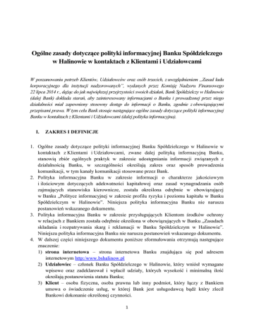 Ogólne zasady dotyczące polityki informacyjnej Banku Spółdzielczego w Halinowie w kontaktach z Klientami i Udziałowcami W poszanowaniu potrzeb Klientów, Udziałowców oraz osób trzecich, z uwzględnieniem „Zasad ładu korporacyjnego dla instytucji nadzorowanych”, wydanych przez Komisję Nadzoru Finansowego 22 lipca 2014 r., dążąc do jak największej przejrzystości swoich działań, Bank Spółdzielczy w Halinowie (dalej Bank) dokłada starań, aby zainteresowany informacjami o Banku i prowadzonej przez niego działalności miał zapewniony stosowny dostęp do informacji o Banku, zgodnie z obowiązującymi przepisami prawa. W tym celu Bank stosuje następujące ogólne zasady dotyczące polityki informacyjnej Banku w kontaktach z Klientami i Udziałowcami (dalej polityka informacyjna). I. ZAKRES I DEFINICJE 1. Ogólne zasady dotyczące polityki informacyjnej Banku Spółdzielczego w Halinowie w kontaktach z Klientami i Udziałowcami, zwane dalej polityką informacyjną Banku, stanowią zbiór ogólnych praktyk w zakresie udostępniania informacji związanych z działalnością Banku, w szczególności określają zakres oraz sposób prowadzenia komunikacji, w tym kanały komunikacji stosowane przez Bank. 2. Polityka informacyjna Banku w zakresie informacji o charakterze jakościowym i ilościowym dotyczących adekwatności kapitałowej oraz zasad wynagradzania osób zajmujących stanowiska kierownicze, została określona odrębnie w obowiązującej w Banku „Polityce informacyjnej w zakresie profilu ryzyka i poziomu kapitału w Banku Spółdzielczym w Halinowie”. Niniejsza polityka informacyjna Banku nie narusza postanowień wskazanego dokumentu. 3. Polityka informacyjna Banku w zakresie przysługujących Klientom środków ochrony w relacjach z Bankiem została odrębnie określona w obowiązujących w Banku „Zasadach składania i rozpatrywania skarg i reklamacji w Banku Spółdzielczym w Halinowie”. Niniejsza polityka informacyjna Banku nie narusza postanowień wskazanego dokumentu. 4. W dalszej części niniejszego dokumentu poniższe sformułowania otrzymują następujące znaczenie: 1) strona internetowa – strona internetowa Banku znajdująca się pod adresem internetowym http:/www.bshalinow.pl 2) Udziałowiec – członek Banku Spółdzielczego w Halinowie, który wniósł wymagane wpisowe oraz zadeklarował i wpłacił udziały, których wysokość i minimalną ilość określają postanowienia statutu Banku; 3) Klient – osoba fizyczna, osoba prawna lub inny podmiot, który łączy z Bankiem umowa o świadczenie usług, w której Bank jest usługodawcą bądź który zlecił Bankowi dokonanie określonej czynności. 1 II. PRAKTYKI OGÓLNE 1. W wykonaniu deklaracji przyjętych przez Bank w uchwalonej i obowiązującej „Polityce ładu korporacyjnego Banku Spółdzielczego w Halinowie”, Bank stosuje rozwiązania i podejmuje działania odpowiednie dla urzeczywistnienia zasady prowadzenia przejrzystej polityki informacyjnej, uwzględniającej uzasadnione potrzeby swoich Udziałowców oraz Klientów. 2. Bank dąży do ułatwienia dostępu do informacji związanych z jego działalnością oraz do ich prezentowania w sposób przejrzysty, rzetelny i kompletny. Nie udostępnia się informacji objętych tajemnicą bankową, tajemnicą przedsiębiorstwa lub innych danych dla których prawo powszechnie obowiązujące lub interes Banku wymagają poufności. 3. Polityka informacyjna Banku ma na celu zagwarantowanie wysokich standardów komunikacji, służących kształtowaniu wizerunku Banku jako uczciwej i rzetelnej instytucji zaufania publicznego. 4. Podstawowym sposobem przekazywania przez Bank informacji związanych z jego działalnością jest udostępnianie materiałów i informacji w siedzibie Centrali Banku, w Oddziałach oraz na stronie internetowej, chyba że przepis powszechnie obowiązującego prawa przewiduje inaczej. III. STRONA INTERNETOWA 1. Informacje zamieszczane na stronie internetowej Banku maja na celu umożliwienie łatwego uzyskania dostępu do informacji na temat oferty produktowej Banku w celu wyboru produktów i usług dopasowanych do indywidualnych potrzeb Klientów oraz realizację obowiązków informacyjnych wynikających z przepisów prawa. 2. Strona internetowa Banku zawiera, między innymi: 1) podstawowe informacje o Banku, Spółdzielczej Grupie Bankowej i banku zrzeszającym – SGB-Banku S.A.; 2) statut Banku; 3) skład osobowy Zarządu oraz Rady Nadzorczej Banku, z wyszczególnieniem imion i nazwisk oraz funkcji; 4) dane kontaktowe Banku z wyszczególnieniem formy kontaktu; 5) wykaz placówek Banku; 6) podstawowe informacje związane z ofertą produktową Banku; 7) stosowane stawki oprocentowania środków na rachunkach bankowych, kredytów i pożyczek; 8) stosowane stawki prowizji i wysokość pobieranych opłat; 9) terminy kapitalizacji odsetek; 10) stosowane kursy walutowe; 11) sprawozdanie finansowe z opinią biegłego rewidenta za ostatni okres podlegający badaniu; 12) podstawową strukturę organizacyjną Banku; 2 13) stosowaną przez Bank „Politykę Ładu Korporacyjnego ….”, przyjętą na podstawie „Zasad ładu korporacyjnego dla instytucji nadzorowanych”, wydanych przez Komisję Nadzoru Finansowego, oraz ocenę ich stosowania przez Radę Nadzorczą Banku, przy czym publikacja pierwszej takiej oceny będzie miała miejsce po zakończeniu roku 2015; 14) politykę informacyjną Banku. IV. KLIENCI 1. Zewnętrzna polityka informacyjna Banku służy kształtowaniu pożądanych relacji z obecnymi i potencjalnymi Klientami Banku. 2. Komunikacja z Klientami, prowadzona w ramach polityki informacyjnej, powinna zawierać rzetelne, kompletne i niewprowadzające w błąd informacje, jak również powinna być zrozumiała dla przeciętnego odbiorcy i odbywać się z zachowaniem właściwej formy komunikacji, przy uwzględnieniu woli Klienta w zakresie przetwarzania jego danych dla celów informacyjnych i marketingowych. 3. Po