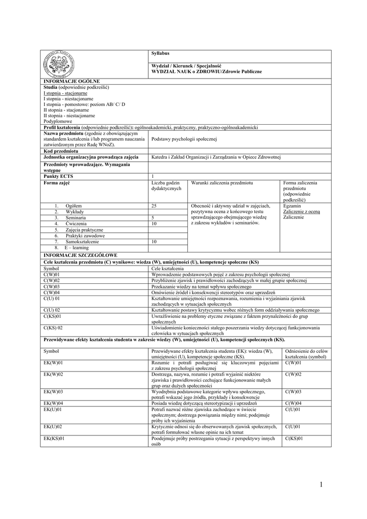 Syllabus Wydział / Kierunek / Specjalność WYDZIAŁ NAUK o ZDROWIU/Zdrowie Publiczne INFORMACJE OGÓLNE Studia (odpowiednie podkreślić) I stopnia - stacjonarne I stopnia - niestacjonarne I stopnia - pomostowe: poziom AB/ C/ D II stopnia - stacjonarne II stopnia - niestacjonarne Podyplomowe Profil kształcenia (odpowiednie podkreślić): ogólnoakademicki, praktyczny, praktyczno-ogólnoakademicki Nazwa przedmiotu (zgodnie z obowiązującym standardem kształcenia i/lub programem nauczania Podstawy psychologii społecznej zatwierdzonym przez Radę WNoZ). Kod przedmiotu Katedra i Zakład Organizacji i Zarządzania w Opiece Zdrowotnej Jednostka organizacyjna prowadząca zajęcia Przedmioty wprowadzające. Wymagania wstępne Punkty ECTS Forma zajęć 1. 2. 3. 4. 5. 6. 7. 8. Ogółem Wykłady Seminaria Ćwiczenia Zajęcia praktyczne Praktyki zawodowe Samokształcenie E – learning 1 Liczba godzin dydaktycznych 25 5 10 Warunki zaliczenia przedmiotu Obecność i aktywny udział w zajęciach, pozytywna ocena z końcowego testu sprawdzającego obejmującego wiedzę z zakresu wykładów i seminariów. Forma zaliczenia przedmiotu (odpowiednie podkreślić) Egzamin Zaliczenie z oceną Zaliczenie 10 INFORMACJE SZCZEGÓŁOWE Cele kształcenia przedmiotu (C) wynikowe: wiedza (W), umiejętności (U), kompetencje społeczne (KS) Symbol Cele kształcenia C(W)01 Wprowadzenie podstawowych pojęć z zakresu psychologii społecznej C(W)02 Przybliżenie zjawisk i prawidłowości zachodzących w małej grupie społecznej C(W)03 Przekazanie wiedzy na temat wpływu społecznego C(W)04 Omówienie źródeł i konsekwencji stereotypów oraz uprzedzeń C(U) 01 Kształtowanie umiejętności rozpoznawania, rozumienia i wyjaśniania zjawisk zachodzących w sytuacjach społecznych C(U) 02 Kształtowanie postawy krytycyzmu wobec różnych form oddziaływania społecznego C(KS)01 Uwrażliwienie na problemy etyczne związane z faktem przynależności do grup społecznych C(KS) 02 Uświadomienie konieczności stałego poszerzania wiedzy dotyczącej funkcjonowania człowieka w sytuacjach społecznych Przewidywane efekty kształcenia studenta w zakresie wiedzy (W), umiejętności (U), kompetencji społecznych (KS). Symbol EK(W)01 EK(W)02 EK(W)03 EK(W)04 EK(U)01 EK(U)02 EK(KS)01 Przewidywane efekty kształcenia studenta (EK): wiedza (W), umiejętności (U), kompetencje społeczne (KS). Rozumie i potrafi posługiwać się kluczowymi pojęciami z zakresu psychologii społecznej Dostrzega, nazywa, rozumie i potrafi wyjaśnić niektóre zjawiska i prawidłowości cechujące funkcjonowanie małych grup oraz dużych społeczności Wyodrębnia podstawowe kategorie wpływu społecznego, potrafi wskazać jego źródła, przykłady i konsekwencje Posiada wiedzę dotyczącą stereotypizacji i uprzedzeń Potrafi nazwać różne zjawiska zachodzące w świecie społecznym; dostrzega powiązania między nimi; podejmuje próby ich wyjaśnienia Krytycznie odnosi się do obserwowanych zjawisk społecznych, potrafi formułować własne opinie na ich temat Poodejmuje próby postrzegania sytuacji z perspektywy innych osób Odniesienie do celów kształcenia (symbol) C(W)01 C(W)02 C(W)03 C(W)04 C(U)01 C(U)01 C(KS)01 1 Dostrzega potrzebę stałego pogłębiania wiedzy o człowieku C(KS)02 jako indywidualnym podmiocie uczestniczącym w różnych formach interakcji społecznych Treści programowe (TP): opis przedmiotu wynikający z obowiązującego standardu kształcenia i/lub programu nauczania zatwierdzonego przez Radę WNoZ Symbol Forma realizacji treści kształcenia: np. wykład, seminaria, Odniesienie do ćwiczenia, zajęcia praktyczne, praktyki zawodowe, efektów kształcenia samokształcenie, E- learning (symbol) TP1 Wprowadzenie do psychologii społecznej: Wykład EK (W)01 przedmiot, obszary i metody badań. Problemy etyczne związane z prowadzeniem badań. TP2 Małe grupy społeczne Seminarium EK(W)02 EK(U)01 EK(KS)02 TP3 Wpływ społeczny Seminarium EK (W)03 EK(U)02 EK(KS)02 TP4 Stereotypy, uprzedzenia, dyskryminacja Seminarium EK(W)04 EK(U)01 EK(U)02 EK(KS)01 EK(KS)02 Metody dydaktyczne (sposób pracy nauczyciela, Wykład, dyskusja umożliwiający osiągnięcie celów kształcenia) Prezentacje z wykorzystaniem sprzętu multimedialnego, materiały źródłowe, tablica, Środki dydaktyczne wykorzystywane w pisaki procesie kształcenia Wykaz piśmiennictwa dla studenta Aron E., Ackert R., Psychologia społeczna – serce i umysł. Poznań 2000, Piśmiennictwo podstawowe do 4 pozycji Wydawnictwo Zysk i S-ka. Borkowski J., Podstawy psychologii społecznej, Dom Wydawniczy Elipsa, Warszawa 2003. Wosińska W., Psychologia życia społecznego. Gdańsk 2004, GWP. Dwyer D., Bliskie relacje interpersonalne. Gdańsk 2005, GWP. Piśmiennictwo uzupełniające do 4 pozycji Wren K., Wpływ społeczny. Gdańsk 2005, GWP. Sposób oceny pracy studenta Typ oceny: diagnostyczne (D), formujące (F), Ocenianie formujące (P): dyskusja podsumowujące (P) Ocenianie podsumowujące (P): test zaliczeniowy obejmujący treści wykładów i seminariów Metody oceny np. test wiedzy, test umiejętności, test wiedzy studium przypadku, proces pielęgnowania, projekt Kryteria oceny Ocena Definicja lokalna Ocena Definicja ECTS lokalna ECTS 5 Bardzo dobry – znakomita wiedza, umiejętności, kompetencje A Celujący – wybitne osiągnięcia 4,5 Ponad dobry – bardzo dobra wiedza, umiejętności, kompetencje B Bardzo dobry – powyżej średniego standardu, z pewnymi błędami 4 Dobry – dobra wiedza, umiejętności, kompetencje C Dobry – generalnie solidna praca z szeregiem zauważalnych błędów 3,5 Dość dobry – zadowalająca wiedza, umiejętności, kompetencje, D Zadowalający – zadowalający, ale ze znaczącymi ale ze znacznymi niedociągnięciami błędami 3 Dostateczny – zadowalająca wiedza, umiejętności, kompetencje, E Dostateczny – wyniki spełniają minimalne kryteria z licznymi błędami (próg 60% opanowania W,U,KS) 2 Niedostateczny – niezado