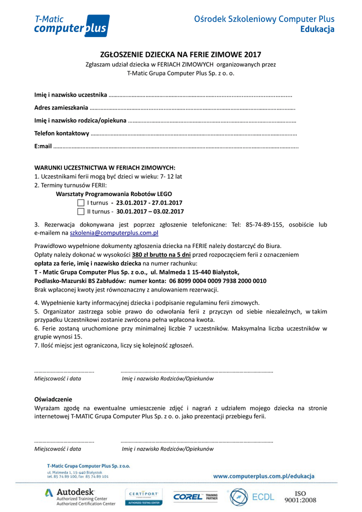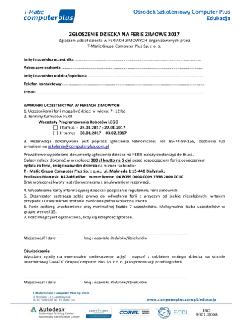 ZGŁOSZENIE DZIECKA NA FERIE ZIMOWE 2017 Zgłaszam udział dziecka w FERIACH ZIMOWYCH organizowanych przez T-Matic Grupa Computer Plus Sp. z o. o. Imię i nazwisko uczestnika …………………………………………………………….............................................. Adres zamieszkania ……………………………….............…………..……………………………………………………..……. Imię i nazwisko rodzica/opiekuna …………………………………………………….…..………………………………….… Telefon kontaktowy …………………………………………………………………………………………………………………..… E:mail ………………………………………………………………………………………………………………………………….……..... WARUNKI UCZESTNICTWA W FERIACH ZIMOWYCH: 1. Uczestnikami ferii mogą być dzieci w wieku: 7- 12 lat 2. Terminy turnusów FERII: Warsztaty Programowania Robotów LEGO I turnus - 23.01.2017 - 27.01.2017 II turnus - 30.01.2017 – 03.02.2017 3. Rezerwacja dokonywana jest poprzez zgłoszenie telefoniczne: Tel: 85-74-89-155, osobiście lub e-mailem na [email protected] Prawidłowo wypełnione dokumenty zgłoszenia dziecka na FERIE należy dostarczyć do Biura. Opłaty należy dokonać w wysokości 380 zł brutto na 5 dni przed rozpoczęciem ferii z oznaczeniem opłata za ferie, imię i nazwisko dziecka na numer rachunku: T - Matic Grupa Computer Plus Sp. z o.o., ul. Malmeda 1 15-440 Białystok, Podlasko-Mazurski BS Zabłudów: numer konta: 06 8099 0004 0009 7938 2000 0010 Brak wpłaconej kwoty jest równoznaczny z anulowaniem rezerwacji. 4. Wypełnienie karty informacyjnej dziecka i podpisanie regulaminu ferii zimowych. 5. Organizator zastrzega sobie prawo do odwołania ferii z przyczyn od siebie niezależnych, w takim przypadku Uczestnikowi zostanie zwrócona pełna wpłacona kwota. 6. Ferie zostaną uruchomione przy minimalnej liczbie 7 uczestników. Maksymalna liczba uczestników w grupie wynosi 15. 7. Ilość miejsc jest ograniczona, liczy się kolejność zgłoszeń. ……………………………………. Miejscowość i data ………….…………………………………………………………………………….…….. Imię i nazwisko Rodziców/Opiekunów Oświadczenie Wyrażam zgodę na ewentualne umieszczenie zdjęć i nagrań z udziałem mojego dziecka na stronie internetowej T-MATIC Grupa Computer Plus Sp. z o. o. jako prezentacji przebiegu ferii. ……………………………………. Miejscowość i data ………….…………………………………………………………………………….…….. Imię i nazwisko Rodziców/Opiekunów