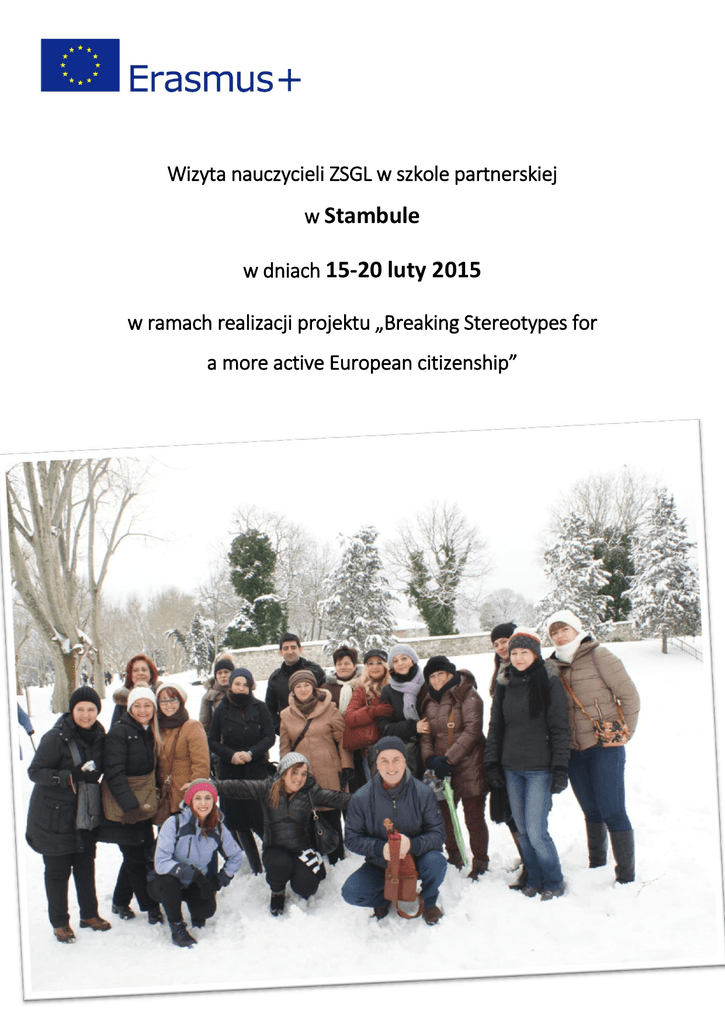 Wizyta nauczycieli ZSGL w szkole partnerskiej w Stambule w dniach 15-20 luty 2015 w ramach realizacji projektu „Breaking Stereotypes for a more active European citizenship” Kolejnym etapem naszego projektu była wizyta nauczycieli w Stambule. Pojechaliśmy tam w styczniu tego roku. Turcja przywitała nas deszczem, który już następnego dnia przerodził się w śnieżycę.. Nie przeszkodziło nam to jednak w odkrywaniu Stambułu, olbrzymiego i egzotycznego miasta. Poza tym przywitani zostaliśmy bardzo ciepło.. Gospodarze zaprosili nas do szkoły, gdzie odbyła się konferencja połączona z degustacją regionalnych potraw. Dowiedzieliśmy się jak funkcjonują szkoły w Turcji, jak wyglądają lekcje i opieka nad uczniami. Omawialiśmy też sprawy związane z realizacją projektu, przygotowaliśmy plan pracy na następne miesiące. Następne dni upłynęły na zwiedzaniu miasta. Chyba niewielu z nas miało okazję zobaczyć palmy w śniegu i pokryte białym puchem puchem egzotyczne ogrody. Odwiedziliśmy wspaniałe meczety i pałace (Hagia Sofia, Błękitny Meczet, Pałac Tokapi) oraz zabytki w części europejskiej.. Obowiązkowa była też wizyta na Wielkim Bazarze, gdzie aż kręciło się w głowie o zapachu przypraw i herbat oraz wspaniałych kolorów wystawionych tam towarów. Podczas spotkań mieliśmy okazję się poznać (lepiej pracuje się nad projektem z kimś, kogo się zna), wymienialiśmy doświadczenia z pracy nauczycielskiej i nie tylko. Wiele dowiedzieliśmy się o kulturze i zwyczajach panujących w Turcji, ale też we Włoszech czy Rumunii. Pozwoliło nam to lepiej zrozumieć ludzi innego pochodzenia oraz przełamać niektóre stereotypy. Niestety wizyta szybko dobiegła końca i wróciliśmy do „wiosennej” Polski.