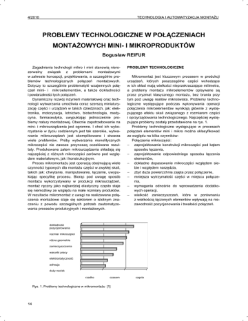 4/2010 TECHNOLOGIA I AUTOMATYZACJA MONTAŻU PROBLEMY TECHNOLOGICZNE W POŁĄCZENIACH MONTAŻOWYCH MINI- I MIKROPRODUKTÓW Bogusław REIFUR Zagadnienia technologii mikro i mini stanowią nierozerwalny związek z problemami montażowymi w zakresie koncepcji, projektowania, a szczególnie problemów technologicznych połączeń montażowych. Dotyczy to szczególnie problematyki wzajemnych połączeń mini- i mikroelementów, a także dokładności i powtarzalności tych połączeń. Dynamiczny rozwój inżynierii materiałowej oraz technologii wytwarzania umożliwia coraz szerszą miniaturyzację części i urządzeń w takich dziedzinach, jak: elektronika, motoryzacja, lotnictwo, biotechnologia, medycyna, farmaceutyka, uwypuklając jednocześnie problemy natury montażowej. Obecnie zapotrzebowanie na mini- i mikrourządzenia jest ogromne. I choć ich wykorzystanie w życiu codziennym jest tak szerokie, wytwarzanie mikrourządzeń jest skomplikowane i stwarza wiele problemów. Próby wytwarzania monolitycznych mikroczęści nie zawsze przynoszą oczekiwane rezultaty. Produkowane zatem mikrourządzenia składają się najczęściej z różnych mikroczęści zarówno pod względem materiałowym, jak i konstrukcyjnym. Proces mikromontażu jest operacją obejmującą wiele czynności typowych dla montażu części w zwykłej skali, takich jak: chwytanie, manipulowanie, łączenie, uwypuklając specyfikę procesu. Biorąc pod uwagę sposób montażu wykorzystywany w produkcji mikrourządzeń, montaż ręczny jako najbardziej elastyczny często staje się niemożliwy ze względu na małe rozmiary produktów. W rezultacie mikromontaż z uwagi na realizowane połączenia montażowe staje się sektorem o istotnym znaczeniu z powodu szczególnych potrzeb zautomatyzowania procesów produkcyjnych i montażowych. PROBLEMY TECHNOLOGICZNE Mikromontaż jest kluczowym procesem w produkcji urządzeń, których poszczególne części wchodzące w ich skład mają wielkości nieprzekraczające milimetra, a problemy montażu mikroelementów opisywane są przez pryzmat klasycznego montażu, bez brania przy tym pod uwagę realiów mikroświata. Problemy technologiczne występujące podczas wykonywania operacji połączenia mikroelementów wynikają głównie z występującego efektu skali związanego z rozmiarem części i oprzyrządowania technologicznego. Najczęściej występujące problemy zostały przedstawione na rys. 1. Problemy technologiczne występujące w procesach połączeń elementów mini i mikro można sklasyfikować ze względu na kilka czynników: Połączenia mikroczęści: − zaprojektowanie konstrukcji mikroczęści pod kątem sposobu łączenia, − zaprojektowanie odpowiedniego sposobu łączenia elementów, − dokładne dopasowanie mikroczęści względem siebie i względem narzędzia, − zbyt duża powierzchnia zajęta przez połączenie, − mniejsza wytrzymałość części w miejscu połączenia, − wymagania odnośnie do wprowadzenia dodatkowych operacji, − wielkość zanieczyszczeń, które w porównaniu z wielkością łączonych elementów wpływają na niezawodność pozycjonowania i trwałości połączeń. dokładność pozycjonowania rozmiar mikroczęści różna geometria zanieczyszczenia warunki pracy elektrostatyczność adhezja duży nacisk rzadko czasem Rys. 1. Problemy technologiczne w mikromontażu [1] 14 często TECHNOLOGIA I AUTOMATYZACJA MONTAŻU − − − − − − 4/2010 Mikroczęści i mikrochwytaki: zaprojektowanie części zgodnie z zasadami mikromontażu, odpowiedni dobór mikrochwytaka do zadań montażowych, odpowiednie zabezpieczenie podczas operacji transportowania i składowania. Występujące siły: siły przyczepności pomiędzy chwytakiem a mikroczęścią, uniemożliwiające jej uwolnienie z chwytaka i dokładne umiejscowienie, a także przyciąganie części przez mikrochwytak, siły przyczepności pomiędzy mikroczęściami powodujące przyciąganie jednej części przez drugą, co uniemożliwia dokładne pozycjonowanie mikroczęści. Systemy wizyjne: odpowiedni dobór systemów wizyjnych niezbędnych do wykonania operacji mikromontażowych. MIKROCZĘŚCI – SPOSOBY ŁĄCZENIA Rozwój inżynierii materiałowej i technologii wytwarzania spowodował powstanie szerokiej gamy mikroczęści i mikrourządzeń, których wielkość jest często mniejsza od jednego milimetra. Ze względu na swoje wymiary wyroby mini i mikro są w większości przypadków niewidoczne gołym okiem, jednakże ich znaczenie w telekomunikacji, przemyśle zegarowym, medycynie, przemyśle motoryzacyjnym i chemicznym rośnie dynamicznie [1]. W tabeli 1 przedstawiono skale, w jakich produkowane są części montażowe, możliwe dokładności ich pozycjonowania oraz instrumenty potrzebne do ich wizualizacji. Przy projektowaniu wszelkich mikrourządzeń należy mieć głównie na uwadze ich późniejszy montaż. W szczególności, projektując mikroczęści, bierze się pod uwagę trzy główne aspekty: − funkcję, którą każda część ma spełniać wewnątrz mikrourządzenia, − metodę łączenia mikroczęści tworzących funkcjonalną całość, − pewność, że mikroczęści mogą być odpowiednio manipulowane w trakcie procesu mikromontażu. Warto zauważyć, że te trzy punkty są uszeregowane w zależności od ich znaczenia. Innymi słowy, funkcjonalność mikroczęści jest ważniejsza niż metoda łączenia, która jest z kolei ważniejsza od zgodności z procesem montażu. Niezależnie od kształtu lub funkcji, którą dana mikroczęść spełnia, wymaga się przy jej projektowaniu zwrócenia uwagi na trzy szczególne elementy. Po pierwsze, wszystkie mikroczęści są projektowane z uwzględnieniem elementu mocującego części do podłoża, który pozwala na ich bezpieczne przechowywanie i transportowanie oraz łamanie się w pewny i przewidywalny sposób, gdy mikrochwytak łapie część (ang. Tether feature). Po drugie, powinny posiadać element służący