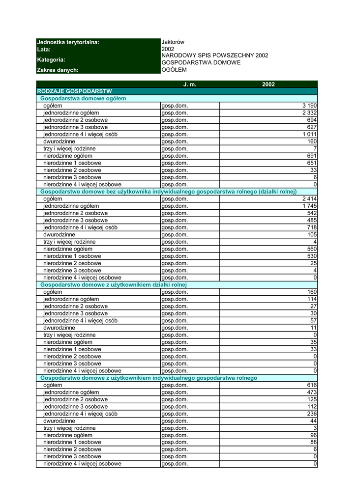 Jednostka terytorialna: Lata: Kategoria: Zakres danych: Jaktorów 2002 NARODOWY SPIS POWSZECHNY 2002 GOSPODARSTWA DOMOWE OGÓŁEM J. m. 2002 RODZAJE GOSPODARSTW Gospodarstwa domowe ogółem ogółem gosp.dom. jednorodzinne ogółem gosp.dom. jednorodzinne 2 osobowe gosp.dom. jednorodzinne 3 osobowe gosp.dom. jednorodzinne 4 i więcej osób gosp.dom. dwurodzinne gosp.dom. trzy i więcej rodzinne gosp.dom. nierodzinne ogółem gosp.dom. nierodzinne 1 osobowe gosp.dom. nierodzinne 2 osobowe gosp.dom. nierodzinne 3 osobowe gosp.dom. nierodzinne 4 i więcej osobowe gosp.dom. Gospodarstwo domowe bez uŜytkownika indywidualnego gospodarstwa rolnego (działki rolnej) ogółem gosp.dom. jednorodzinne ogółem gosp.dom. jednorodzinne 2 osobowe gosp.dom. jednorodzinne 3 osobowe gosp.dom. jednorodzinne 4 i więcej osób gosp.dom. dwurodzinne gosp.dom. trzy i więcej rodzinne gosp.dom. nierodzinne ogółem gosp.dom. nierodzinne 1 osobowe gosp.dom. nierodzinne 2 osobowe gosp.dom. nierodzinne 3 osobowe gosp.dom. nierodzinne 4 i więcej osobowe gosp.dom. Gospodarstwo domowe z uŜytkownikiem działki rolnej ogółem gosp.dom. jednorodzinne ogółem gosp.dom. jednorodzinne 2 osobowe gosp.dom. jednorodzinne 3 osobowe gosp.dom. jednorodzinne 4 i więcej osób gosp.dom. dwurodzinne gosp.dom. trzy i więcej rodzinne gosp.dom. nierodzinne ogółem gosp.dom. nierodzinne 1 osobowe gosp.dom. nierodzinne 2 osobowe gosp.dom. nierodzinne 3 osobowe gosp.dom. nierodzinne 4 i więcej osobowe gosp.dom. Gospodarstwo domowe z uŜytkownikiem indywidualnego gospodarstwa rolnego ogółem gosp.dom. jednorodzinne ogółem gosp.dom. jednorodzinne 2 osobowe gosp.dom. jednorodzinne 3 osobowe gosp.dom. jednorodzinne 4 i więcej osób gosp.dom. dwurodzinne gosp.dom. trzy i więcej rodzinne gosp.dom. nierodzinne ogółem gosp.dom. nierodzinne 1 osobowe gosp.dom. nierodzinne 2 osobowe gosp.dom. nierodzinne 3 osobowe gosp.dom. nierodzinne 4 i więcej osobowe gosp.dom. 3 190 2 332 694 627 1 011 160 7 691 651 33 6 0 2 414 1 745 542 485 718 105 4 560 530 25 4 0 160 114 27 30 57 11 0 35 33 0 0 0 616 473 125 112 236 44 3 96 88 6 0 0 Gospodarstwo domowe z właścicielem zwierząt gospodarskich ogółem gosp.dom. jednorodzinne ogółem gosp.dom. jednorodzinne 2 osobowe gosp.dom. jednorodzinne 3 osobowe gosp.dom. jednorodzinne 4 i więcej osób gosp.dom. dwurodzinne gosp.dom. trzy i więcej rodzinne gosp.dom. nierodzinne ogółem gosp.dom. nierodzinne 1 osobowe gosp.dom. nierodzinne 2 osobowe gosp.dom. nierodzinne 3 osobowe gosp.dom. nierodzinne 4 i więcej osobowe gosp.dom. GŁÓWNE ŹRÓDŁO UTRZYMANIA Gospodarstwa domowe źródło utrzymania praca najemna poza rolnictwem w sektorze publicznym ogółem gosp.dom. 1 gosp.dom. 2 gosp.dom. 3 gosp.dom. 4 i więcej gosp.dom. poza rolnictwem w sektorze prywatnym ogółem gosp.dom. 1 gosp.dom. 2 gosp.dom. 3 gosp.dom. 4 i więcej gosp.dom. w rolnictwie w sektorze publicznym ogółem gosp.dom. 1 gosp.dom. 2 gosp.dom. 3 gosp.dom. 4 i więcej gosp.dom. w rolnictwie w sektorze prywatnym ogółem gosp.dom. 1 gosp.dom. 2 gosp.dom. 3 gosp.dom. 4 i więcej gosp.dom. Gospodarstwa domowe źródło utrzymania praca na rachunek własny poza rolnictwem ogółem gosp.dom. 1 gosp.dom. 2 gosp.dom. 3 gosp.dom. 4 i więcej gosp.dom. w swoim gospodarstwie rolnym ogółem gosp.dom. 1 gosp.dom. 2 gosp.dom. 3 gosp.dom. 4 i więcej gosp.dom. w rolnictwie poza swoim gospodarstwem rolnym ogółem gosp.dom. 1 gosp.dom. 2 gosp.dom. 3 gosp.dom. 4 i więcej gosp.dom. Gospodarstwa domowe źródło utrzymania niezarobkowe emerytura pracownicza, kombatancka i pochodne 0 0 0 0 0 0 0 0 0 0 0 0 562 47 82 127 306 844 82 110 213 439 0 0 0 0 0 3 0 0 0 0 220 26 26 45 123 64 4 13 10 37 5 0 0 0 0 ogółem gosp.dom. 1 gosp.dom. 2 gosp.dom. 3 gosp.dom. 4 i więcej gosp.dom. emerytura rolna ogółem gosp.dom. 1 gosp.dom. 2 gosp.dom. 3 gosp.dom. 4 i więcej gosp.dom. renta z tytułu niezdolności do pracy ogółem gosp.dom. 1 gosp.dom. 2 gosp.dom. 3 gosp.dom. 4 i więcej gosp.dom. renta socjalna ogółem gosp.dom. 1 gosp.dom. 2 gosp.dom. 3 gosp.dom. 4 i więcej gosp.dom. renta rodzinna ogółem gosp.dom. 1 gosp.dom. 2 gosp.dom. 3 gosp.dom. 4 i więcej gosp.dom. zasiłek dla bezrobotnych ogółem gosp.dom. 1 gosp.dom. 2 gosp.dom. 3 gosp.dom. 4 i więcej gosp.dom. zasiłek pomocy społecznej ogółem gosp.dom. 1 gosp.dom. 2 gosp.dom. 3 gosp.dom. 4 i więcej gosp.dom. inne niezarobkowe źródło ogółem gosp.dom. 1 gosp.dom. 2 gosp.dom. 3 gosp.dom. 4 i więcej gosp.dom. Gospodarstwa domowe źródło utrzymania inne dochody dochody z własności ogółem gosp.dom. 1 gosp.dom. 2 gosp.dom. 3 gosp.dom. 4 i więcej gosp.dom. dochody z najmu ogółem gosp.dom. 1 gosp.dom. 2 gosp.dom. 3 gosp.dom. 4 i więcej gosp.dom. 666 224 285 97 60 51 24 14 9 4 493 128 143 83 139 20 10 3 3 4 91 55 12 7 17 29 7 5 6 11 25 9 4 5 7 48 6 8 16 18 4 0 0 0 0 0 0 0 0 0 Gospodarstwa domowe źródło utrzymania na utrzymaniu ogółem gosp.dom. 1 gosp.dom. 2 gosp.dom. 3 gosp.dom. 4 i więcej gosp.dom. Gospodarstwa domowe źródło utrzymania nieustalone ogółem gosp.dom. 1 gosp.dom. 2 gosp.dom. 3 gosp.dom. 4 i więcej gosp.dom. GOSPODARSTWA DOMOWE W MIESZKANIACH Gospodarstwa domowe wg liczby osób gospodarstwa ogółem ogółem gosp.dom. 1 osoba gosp.dom. 2 osoby gosp.dom. 3 osoby gosp.dom. 4 osoby gosp.dom. 5 osób i więcej gosp.dom. gospodarstwo mieszkające samodzielnie w mieszkaniu ogółem gosp.dom. 1 osoba gosp.dom. 2 osoby gosp.dom. 3 osoby gosp.dom. 4 osoby gosp.dom. 5 osób i więcej gosp.dom. ludność w gospodarstwach ogółem ogółem osoba 1 osoba osoba 2 osoby osoba 3 osoby osoba 4 osoby osoba 5 osób i więcej osoba gospodarstwo mieszkające samodzielnie w mieszkaniu ogółem osoba 1 osoba osoba 2 osoby osoba 3 osoby osoba 4 osoby osoba 5 osób i więcej osoba Gospodarstwa domowe wg typu gospodarstwa i liczby rodzin w gospodarstwie ogółem ogółem gosp.dom. jednorodzinne gosp.dom. dwurodzinne gosp.dom. jednoosobowe gosp.dom. nierodzinne gosp.dom. gospodarstw