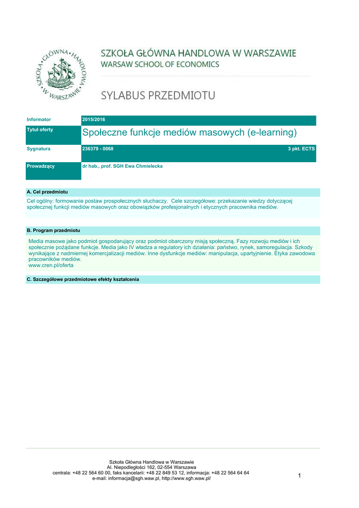Informator 2015/2016 7\WXáRIHUW\ 6SRáHF]QHIXQNFMHPHGLyZPDVRZ\FKHOHDUQLQJ Sygnatura 236379 - 0068 3URZDG]ąF\ dr hab., prof. SGH Ewa Chmielecka 3 pkt. ECTS A. Cel przedmiotu &HORJyOQ\IRUPRZDQLHSRVWDZSURVSRáHF]Q\FKVáXFKDF]\&HOHV]F]HJyáRZHSU]HND]DQLHZLHG]\GRW\F]ąFHM VSRáHF]QHMIXQNFMLPHGLyZPDVRZ\FKRUD]RERZLą]NyZSURIHVMRQDOQ\FKLHW\F]Q\FK pracownika mediów. B. Program przedmiotu 0HGLDPDVRZHMDNRSRGPLRWJRVSRGDUXMąF\RUD]SRGPLRWREDUF]RQ\PLVMąVSRáHF]Qą)D]\UR]ZRMXPHGLyZLLFK VSRáHF]QLHSRĪąGDQHIXQNFMH0HGLDMDNR,9ZáDG]DDUHJXODWRU\LFKG]LDáDQLDSDĔVWZRU\QHNVDPRUHJXODFMD6]NRG\ Z\QLNDMąFH]QDGPLHUQHMNRPHUFMDOL]DFMLPHGLyZ,QQHG\VIXQNFMHPHGLyZPDQLSXODFMDXSDUW\MQLHQLH(W\ND]DZRGRZD pracowników mediów. www.cren.pl/oferta &6]F]HJyáRZHSU]HGPLRWRZHHIHNW\NV]WDáFHQLD 6]NRáD*áyZQD+DQGORZDZ:DUV]DZLH $O1LHSRGOHJáRĞFL162, 02-554 Warszawa centrala: +48 22 564 60 00, faks kancelarii: +48 22 849 53 12, informacja: +48 22 564 64 64 e-mail: [email protected], http://www.sgh.waw.pl/ 1 FG6SRáHF]QHIXQNFMHPHGLyZPDVRZ\FKHOHDUQLQJ Wiedza 1'HILQLRZDQLHLSU]\VZRMHQLHSRGVWDZRZ\FKSRMĊüGRW\F]ąF\FKSUREOHPDW\NLPHGLyZ masowych. 25R]XPLHQLHZ]UDVWDMąFHMUROLPHGLyZZĪ\FLXVSRáHF]Q\PV]DQVL]DJURĪHĔMDNLHQLHVLHWHQ rozwój. 3=QDMRPRĞüID]UR]ZRMXPHGLyZPDVRZ\FK 45R]UyĪQLHQLHSRPLĊG]\IXQNFMDPLDPLVMąPHGLyZPDVRZ\FK 5=UR]XPLHQLHVSORWXF]\QQLNyZEL]QHVRZ\FKLPLV\MQ\FKZG]LDáDOQRĞFLPHGLyZ 65R]XPLHQLHUHODFMLSRPLĊG]\HOLWDPLVSRáHF]Q\PLDPHGLDPL 7,GHQW\ILNDFMDL]UR]XPLHQLHSRGVWDZRZ\FKNRQIOLNWyZPRUDOQ\FK]ZLą]DQ\FK]SUDFąZ mediach. 85R]SR]QDZDQLHSRGVWDZRZ\FKSDWRORJLLZ\VWĊSXMąF\FKZIXQNFMRQRZDQLXPHGLyZ masowych oraz sposobów zaradczych. 8PLHMĊWQRĞFL 1&]\WDQLH]H]UR]XPLHQLHPWHNVWyZ]OLWHUDWXU\IDFKRZHMSRĞZLĊFRQHMWHPDW\FHPHGLyZ 2$QDOL]RZDQLHSRGVWDZRZ\FKSU]HND]yZPHGLDOQ\FK]HZ]JOĊGXQDPLVMĊLIXQNFMHPHGLyZ 32GELyUSU]HND]yZ]Z\ĪV]\PVWRSQLHPĞZLDGRPRĞFLLFKWUHĞFLMDZQHMLXNU\WHM 4,GHQW\ILNDFMDID]UR]ZRMXSRV]F]HJyOQ\FKPHGLyZZVSyáF]HĞQLHZ3ROVFH 5. Interpretowanie decyzji podejmowanych przez zinstytucjonalizowane regulatory mediów. 63UH]HQWRZDQLHZPRZLHLOXESLĞPLHZ\EUDQ\FK]DJDGQLHĔ]]DNUHVXWHPDW\F]QHJR]DMĊü Kompetencje VSRáHF]QH 1. Aktywna postawa wobec form realizacji misji przez media. 2.U\W\F\]PZREHFQDGXĪ\üQDUXV]DQLDWHMPLVMLLIXQNFML 33RWU]HEDWURVNLRNXOWXUĊZ\VRNą 43RVWU]HJDQLHRJUDQLF]HĔQDU]ĊG]LVWRVRZDQ\FKZPHGLDFKGOD]DEH]SLHF]HQLDLFKPLVML 5:UDĪOLZRĞüQDQDUXV]HQLDVIHU\HW\NLG]LHQQLNDUVNLHM '6HPHVWUDOQ\SODQ]DMĊü 1 &]\PVąPHGLDPDVRZHF], 2 &]\PVąPHGLDPDVRZHF],, 3 Rozwój mediów masowych: historia, etapy, mechanizmy. 4 0HGLDMDNRLQVWUXPHQWZáDG]\VSRáHF]QHM 5 0HGLDMDNREL]QHVU\QHNMDNRUHJXODWRULFKG]LDáDOQRĞFL 6 0HGLDMDNRLQVWUXPHQWZáDG]\VSRáHF]QHM 7 Media a ludzie: interakcje media - odbiorca. 8 Media a ludzie: odbiorcy i nadawcy. 9 :HZQĊWU]QHUHJXODWRU\G]LDáDOQRĞFLPHGLyZQDGDZF\LLFKXZDUXQNRZDQLD 10 :HZQĊWU]QHUHJXODWRU\G]LDáDOQRĞFLPHGLyZHW\NDPHGLyZ (/LWHUDWXUDSRGVWDZRZDRERZLą]NRZHSRGUĊF]QLNL 7UHĞFLZ\NáDGyZHOHDUQLQJRZ\FK'RGDWNRZRZ\EUDQHIUDJPHQW\0UR]RZVNL00HGLDPDVRZHZáDG]DUR]U\ZND biznes Oficyna Wydawnicza ASPRA-JR, 2001; Goban-Klas T., Media i komunikowanie masowe, Wyd. Naukowe PWN, 1999=ELyUGRNXPHQWyZGRW\F]ąF\FKPHGLyZPDVRZ\FKXVWDZUDSRUWyZFLDá]DU]ąG]DMąF\FKPHGLDPLOXENXOWXUąUDG etyki mediów itd. )/LWHUDWXUDX]XSHáQLDMąFD Kunczik M., Zipfel A., Wprowadzenie do nauki o dziennikarstwie i komunikowaniu. 6]NRáD*áyZQD+DQGORZDZ:DUV]DZLH $O1LHSRGOHJáRĞFL162, 02-554 Warszawa centrala: +48 22 564 60 00, faks kancelarii: +48 22 849 53 12, informacja: +48 22 564 64 64 e-mail: [email protected], http://www.sgh.waw.pl/ 2 FG6SRáHF]QHIXQNFMHPHGLyZPDVRZ\FKHOHDUQLQJ *1DMZDĪQLHMV]HSXEOLNDFMHDXWRUDyZGRW\F]ąFHSURSRQRZDQ\FK]DMĊü ,QIRUPDFMDZLHG]DPąGURĞü&RVSRáHF]HĔVWZRZLHG]\FHQLüSRZLQQR"1DXNDL6]NROQLFWZR:\ĪV]HQU1/23/2004, s.7 -18. H. Sygnatury wymaganych prerekwizytów QLHVąZ\PDJDQH ,:\PLDULIRUPD]DMĊü Stacj. Sob. niedz. 3RSRáXG 2JyáHP 30 14 30 e-learning 30 14 30 -(OHPHQW\RFHQ\NRĔFRZHM egzamin tradycyjny 60% üZLF]HQLD 40% .:\PDJDQD]QDMRPRĞüMĊ]\NDREFHJR nie jest wymagana L. Kryteria selekcji 00HWRG\SURZDG]HQLD]DMĊü kejsy referaty dyskusje 6]NRáD*áyZQD+DQGORZDZ:DUV]DZLH $O1LHSRGOHJáRĞFL162, 02-554 Warszawa centrala: +48 22 564 60 00, faks kancelarii: +48 22 849 53 12, informacja: +48 22 564 64 64 e-mail: [email protected], http://www.sgh.waw.pl/ 3