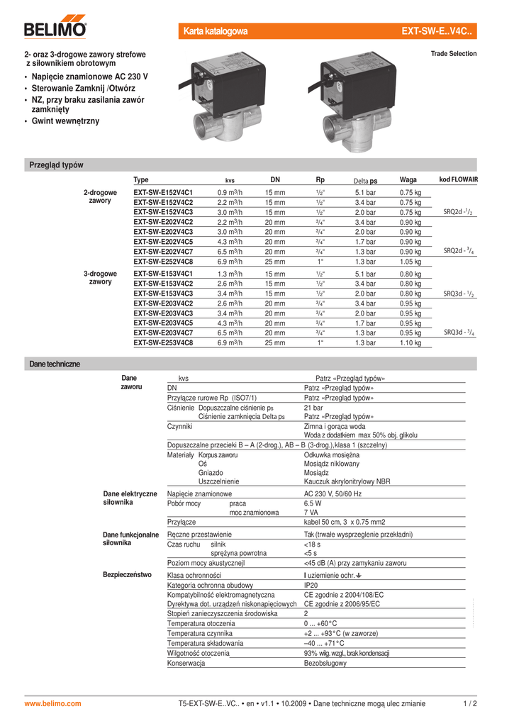 Karta katalogowa EXT-SW-E..V4C.. 2- oraz 3-drogowe zawory strefowe z siłownikiem obrotowym Trade Selection • Napięcie znamionowe AC 230 V • Sterowanie Zamknij /Otwórz • NZ, przy braku zasilania zawór zamknięty • Gwint wewnętrzny Przegląd typów Type 2-drogowe zawory 3-drogowe zawory kvs DN Rp Delta ps Waga EXT-SW-E152V4C1 EXT-SW-E152V4C2 EXT-SW-E152V4C3 EXT-SW-E202V4C2 EXT-SW-E202V4C3 EXT-SW-E202V4C5 EXT-SW-E202V4C7 EXT-SW-E252V4C8 0.9 m3/h 2.2 m3/h 3.0 m3/h 2.2 m3/h 3.0 m3/h 4.3 m3/h 6.5 m3/h 6.9 m3/h 15 mm 15 mm 15 mm 20 mm 20 mm 20 mm 20 mm 25 mm ¹/₂“ ¹/₂“ ¹/₂“ ³/₄“ ³/₄“ ³/₄“ ³/₄“ 1“ 5.1 bar 3.4 bar 2.0 bar 3.4 bar 2.0 bar 1.7 bar 1.3 bar 1.3 bar 0.75 kg 0.75 kg 0.75 kg 0.90 kg 0.90 kg 0.90 kg 0.90 kg 1.05 kg EXT-SW-E153V4C1 EXT-SW-E153V4C2 EXT-SW-E153V4C3 EXT-SW-E203V4C2 EXT-SW-E203V4C3 EXT-SW-E203V4C5 EXT-SW-E203V4C7 EXT-SW-E253V4C8 1.3 m3/h 2.6 m3/h 3.4 m3/h 2.6 m3/h 3.4 m3/h 4.3 m3/h 6.5 m3/h 6.9 m3/h 15 mm 15 mm 15 mm 20 mm 20 mm 20 mm 20 mm 25 mm ¹/₂“ ¹/₂“ ¹/₂“ ³/₄“ ³/₄“ ³/₄“ ³/₄“ 1“ 5.1 bar 3.4 bar 2.0 bar 3.4 bar 2.0 bar 1.7 bar 1.3 bar 1.3 bar 0.80 kg 0.80 kg 0.80 kg 0.95 kg 0.95 kg 0.95 kg 0.95 kg 1.10 kg kod FLOWAIR SRQ2d -1/2 SRQ2d - ³/4 SRQ3d - 1/2 SRQ3d - 3/4 Dane techniczne Dane zaworu www.belimo.com kvs DN Przyłącze rurowe Rp (ISO7/1) Ciśnienie Dopuszczalne ciśnienie ps Ciśnienie zamknięcia Delta ps Czynniki Patrz «Przegląd typów» Patrz «Przegląd typów» Patrz «Przegląd typów» 21 bar Patrz «Przegląd typów» Zimna i gorąca woda Woda z dodatkiem max 50% obj. glikolu Dopuszczalne przecieki B – A (2-drog.), AB – B (3-drog.), klasa 1 (szczelny) Materiały Korpus zaworu Odkuwka mosiężna Oś Mosiądz niklowany Gniazdo Mosiądz Uszczelnienie Kauczuk akrylonitrylowy NBR Dane elektryczne siłownika Napięcie znamionowe Pobór mocy praca moc znamionowa Przyłącze AC 230 V, 50/60 Hz 6.5 W 7 VA kabel 50 cm, 3 x 0.75 mm2 Dane funkcjonalne siłownika Ręczne przestawienie Czas ruchu silnik sprężyna powrotna Poziom mocy akustycznejl Tak (trwałe wysprzeglenie przekładni) <18 s <5 s <45 dB (A) przy zamykaniu zaworu Bezpieczeństwo Klasa ochronności Kategoria ochronna obudowy Kompatybilność elektromagnetyczna Dyrektywa dot. urządzeń niskonapięciowych Stopień zanieczyszczenia środowiska Temperatura otoczenia Temperatura czynnika Temperatura składowania Wilgotność otoczenia Konserwacja I uziemienie ochr. IP20 CE zgodnie z 2004/108/EC CE zgodnie z 2006/95/EC 2 0 ... +60°C +2 ... +93°C (w zaworze) –40 ... +71°C 93% wilg. wzgl., brak kondensacji Bezobsługowy T5-EXT-SW-E..VC.. • en • v1.1 • 10.2009 • Dane techniczne mogą ulec zmianie .. .. .. .. .. .. .. .. . 1/2 EXT-SW-E..V4C.. 2- oraz 3-drogowe zawory strefowe z siłownikiem elektrycznym, AC 230 V Dane techniczne (Ciąg dalszy) Wymiary Masa Wymiary / Masa Patrz «Wymiary» Patrz«Przegląd typów» Uwagi dotyczące bezpieczęństwa • Urządzenia pozycjonujące są przeznaczone do stosowania w stacjonarnych systemach grzewczych, wentylacyjnych i klimatyzacyjnych. Nie wolno ich stosować w dziedzinach innych niż wymienione w dokumentacji, w szczególności nie mogą być stosowane w samolotach, ani innych środkach transportu powietrznego. ! .. .. . • Uwaga: Napięcie sieciowe! • Montaż może być wykonywany wyłącznie przez osoby o odpowiednim przeszkoleniu. Podczas montażu przestrzegać obowiązujących przepisów i norm • Urządzenie może być otwierane tylko przez producenta. Użytkownik nie może ani wymieniać, ani naprawiać żadnych elementów urządzenia. • Nie wolno odłączać kabla od urządzenia. • Urządzenie zawiera elementy elektroniczne. Nie wolno go wyrzucać wraz z odpadami domowymi. Ze zużytym lub uszkodzonym siłownikiem/zaworem trzeba postępować zgodnie z obowiązującymi przepisami dotyczącymi utylizacji odpadów. • Podczas montażu trzeba uwzględnić wbudowane podzespoły, zabezpieczenie przed porażeniem prądem elektrycznym oraz innymi niebezpieczeństwami. .. .. . .. .. .. .. .. Cechy charakterystyczne wyrobu Kombinacja zawór / siłownik Zawór i siłownik są dostarczane zmontowane jako jedno urządzenie Połączenia elektryczne 230 V N L1 SchematAC połączeń Uwaga: Uwaga: Napięcie sieciowe ! ! 1 2 3 M Siłownik obr. Zawór obr. L1 B–A = L1 B–A = 100% 0% B A Siłownik obr. Zawór obr. L1 AB – B = 0% AB – A = 100% B – A = 0% L1 A AB – B = 100% B AB AB – A = 0% B – A = 0% Wymiary [mm] Rysunki wymiarowe 97 83 66 B BA EXT-SW-E152V4C.. 15 ¹/₂“ 70 EXT-SW-E202V4C.. 20 ³/₄“ 70 EXT-SW-E252V4C.. 25 1“ 87 EXT-SW-E153V4C.. 15 ¹/₂“ 87 86 86 93 93 23 37 23 – EXT-SW-E203V4C.. 20 ³/₄“ 94 EXT-SW-E253V4C.. 25 1“ 94 95 95 – – A AB – – – 37 25 42 Warranty period 2/2 B A H2 DN Rp L1 L2 H1 H2 H1 Typ 85 82 62 min. 130 .. .. .. .. .. .. .. .. .. .. .. .. .. .. .. .. .. .. .. .. .. AB L1 L2 min. 85 Produkty z linii Belimo Trade Selection są montowane przez niezależną firmę i są zgodne z naszymi specyfikacjami. Produkty z linii Belimo Trade Selection podlegają naszym standardowym warunkom handlowym i są objęte 2-letnią gwarancją. Okres gwarancyjny jest liczony od daty dostawy. T5-EXT-SW-E..VC.. • en • v1.1 • 10.2009 • Dane techniczne mogą ulec zmianie. www.belimo.com