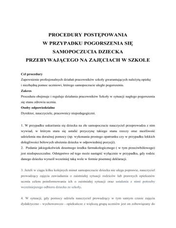 PROCEDURY POSTĘPOWANIA W PRZYPADKU POGORSZENIA SIĘ SAMOPOCZUCIA DZIECKA PRZEBYWAJĄCEGO NA ZAJĘCIACH W SZKOLE Cel procedury Zapewnienie profesjonalnych działań pracowników szkoły gwarantujących należytą opiekę i niezbędną pomoc uczniowi, którego samopoczucie uległo pogorszeniu. Zakres Procedura obejmuje i reguluje działania pracowników Szkoły w sytuacji nagłego pogorszenia się stanu zdrowia ucznia. Osoby odpowiedzialne Dyrektor, nauczyciele, pracownicy niepedagogiczni. 1. W przypadku uskarżania się dziecka na złe samopoczucie nauczyciel przeprowadza z nim wywiad, w którym stara się ustalić przyczynę takiego stanu rzeczy oraz możliwość udzielenia mu doraźnej pomocy (np. wykonania prostego opatrunku czy w przypadku lekkich dolegliwości bólowych ułożenia dziecka w odpowiedniej pozycji). 2. Podanie jakiegokolwiek doustnego środka farmakologicznego ( w tym przeciwbólowego) jest niedopuszczalne. Odstępstwo od tego może nastąpić wyłącznie w przypadku, gdy rodzic danego dziecka wyraził wcześniej taką wole w formie pisemnej deklaracji. 3. Jeżeli w ciągu kilku kolejnych minut samopoczucie dziecka nie ulega poprawie, nauczyciel prowadzący zajęcia zawiadamia o zaistniałej sytuacji rodziców lub prawnych opiekunów ucznia celem poinformowania ich o zaistniałej sytuacji oraz ustalenia z nimi potrzeby wcześniejszego odbioru dziecka ze szkoły. 4. W sytuacji, gdy pomocy udziela nauczyciel prowadzący w tym samym czasie zajęcia dydaktyczno - wychowawczo - opiekuńcze z większą grupą uczniów jest on zobowiązany do ustalenia dla nich tymczasowego opiekuna. O chwilowy nadzór może on poprosić nauczyciela uczącego w najbliżej sąsiadującej sali lekcyjnej. Pozostawienie uczniów bez opieki jest niedopuszczalne! 5.Oczekując na przybycie rodzica, uczeń pozostaje w sali, w której ma zajęcia pod opieką nauczyciela, który te zajęcia prowadzi lub dyskretnie zostaje przeprowadzony w spokojne miejsce (np. gabinet pedagoga szkolnego lub sekretariat szkoły). Należy pamiętać, że dla poszkodowanego dziecka istotne jest, aby zapewnić mu komfort psychiczny. Uczniowi przez cały czas oczekiwania na przybycie rodziców towarzyszy nauczyciel interweniujący lub inna osoba dorosła będąca pracownikiem szkoły. 6. Po przybyciu do szkoły rodziców ( opiekunów prawnych ) udziela się wyczerpującej informacji o zdarzeniu oraz wszelkiej koniecznej pomocy. 7. W przypadku, gdy rodzice nie mogą odebrać dziecka, a stan jego zdrowia pogarsza się wzywane jest pogotowie. W takim przypadku o zaistniałej sytuacji informuje się Dyrektora Szkoły. 8. Informację o zaistniałej sytuacji zamieszcza się w dzienniku zajęć. Procedury postępowania w przypadku pogorszenia się samopoczucia dziecka przebywającego na zajęciach w szkole zostały zatwierdzone uchwałą Rady Pedagogicznej nr 24/2013/14 z dn. 26.03.2014 r. Procedury postępowania w przypadku pogorszenia się samopoczucia dziecka przebywającego na zajęciach w szkole obowiązują od dn. 27.03.2014 r.