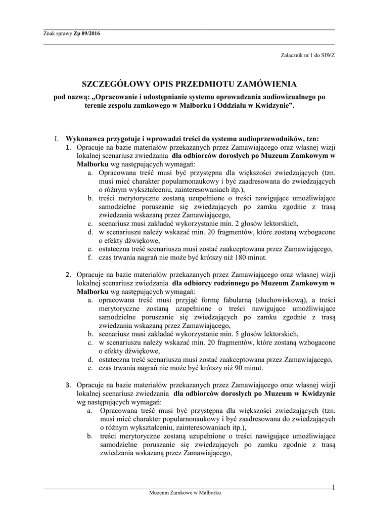 _______________________________________________________________________________ Znak sprawy Zp 09/2016 _______________________________________________________________________________ Załącznik nr 1 do SIWZ SZCZEGÓŁOWY OPIS PRZEDMIOTU ZAMÓWIENIA pod nazwą: „Opracowanie i udostępnianie systemu oprowadzania audiowizualnego po terenie zespołu zamkowego w Malborku i Oddziału w Kwidzynie”. I. Wykonawca przygotuje i wprowadzi treści do systemu audioprzewodników, tzn: 1. Opracuje na bazie materiałów przekazanych przez Zamawiającego oraz własnej wizji lokalnej scenariusz zwiedzania dla odbiorców dorosłych po Muzeum Zamkowym w Malborku wg następujących wymagań: a. Opracowana treść musi być przystępna dla większości zwiedzających (tzn. musi mieć charakter popularnonaukowy i być zaadresowana do zwiedzających o różnym wykształceniu, zainteresowaniach itp.), b. treści merytoryczne zostaną uzupełnione o treści nawigujące umożliwiające samodzielne poruszanie się zwiedzających po zamku zgodnie z trasą zwiedzania wskazaną przez Zamawiającego, c. scenariusz musi zakładać wykorzystanie min. 2 głosów lektorskich, d. w scenariuszu należy wskazać min. 20 fragmentów, które zostaną wzbogacone o efekty dźwiękowe, e. ostateczna treść scenariusza musi zostać zaakceptowana przez Zamawiającego, f. czas trwania nagrań nie może być krótszy niż 180 minut. 2. Opracuje na bazie materiałów przekazanych przez Zamawiającego oraz własnej wizji lokalnej scenariusz zwiedzania dla odbiorcy rodzinnego po Muzeum Zamkowym w Malborku wg następujących wymagań: a. opracowana treść musi przyjąć formę fabularną (słuchowiskową), a treści merytoryczne zostaną uzupełnione o treści nawigujące umożliwiające samodzielne poruszanie się zwiedzających po zamku zgodnie z trasą zwiedzania wskazaną przez Zamawiającego, b. scenariusz musi zakładać wykorzystanie min. 5 głosów lektorskich, c. w scenariuszu należy wskazać min. 20 fragmentów, które zostaną wzbogacone o efekty dźwiękowe, d. ostateczna treść scenariusza musi zostać zaakceptowana przez Zamawiającego, e. czas trwania nagrań nie może być krótszy niż 90 minut. 3. Opracuje na bazie materiałów przekazanych przez Zamawiającego oraz własnej wizji lokalnej scenariusz zwiedzania dla odbiorców dorosłych po Muzeum w Kwidzynie wg następujących wymagań: a. Opracowana treść musi być przystępna dla większości zwiedzających (tzn. musi mieć charakter popularnonaukowy i być zaadresowana do zwiedzających o różnym wykształceniu, zainteresowaniach itp.), b. treści merytoryczne zostaną uzupełnione o treści nawigujące umożliwiające samodzielne poruszanie się zwiedzających po zamku zgodnie z trasą zwiedzania wskazaną przez Zamawiającego, _________________________________________________________________________________________________________1 Muzeum Zamkowe w Malborku _______________________________________________________________________________ Znak sprawy Zp 09/2016 _______________________________________________________________________________ c. w scenariuszu należy wskazać min. 5 fragmentów, które zostaną wzbogacone o efekty dźwiękowe, d. ostateczna treść scenariusza musi zostać zaakceptowana przez Zamawiającego, e. czas trwania nagrania nie może być krótszy niż 30 minut. 4. Dokona tłumaczeń scenariusza dla odbiorców dorosłych wg następujących wytycznych: a. Języki tłumaczeń dla ścieżki dla odbiorców dorosłych po Muzeum Zamkowym w Malborku: angielski, niemiecki, francuski, hiszpański, rosyjski, włoski i migowy polski (PJM). b. Języki tłumaczeń dla ścieżki dla odbiorców dorosłych po Muzeum w Kwidzynie: angielski, niemiecki i rosyjski. 5. Wykona nagrania dźwiękowe wszystkich scenariuszy w języku polskim oraz językach obcych wskazanych w pkt 4 o następujących parametrach: a. wybrane osoby muszą być zawodowymi lektorami, b. język nagrania musi być ich pierwszym językiem (tzw. native speakerzy), c. liczba głosów będzie zgodna z wytycznymi dla konkretnych scenariuszy, d. wszystkie scenariusze, tłumaczenia i nagrania dla Muzeum Zamkowego w Malborku zostaną wykonane i zainstalowane w urządzeniach odsłuchowych w ciągu maksymalnie 30 dni od daty podpisania umowy, a dla Muzeum w Kwidzynie w ciągu 60 dni. e. W okresie trwania umowy Wykonawca ma obowiązek wprowadzać zmiany scenariuszy, tłumaczeń i nagrań zgodnie z oczekiwaniami Zamawiającego wynikającymi ze zmiany ekspozycji, tras itp., w czasie nie krótszym, niż określonym w umowie. II. Zestaw audioprzewodników będą stanowić urządzenia o parametrach nie gorszych niż: A. Parametry systemowe: 1. uruchamianie nagrań ma następować automatycznie w każdym z pomieszczeń oraz przestrzeniach otwartych, które wskazano w scenariuszach, o których mowa w pkt. I, 2. System musi zapewnić możliwość uruchamiania różnych nagrań w tych samych pomieszczeniach/ przestrzeniach otwartych, w momencie ich kilkukrotnego odwiedzenia przez zwiedzających, zależnie od odwiedzonych wcześniej przez nich przestrzeni, 3. System musi zapewnić możliwość uruchamiania różnych nagrań zależnie od godziny (np. inne komunikaty o miejscu zwrotu audioprzewodnika po zamknięciu jednego z punktów zdawania audioprzewodników), B. Parametry techniczne: 1. Ekran o minimalnej przekątnej 3”, na którym będą wyświetlane zdjęcia omawianych przestrzeni oraz będą pojawiały się graficzne wskazówki nawigacyjne (zdjęcia ze strzałkami kierunkującymi ruch turystyczny, itp.), 2. Możliwość odtwarzania wideo (lektor języka migowego), 3. Klawiatura przyciskowa, której klawisze mają następujące funkcje: przewijania do tyłu i do przodu, zwiększania i zmniejszania głośności, pauzowania i wznawiania nagrania, uruchomienie nagrania pomocy, powtórzenia nagrania, uruchomienia nagrania nawigacyjnego, 4. Czas ciągłej pracy bez ładowania min. 11 godzin, ____________