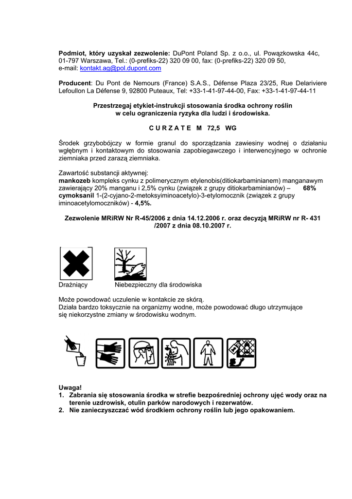 Podmiot, który uzyskał zezwolenie: DuPont Poland Sp. z o.o., ul. Powązkowska 44c, 01-797 Warszawa, Tel.: (0-prefiks-22) 320 09 00, fax: (0-prefiks-22) 320 09 50, e-mail: [email protected] Producent: Du Pont de Nemours (France) S.A.S., Défense Plaza 23/25, Rue Delariviere Lefoullon La Défense 9, 92800 Puteaux, Tel: +33-1-41-97-44-00, Fax: +33-1-41-97-44-11 Przestrzegaj etykiet-instrukcji stosowania środka ochrony roślin w celu ograniczenia ryzyka dla ludzi i środowiska. C U R Z A T E M 72,5 WG Środek grzybobójczy w formie granul do sporządzania zawiesiny wodnej o działaniu wgłębnym i kontaktowym do stosowania zapobiegawczego i interwencyjnego w ochronie ziemniaka przed zarazą ziemniaka. Zawartość substancji aktywnej: mankozeb kompleks cynku z polimerycznym etylenobis(ditiokarbaminianem) manganawym zawierający 20% manganu i 2,5% cynku (związek z grupy ditiokarbaminianów) – 68% cymoksanil 1-(2-cyjano-2-metoksyiminoacetylo)-3-etylomocznik (związek z grupy iminoacetylomoczników) - 4,5%. Zezwolenie MRiRW Nr R-45/2006 z dnia 14.12.2006 r. oraz decyzją MRiRW nr R- 431 /2007 z dnia 08.10.2007 r. Drażniący Niebezpieczny dla środowiska Może powodować uczulenie w kontakcie ze skórą. Działa bardzo toksycznie na organizmy wodne, może powodować długo utrzymujące się niekorzystne zmiany w środowisku wodnym. Uwaga! 1. Zabrania się stosowania środka w strefie bezpośredniej ochrony ujęć wody oraz na terenie uzdrowisk, otulin parków narodowych i rezerwatów. 2. Nie zanieczyszczać wód środkiem ochrony roślin lub jego opakowaniem. 2 ZAKRES STOSOWANIA, TERMINY I DAWKI ziemniak. - zaraza ziemniaka. Zalecana dawka: 2 kg/ha. Zalecana ilość wody: 200-400 l/ha. Zalecane opryskiwanie: drobnokropliste. Większą ilość wody stosować w uprawach zagęszczonych lub o silnie rozwiniętej naci ziemniaczanej. Pierwszy zabieg wykonywać zgodnie z sygnalizacją lub: • na odmianach wczesnych - w okresie zwierania się roślin w międzyrzędziach, • na odmianach późnych - z chwilą wystąpienia pierwszych objawów choroby w danym rejonie na odmianach wczesnych. Po wykonaniu pierwszego zabiegu środkiem o działaniu systemicznym lub środkiem Curzate M 72,5 WP, następne zabiegi wykonywać w miarę potrzeby co 7-14 dni. Krótszy odstęp między zabiegami co 7-10 dni zachowywać w warunkach większego zagrożenia patogenem oraz na odmianach podatnych na zarazę ziemniaka. OKRES KARENCJI (okres od dnia ostatniego zabiegu do dnia zbioru i przeznaczenia do konsumpcji): ziemniak - 11 dni, OKRES PREWENCJI DLA PSZCZÓŁ, LUDZI I ZWIERZĄT (okres zapobiegający zatruciu): NIE DOTYCZY. SPORZĄDZANIE CIECZY UŻYTKOWEJ Przed przystąpieniem do sporządzania cieczy użytkowej dokładnie ustalić potrzebną jej ilość. Odważoną ilość środka wymieszać w osobnym naczyniu z małą ilością wody, następnie wlać przez sito do zbiornika opryskiwacza napełnionego częściowo wodą (z włączonym mieszadłem) i uzupełnić wodą do potrzebnej ilości. Po wlaniu cieczy użytkowej do zbiornika opryskiwacza nie wyposażonego w mieszadło hydrauliczne ciecz mechaniczne wymieszać. Opryskiwać z włączonym mieszadłem. Opróżnione opakowania po środku przepłukać trzykrotnie wodą, a popłuczyny wlać do zbiornika opryskiwacza z cieczą użytkową. Po pracy aparaturę dokładnie wymyć. PRZECHOWYWANIE Przechowywać z dala od źródeł ciepła. 3 Przechowywać wyłącznie w oryginalnym opakowaniu w temperaturze nie niższej niż 0oC i nie wyższej niż 30oC. Nie przechowywać razem z żywnością, napojami i paszami dla zwierząt. Chronić przed dziećmi. WARUNKI BEZPIECZNEGO STOSOWANIA ŚRODKA OCHRONY ROŚLIN Nie jeść i nie pić oraz nie palić tytoniu podczas stosowania produktu. Nie wdychać pyłu. Unikać zanieczyszczenia skóry i oczu. Zanieczyszczone oczy przemyć natychmiast dużą ilością wody i zasięgnąć porady lekarza. Nosić odpowiednią odzież ochronną, odpowiednie rękawice ochronne i okulary lub ochronę twarzy. W przypadku awarii lub jeżeli źle się poczujesz, niezwłocznie zasięgnij porady lekarza – jeżeli to możliwe, pokaż etykietę. Produkt i opakowanie usuwać jako odpad niebezpieczny. Resztki cieczy użytkowej rozcieńczyć wodą i wypryskać na powierzchni poprzednio opryskanej. Wodę użytą do mycia aparatury wypryskać na powierzchni poprzednio opryskanej, stosując te same środki ochrony osobistej. Opróżnione opakowania po środku zwrócić do sprzedawcy, u którego środek został zakupiony. W przypadku zatrucia drogą oddechową wyprowadzić lub wynieść poszkodowanego na świeże powietrze i zapewnić warunki do odpoczynku. Używać odpowiednich pojemników zapobiegających skażeniu środowiska. Zabrania się spalania opakowań po środku ochrony roślin we własnym zakresie. UWAGA ZABRANIA SIĘ WYKORZYSTYWANIA OPRÓŻNIONYCH OPAKOWAŃ PO ŚRODKACH OCHRONY ROŚLIN DO INNYCH CELÓW, W TYM TAKŻE TRAKTOWANIA ICH JAKO SUROWCE WTÓRNE. ANTIDOTUM: BRAK, STOSOWAĆ LECZENIE OBJAWOWE. Pomoc medyczna W zaistniałych sytuacjach, kiedy wymagana jest lub konieczna inna pomoc medyczna niż ujęta w wyżej wymienionych ostrzeżeniach skontaktować się z najbliższym ośrodkiem toksykologicznym: Gdańsk – (0-prefiks-58) 301 65 16 Rzeszów – (0-prefiks-17) 866 44 09 4 Kraków - (0-prefiks-12) 411 99 99 Sosnowiec – (0-prefiks-32) 266 11 45 Lublin – (0-prefiks-81) 740 26 76 Warszawa – (0-prefiks-22) 619 08 97 Łódź – (0-prefiks-42) 657 99 00 Poznań – (0-prefiks-61) 847 69 46 Okres ważności - 2 lata Data produkcji - ........ Zawartość netto - ........ Nr partii - ........ Wrocław – (0-prefiks-71) 343 30 08.