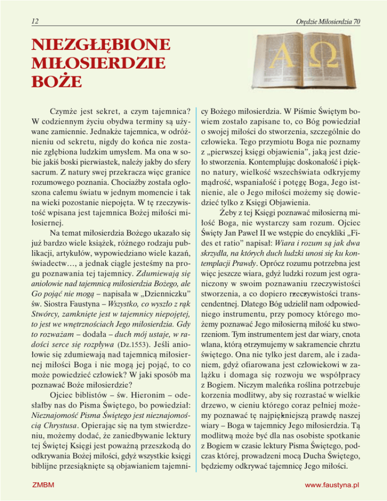 12 Orędzie Miłosierdzia 70 NIEZGŁĘBIONE MIŁOSIERDZIE BOŻE Czymże jest sekret, a czym tajemnica? W codziennym życiu obydwa terminy są używane zamiennie. Jednakże tajemnica, w odróżnieniu od sekretu, nigdy do końca nie zostanie zgłębiona ludzkim umysłem. Ma ona w sobie jakiś boski pierwiastek, należy jakby do sfery sacrum. Z natury swej przekracza więc granice rozumowego poznania. Chociażby została ogłoszona całemu światu w jednym momencie i tak na wieki pozostanie niepojęta. W tę rzeczywistość wpisana jest tajemnica Bożej miłości miłosiernej. Na temat miłosierdzia Bożego ukazało się już bardzo wiele książek, różnego rodzaju publikacji, artykułów, wypowiedziano wiele kazań, świadectw…, a jednak ciągle jesteśmy na progu poznawania tej tajemnicy. Zdumiewają się aniołowie nad tajemnicą miłosierdzia Bożego, ale Go pojąć nie mogą – napisała w „Dzienniczku” św. Siostra Faustyna – Wszystko, co wyszło z rąk Stwórcy, zamknięte jest w tajemnicy niepojętej, to jest we wnętrznościach Jego miłosierdzia. Gdy to rozważam – dodała – duch mój ustaje, w radości serce się rozpływa (Dz.1553). Jeśli aniołowie się zdumiewają nad tajemnicą miłosiernej miłości Boga i nie mogą jej pojąć, to co może powiedzieć człowiek? W jaki sposób ma poznawać Boże miłosierdzie? Ojciec biblistów – św. Hieronim – odesłałby nas do Pisma Świętego, bo powiedział: Nieznajomość Pisma Świętego jest nieznajomością Chrystusa. Opierając się na tym stwierdzeniu, możemy dodać, że zaniedbywanie lektury tej Świętej Księgi jest poważną przeszkodą do odkrywania Bożej miłości, gdyż wszystkie księgi biblijne przesiąknięte są objawianiem tajemniZMBM cy Bożego miłosierdzia. W Piśmie Świętym bowiem zostało zapisane to, co Bóg powiedział o swojej miłości do stworzenia, szczególnie do człowieka. Tego przymiotu Boga nie poznamy z „pierwszej księgi objawienia”, jaką jest dzieło stworzenia. Kontemplując doskonałość i piękno natury, wielkość wszechświata odkryjemy mądrość, wspaniałość i potęgę Boga, Jego istnienie, ale o Jego miłości możemy się dowiedzieć tylko z Księgi Objawienia. Żeby z tej Księgi poznawać miłosierną miłość Boga, nie wystarczy sam rozum. Ojciec Święty Jan Paweł II we wstępie do encykliki „Fides et ratio” napisał: Wiara i rozum są jak dwa skrzydła, na których duch ludzki unosi się ku kontemplacji Prawdy. Oprócz rozumu potrzebna jest więc jeszcze wiara, gdyż ludzki rozum jest ograniczony w swoim poznawaniu rzeczywistości stworzenia, a co dopiero rzeczywistości transcendentnej. Dlatego Bóg udzielił nam odpowiedniego instrumentu, przy pomocy którego możemy poznawać Jego miłosierną miłość ku stworzeniom. Tym instrumentem jest dar wiary, cnota wlana, którą otrzymujemy w sakramencie chrztu świętego. Ona nie tylko jest darem, ale i zadaniem, gdyż ofiarowana jest człowiekowi w zalążku i domaga się rozwoju we współpracy z Bogiem. Niczym maleńka roślina potrzebuje korzenia modlitwy, aby się rozrastać w wielkie drzewo, w cieniu którego coraz pełniej możemy poznawać tę najpiękniejszą prawdę naszej wiary – Boga w tajemnicy Jego miłosierdzia. Tą modlitwą może być dla nas osobiste spotkanie z Bogiem w czasie lektury Pisma Świętego, podczas której, prowadzeni mocą Ducha Świętego, będziemy odkrywać tajemnicę Jego miłości. www.faustyna.pl kwiecień, maj, czerwiec 2009 Chociaż Biblia ani razu nie używa zestawienia słów: tajemnica miłosierdzia Bożego, jednakże wielokrotnie mówi o wielkości miłosierdzia (m. in. Lb 14, 19; Ne 9, 27; Ps 86, 13), jego ogromie (Ps 51; 69, 17), bogactwie łask (Iz 63, 7; Ef 2, 4n). Autor Psalmu 145 w wersecie 9 wprost wyznaje, że Boże miłosierdzie ogarnia wszystkie Jego dzieła. Z owego zdumienia nad potęgą Bożej miłości wypływa retoryczne pytanie mędrca Syracha: Któż potrafi dokładnie opowiedzieć dzieła Jego miłosierdzia? (Syr 18, 5). Niepojętość tajemnicy tego największego przymiotu Boga autorzy natchnieni widzą w Bożej wierności obietnicom Przymierza (Pwt 7, 12; Łk 1, 72). Mimo że zostało ono złamane przez człowieka, nie przekreśla miłości Boga do stworzenia. Niezwykle piękne jest zestawienie synonimicznych słów: wnętrzności i miłosierdzie w Księdze Jeremiasza (31, 20) na opisanie reakcji Boga i Jego głębokich uczuć względem narodu wybranego. Bóg jakby czuje wewnętrzny przymus serca, by okazywać swoje przebaczenie. Możemy powtórzyć za św. Siostrą Faustyną, że Bóg jest Miłością i Miłosierdziem Bóg, aby móc pełniej objawić człowiekowi swoją dobroć, posłał na świat swojego jedynego Syna. Największą miłość i przepaść mi- 13 łosierdzia poznaję we wcieleniu Słowa, w Jego odkupieniu… (Dz. 180) – wyznała Apostołka Miłosierdzia Bożego. Chrystus – Wcielone Miłosierdzie – całym swoim życiem i nauczaniem przybliżał człowiekowi sens tajemnicy swojej miłości. W przypowieściach malował przepiękne obrazy wyraziście ukazujące potężny blask Bożego miłosierdzia (zob. np. Łk 15) . Jak niepojęte i wręcz zaprzeczające ludzkiej logice jest Boże miłosierdzie, pokazuje Krzyż – zgorszenie dla Żydów, głupstwo dla pogan. Wartość przelanej krwi, za jaką została nabyta Bogu ludzka dusza, szczególnie akcentują listy Pawłowe. Znamienne, że używane w nich słownictwo na oznaczenie Bożej dobroci zawsze wkomponowane jest w kontekst odkupienia. W dziele zbawienia najpełniej objawia się bowiem tajemnica miłosierdzia Bożego, ale nawet tutaj nie zawsze z łatwością ją poznajemy. Dlatego św. Siostra Faustyna stwierdzi: O niepojęte i niezgłębione miłosierdzie Boże. Kto Cię godnie uwielbić i wysławić może. Największy przymiocie Boga wszechmocnego, Tyś słodka nadzieja dla człowiek grzesznego (Dz. 951) . Agnieszka Ciborowska POSTANOWIENIE 1. Rozważę słowa: 