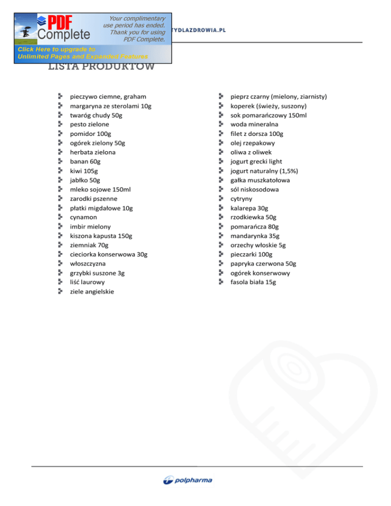 pieczywo ciemne, graham margaryna ze sterolami 10g twaróg chudy 50g pesto zielone pomidor 100g ogórek zielony 50g herbata zielona banan 60g kiwi 105g jabłko 50g mleko sojowe 150ml zarodki pszenne płatki migdałowe 10g cynamon imbir mielony kiszona kapusta 150g ziemniak 70g cieciorka konserwowa 30g włoszczyzna grzybki suszone 3g liść laurowy ziele angielskie pieprz czarny (mielony, ziarnisty) koperek (świeży, suszony) sok pomarańczowy 150ml woda mineralna filet z dorsza 100g olej rzepakowy oliwa z oliwek jogurt grecki light jogurt naturalny (1,5%) gałka muszkatołowa sól niskosodowa cytryny kalarepa 30g rzodkiewka 50g pomarańcza 80g mandarynka 35g orzechy włoskie 5g pieczarki 100g papryka czerwona 50g ogórek konserwowy fasola biała 15g