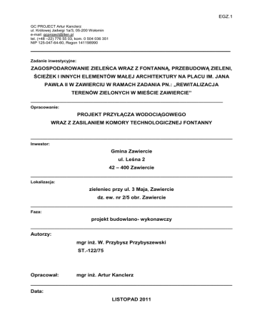 EGZ.1 GC PROJECT Artur Kanclerz ul. Królowej Jadwigi 1a/3, 05-200 Wołomin e-mail: [email protected] tel. (+48 –22) 776 55 03, kom. 0 504 036 351 NIP 125-047-64-60, Regon 141198990 ____________________________________________________ Zadanie inwestycyjne: ZAGOSPODAROWANIE ZIELEŃCA WRAZ Z FONTANNĄ, PRZEBUDOWĄ ZIELENI, ŚCIEŻEK I INNYCH ELEMENTÓW MAŁEJ ARCHITEKTURY NA PLACU IM. JANA PAWŁA II W ZAWIERCIU W RAMACH ZADANIA PN.: „REWITALIZACJA TERENÓW ZIELONYCH W MIEŚCIE ZAWIERCIE” ________________________________________________________________________________ Opracowanie: PROJEKT PRZYŁĄCZA WODOCIĄGOWEGO WRAZ Z ZASILANIEM KOMORY TECHNOLOGICZNEJ FONTANNY ____________________________________________________________________________________ Inwestor: Gmina Zawiercie ul. Leśna 2 42 – 400 Zawiercie ____________________________________________________________________________________ Lokalizacja: zieleniec przy ul. 3 Maja, Zawiercie dz. ew. nr 2/5 obr. Zawiercie ____________________________________________________________________________________ Faza: projekt budowlano- wykonawczy ____________________________________________________________________________________ Autorzy: mgr inż. W. Przybysz Przybyszewski ST.-122/75 Opracował: mgr inż. Artur Kanclerz ______________________________________________________________________ Data: LISTOPAD 2011 OPRACOWANIE DOKUMENTACJI PROJEKTOWO-KOSZTORYSOWEJ Projekt przyłącza wodociągowego. ZAGOSPODAROWANIA ZIELEŃCA WRAZ FONTANNĄ PRZY UL. 3 MAJA W ZAWIERCIU . ________________________________________________________________________________________________________ ZAWARTOŚĆ OPRACOWANIA: I Spis rysunków, załączników II Część opisowa 1. PODSTAWA OPRACOWANIA 2. ZAKRES OPRACOWANIA 3. INWESTOR 4. INFORMACJE OGÓLNE 4.1 LOKALIZACJA TERENU OPRACOWANIA 4.2 CHARAKTERYSTYKA TERENU – ISTNIEJĄCY STAN ZAGOSPODAROWANIA TERENU 4.3 ISTNIEJĄCE UKSZTAŁTOWANIE TERENU 4.4. STAN ISTNIEJĄCY 4.5. WARUNKI GRUNTOWO -WODNE 4.6. POWIERZCHNIA TERENU OPRACOWANIA 5. PRZYŁĄCZE WODOCIĄGOWE 5.1 OPIS STANU PROJEKTOWANEGO 5.2 DOBÓR WODOMIERZY 5.3 OBLICZENIE ŚREDNICY PRZYŁĄCZA 5.4 MATERIAŁY I UZBROJENIE 6. TECHNOLOGIA WYKONANIA 7. PRÓBY SZCZELNOŚCI I DEZYNFEKCJA RUROCIĄGU 8. KOLIZJE Z ISTNIEJĄCYM UZBROJENIEM 9. LIKWIDACJA ISTNIEJĄCEGO PRZYŁACZA 10. UWAGI DLA INWESTORA I WYKONAWCY __________________________________________________________________________________________ GC PROJECT– Artur Kanclerz ul. Królowej Jadwigi 1a/3, 05-200 Wołomin, tel. (0-22) 7765503, kom. 504 036 351 3 4-9 4 4 4 4-5 5-9 5 5 6 6 6 7 7 8 9 2 OPRACOWANIE DOKUMENTACJI PROJEKTOWO-KOSZTORYSOWEJ Projekt przyłącza wodociągowego. ZAGOSPODAROWANIA ZIELEŃCA WRAZ FONTANNĄ PRZY UL. 3 MAJA W ZAWIERCIU . ________________________________________________________________________________________________________ III Załączniki zał. nr 1. zał. nr 2. zał. nr 3. zał. nr 4. zał. nr 5 zał. nr 6 zał. nr 7 zał. nr 8 zał. nr 9 zał. nr 10 Zał. nr 11 IV Oświadczenie projektanta. Zaświadczenie o posiadaniu przez Pana mgr inż. Wojciecha PrzybyszPrzybyszewskiego uprawnień projektowych w zakresie instalacji i urządzeń sanitarnych Zaświadczenie o przynależności Pana mgr inż. Wojciecha PrzybyszPrzybyszewskiego do Mazowieckiej Okręgowej Izby Inżynierów Budownictwa Warunki techniczne przyłączenia i dostawy wody TS/3665/56/2011r z dnia 26-09-2011r. Mapa do celów projektowych uzgodnienie ZUD Uzgodnienie branżowe Górnośląska Spółka Gazownicza sp. z o.o. Uzgodnienie branżowe RPWiK sp. z o.o. Zawiercie Uzgodnienie branżowe TAURON Dystrybucja SA Uzgodnienie branżowe Telekomunikacja Polska SA Uzgodnienie projektu RPWiK Zawiercie Część rysunkowa Spis rysunków Nr rys. Tytuł rysunku Skala Rys. 1. Plan sytuacyjno-wysokościowy przyłącza wodociągowego. 1:250 Rys. 2. Profil przyłącza wodociągowego 1:100 Rys. 3. Studnia wodomierzowa 1:20 __________________________________________________________________________________________ GC PROJECT– Artur Kanclerz ul. Królowej Jadwigi 1a/3, 05-200 Wołomin, tel. (0-22) 7765503, kom. 504 036 351 3 OPRACOWANIE DOKUMENTACJI PROJEKTOWO-KOSZTORYSOWEJ Projekt przyłącza wodociągowego. ZAGOSPODAROWANIA ZIELEŃCA WRAZ FONTANNĄ PRZY UL. 3 MAJA W ZAWIERCIU . ________________________________________________________________________________________________________ II. CZĘŚĆ OPISOWA II Część opisowa PODSTAWA OPRACOWANIA: Umowa z Inwestorem nr 1713/2011 z dnia 22.09.2011r., mapa do celów projektowych w skali 1:1000 oraz zaakceptowany projekt zagospodarowania terenu zieleńca wraz z fontanną wykonany przez pracownię Studio Ogrody z dnia 26.10.2011r. 1. ZAKRES OPRACOWANIA: opracowanie projektu budowlano – wykonawczego przyłącza wodociągowego do komory technologicznej fontanny na placu Jana Pawła II oraz zasilenia wody letniej. 2. 3. INWESTOR: Gmina Zawiercie, ul. Leśna 2, 42-400 Piaseczno. 4. INFORMACJE OGÓLNE 4.1. LOKALIZACJA TERENU OPRACOWANIA Przedmiotowy teren położony jest na działce o nr ewidencyjnym: 2/5 i nieznaczny fragment działki 2/3 obręb Zawiercie CHARAKTERYSTYKA TERENU – ISTNIEJĄCY STAN ZAGOSPODAROWANIA TERENU 4.2. Przedmiotowy teren jest terenem przestrzeni publicznej w centrum Zawiercia przy ul. Sikorskiego – Wyszyńskiego w Zawierciu. W chwili obecnej na terenie opracowania istnieją ciągi komunikacyjne tworzące system przechodni pomiędzy terenami otaczającymi (sklepem wielobranżowym, bankiem, a osiedlami oraz stacją PKP a osiedlami mieszkaniowymi). System jest przypadkowy dla terenu zorganizowanej zieleni, przestrzeni publicznej jaki powinien przyjąć zieleniec miejski w centrum miasta. Obecna zieleń występująca na zieleńcu to przypadkowe nasadzenia roślin cięte corocznie i formowane najczęściej w formy przypadkowe. Roślinność nie jest dobrana do funkcji miejsca oraz warunków glebowo-klimatycznych terenu miejskiego a jej przypadkowe rozmieszczenie stwarza ogólny nieład. Ist