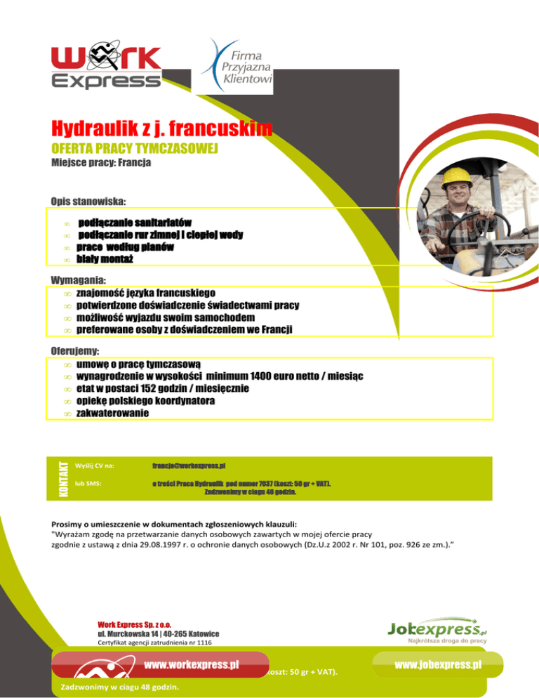 Hydraulik z j. francuskim OFERTA PRACY TYMCZASOWEJ Miejsce pracy: Francja Opis stanowiska: • • • • podłączanie sanitariatów podłączanie rur zimnej i ciepłej wody prace według planów biały montaż Wymagania: • znajomość języka francuskiego • potwierdzone doświadczenie świadectwami pracy • możliwość wyjazdu swoim samochodem • preferowane osoby z doświadczeniem we Francji KONTAKT Oferujemy: • umowę o pracę tymczasową • wynagrodzenie w wysokości minimum 1400 euro netto / miesiąc • etat w postaci 152 godzin / miesięcznie • opiekę polskiego koordynatora • zakwaterowanie Wyślij CV na: [email protected] lub SMS: o treści Praca Hydraulik pod numer 7037 (koszt: 50 gr + VAT). Zadzwonimy w ciagu 48 godzin. Prosimy o umieszczenie w dokumentach zgłoszeniowych klauzuli: "Wyrażam zgodę na przetwarzanie danych osobowych zawartych w mojej ofercie pracy zgodnie z ustawą z dnia 29.08.1997 r. o ochronie danych osobowych (Dz.U.z 2002 r. Nr 101, poz. 926 ze zm.).” Work Express Sp. z o.o. ul. Murckowska 14 | 40-265 Katowice Certyfikat agencji zatrudnienia nr 1116 [email protected] lub SMS: o treści TRESC SMS pod numer 7037 (koszt: 50 gr + VAT). KONTAKT Wyślij CV na: Zadzwonimy w ciagu 48 godzin.