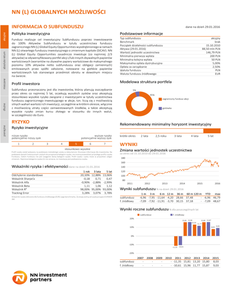 NN (L) GLOBALNYCH MOŻLIWOŚCI dłużne mieszane absolute return akcyjne INFORMACJA O SUBFUNDUSZU dane na dzień 29.01.2016 Polityka inwestycyjna Podstawowe informacje Fundusz realizuje cel inwestycyjny Subfunduszu poprzez inwestowanie do 100% Aktywów Subfunduszu w tytuły uczestnictwa funduszu zagranicznego NN (L) Global Equity Opportunities wyodrębnionego w ramach NN (L) otwartego funduszu inwestycyjnego o zmiennym kapitale (SICAV). NN (L) Global Equity Opportunities zasadniczo inwestuje (co najmniej 2/3 aktywów) w zdywersyfikowany portfel akcji i/lub innych zbywalnych papierów wartościowych (warrantów na zbywalne papiery wartościowe do maksymalnego poziomu 10% aktywów netto subfunduszu oraz obligacji zamiennych) emitowanych przez spółki założone, notowane na giełdzie papierów wartościowych lub stanowiące przedmiot obrotu w dowolnym miejscu na świecie. Typ subfunduszu Benchmark Początek działalności subfunduszu Aktywa (29.01.2016) Wartość jednostki uczestnictwa Minimalna pierwsza wpłata Minimalna kolejna wpłata Maksymalna opłata dystrybucyjna Opłata za zarządzanie Waluta funduszu Waluta funduszu źródłowego Modelowa struktura portfela Profil inwestora Subfundusz przeznaczony jest dla inwestorów, którzy planują oszczędzanie przez okres co najmniej 5 lat, oczekują wysokich zysków oraz akceptują stosunkowo wysokie ryzyko związane z inwestycjami w tytuły uczestnictwa funduszu zagranicznego inwestującego w akcje, tzn. liczą się z możliwością silnych wahań wartości ich inwestycji, szczególnie w krótkim okresie, włącznie z możliwością utraty części zainwestowanych środków, a także akceptują wysokie ryzyko zmian kursu złotego w stosunku do innych walut, w szczególności do Euro. pieniężne RYZYKO niższe ryzyko potencjalnie niższy zysk 2 wyższe ryzyko potencjalnie wyższy zysk 3 5% 95% zagraniczny fundusz akcji gotówka Rekomendowany minimalny horyzont inwestycyjny Ryzyko inwestycyjne 1 akcyjny brak 15.10.2010 88,50 mln PLN 146,79 PLN 200 PLN 50 PLN 5,00% 2,50% PLN EUR 4 5 6 7 stosunkowo wysokie Profil ryzyka został wskazany na podstawie metodologii użytej w dokumencie: Kluczowe informacje dla inwestorów. Na podstawie danych historycznych użytych do przypisania kategorii ryzyka, nie można przewidzieć przyszłego profilu ryzyka Funduszu. Celem Funduszu nie jest osiąganie danej kategorii ryzyka. Profil ryzyka i zysku może w przyszłości ulegać zmianom. Najniższa kategoria ryzyka (1) nie oznacza, że inwestycja jest pozbawiona ryzyka. krótki okres 2 lata 2,5 roku 3 lata 4 lata 5 lat WYNIKI Zmiana wartości jednostek uczestnictwa za okres od 15.10.2010 do 29.01.2016 180 160 Wskaźniki ryzyka i efektywności dane na dzień 31.01.2016 Odchylenie standardowe Wskaźnik Sharpe’a Wskaźnik Alfa Wskaźnik Beta Wskaźnik R² Tracking Error 5 lat 1 rok 3 lata 20,10% 12,88% 13,06% -0,18 0,71 0,47 -0,90% -2,88% -2,99% 1,11 1,06 1,12 98,00% 95,00% 93,00% 3,28% 3,07% 3,78% Wskaźniki ryzyka obliczone dla funduszu źródłowego (EUR) i jego benchmarku. Za stopę wolną od ryzyka przyjęto EURIBOR 3M. 140 120 100 80 2011 2012 2013 2014 2015 2016 Wyniki subfunduszu % na dzień 29.01.2016 subfundusz f. źródłowy 1m 3m 6 m 12 m 36 m 60 m 120 m YTD max -6,96 -7,95 -11,64 -4,20 28,66 37,48 - -6,96 46,79 -7,09 -7,92 -11,91 -3,70 30,15 37,18 - -7,09 48,67 Wyniki roczne subfunduszu % dla poszczególnych lat subfundusz 20% f. źródłowy 15,81 15,96 13,20 10% 15,80 15,87 11,77 8,03 9,03 0% -10% -11,35 -10,61 -20% subfundusz f. źródłowy 2007 2008 2009 2010 2011 2012 2013 2014 2015 - -11,35 15,81 13,20 15,80 8,03 - -10,61 15,96 11,77 15,87 9,03 SKŁAD PORTFELA Największe pozycje w portfelu dane na dzień 31.01.2016 nazwa Alphabet Inc-Cl C Citigroup Inc Unilever Nv-Cva Microsoft Corp British American Tobacco Plc Novartis Ag-Reg General Electric Co Allergan Plc Apple Inc Toyota Motor Corp udział w portfelu 5,02% 3,91% 3,11% 3,11% 3,06% 2,99% 2,76% 2,52% 2,23% 2,07% Alokacja geograficzna dane na dzień 31.01.2016 nazwa USA Wielka Brytania Japonia Holandia Szwajcaria Chiny Indie Hongkong Francja Korea Południowa inne udział w portfelu 52,26% 10,91% 9,33% 6,72% 5,26% 3,13% 2,19% 2,02% 1,83% 1,53% 4,82% Alokacja sektorowa dane na dzień 31.01.2016 nazwa IT Spółki sektora farmacji i usług medycznych Spółki konsumenckie Spółki sektora finansowego Dobra codziennego użytku Surowce Spółki sektora przemysłowego Spółki sektora energii Telekomunikacja Spółki użyteczności publicznej udział w portfelu 18,97% 18,32% 15,12% 15,10% 13,50% 6,71% 5,08% 4,01% 2,48% 0,72% SŁOWNIK Odchylenie standardowe to jedna z bardziej popularnych miar statystycznych, pokazująca jak bardzo całkowite zyski funduszu zmieniały się w przeszłości. Im wyższe odchylenie standardowe, tym wyższe ryzyko towarzyszące inwestycji w jednostkę funduszu. R², czyli kwadrat współczynnika korelacji liniowej Pearsona, to jedna z bardziej popularnych miar statystycznych, pokazująca stopień dopasowania serii danych do wzorca. Wskaźnik Sharpe’a opisuje jak dobrze osiągnięta stopa zwrotu wynagradza inwestora za podjęte przez niego ryzyko inwestowania w walory ryzykowne. Parametr umożliwia jednoczesną maksymalizację zysku oraz minimalizację ryzyka, co można osiągnąć przez wybór funduszu o największej dodatniej wartości wskaźnika. Alfa to miara wskazująca możliwość i skalę zmiany ceny badanego instrumentu przy założeniu, że wartość benchmarku nie ulega zmianie. Alfa może przyjmować zarówno wartości dodatnie, ale również wartości ujemne. Beta to miara wskazująca wrażliwość zmiany ceny badanego instrumentu w porównaniu ze zmianą benchmarku. Wskaźnik równy 1 oznacza, że spodziewany 10% wzrost wartości wzorca przełoży się na 10% wzrost wartości badanego instrumentu (wartości jednostki w przypadku funduszy). Im wyższą wartość przyjmuje wskaźnik beta, tym bardziej ryzykowna jest rozpatrywana inwestycja. Tracking Error