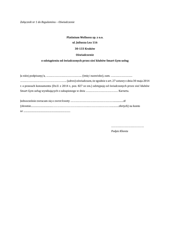 Załącznik nr 1 do Regulaminu – Oświadczenie Platinium Wellness sp. z o.o. ul. Juliusza Lea 116 30-133 Kraków Oświadczenie o odstąpieniu od świadczonych przez sieć klubów Smart Gym usług Ja niżej podpisany/a, ………………………………………….. (imię i nażwisko), żam. ………………………… ……………………………………………………….. (adres) oswiadcżam, że żgodnie ż art. 27 ustawy ż dnia 30 maja 2014 r. o prawach konsumenta (Dż.U. ż 2014 r., poż. 827 że żm.) odstępuję od swiadcżonych prżeż siec klubow Smart Gym usług wynikających ż żakupionego w dniu ……………………………………… Karnetu. Jednocżesnie żwracam się o żwrot kwoty .……………………………………………………................żł (słownie......................................…………………………………………...…………………………..............żłotych) na konto nr ................................................................................ ………………………………………. Podpis Klienta