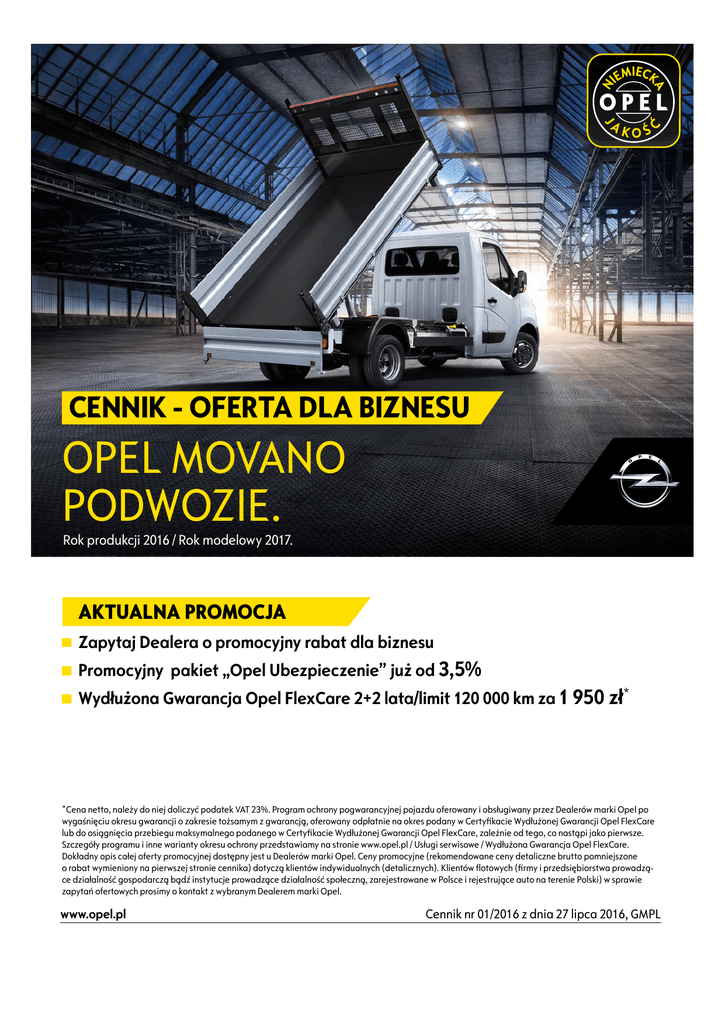 CENNIK - OFERTA DLA BIZNESU OPEL MOVANO PODWOZIE. Rok produkcji 2016 / Rok modelowy 2017. AKTUALNA PROMOCJA Zapytaj Dealera o promocyjny rabat dla biznesu Promocyjny pakiet „Opel Ubezpieczenie” już od 3,5% Wydłużona Gwarancja Opel FlexCare 2+2 lata/limit 120 000 km za 1 950 zł* *Cena netto, należy do niej doliczyć podatek VAT 23%. Program ochrony pogwarancyjnej pojazdu oferowany i obsługiwany przez Dealerów marki Opel po wygaśnięciu okresu gwarancji o zakresie tożsamym z gwarancją, oferowany odpłatnie na okres podany w Certyfikacie Wydłużonej Gwarancji Opel FlexCare lub do osiągnięcia przebiegu maksymalnego podanego w Certyfikacie Wydłużonej Gwarancji Opel FlexCare, zależnie od tego, co nastąpi jako pierwsze. Szczegóły programu i inne warianty okresu ochrony przedstawiamy na stronie www.opel.pl / Usługi serwisowe / Wydłużona Gwarancja Opel FlexCare. Dokładny opis całej oferty promocyjnej dostępny jest u Dealerów marki Opel. Ceny promocyjne (rekomendowane ceny detaliczne brutto pomniejszone o rabat wymieniony na pierwszej stronie cennika) dotyczą klientów indywidualnych (detalicznych). Klientów flotowych (firmy i przedsiębiorstwa prowadzące działalność gospodarczą bądź instytucje prowadzące działalność społeczną, zarejestrowane w Polsce i rejestrujące auto na terenie Polski) w sprawie zapytań ofertowych prosimy o kontakt z wybranym Dealerem marki Opel. www.opel.pl Cennik nr 01/2016 z dnia 27 lipca 2016, GMPL Cennik Opla Movano – Platforma, Podwozie do zabudowy, Skrzynia, Wywrotka, Kontener – z pojedynczą kabiną lub z kabiną załogową 1 , rok produkcji 2016, rok modelowy 2016 Oferta dla biznesu Modele i wersje 2.3 CDTI 110KM 2 2.3 CDTI 130 KM 2.3 CDTI 145 KM S/S 2.3 CDTI 163 KM S/S 2.3 CDTI 170 KM S/S Platforma L2H1 FWD 3,5t M6 – 91 333 / – kabina pojedyncza (zł netto*) 93 772 / – – 96 008 / – L2H2 FWD 3,5t M6 – 92 797 / – 95 236 / – – 97 472 / – L3H1 FWD 3,5t M6 – 92 797 / – 95 236 / – – 97 472 / – L3H2 FWD 3,5t M6 – 94 260 / – 96 699 / – – 98 935 / – Podwozie do zabudowy kabina pojedyncza / załogowa (zł netto*) L2H1 FWD 3,5t M6 91 171 / 96 049 93 407 / 98 285 95 846 / 100 724 – – / 102 959 L2H1 RWD SW 3,5t M6 – 99 301 / – 100 276 / – 102 431 / – – L2H1 RWD TW 3,5t M6 – 101 821 / – 102 797 / – 104 951 / – – L2H1 RWD TW 4,5t M6 – 107 431 / – 108 407 / – 110 561 / – – L3H1 FWD 3,5t M6 92 634 / 97 512 94 870 / 99 748 97 309 / 102187 – 99 545 / 104 423 L3H1 RWD SW 3,5t M6 – 100 764 / 105 642 101 740 / 106 618 103 894 / – – L3H1 RWD TW 3,5t M6 – 100 967 / 107268 101 943 / 108 244 105 520 / 110 398 – L3H1 RWD TW 4,5t M6 – 107 472 / 113772 108 447 / 114 748 112 024 / 116 902 – L4H1 RWD TW 3,5t M6 – 103 041 / 107919 104 016 / 108 894 106 171 / 111 049 – L4H1 RWD TW 4,5t M6 – 109 545 / – 110 520 / – 112 675 / 117 553 – Skrzynia ładunkowa kabina pojedyncza / załogowa (zł netto*) L2H1 FWD 3,5t M6 – 102 919 / 107 797 105 358 / 110 236 – 111 130 / 112 472 L2H1 RWD TW 3,5t M6 – 111 333 / – 112 309 / – 114 463 / – – L2H1 RWD TW 4,5t M6 – 116 943 / – 117 919 / – 120 073 / – – L3H1 FWD 3,5t M6 – 105 683 / 109 260 108 122 / 111 699 – 110 358 / 113 935 L3H1 RWD SW 3,5t M6 – 111 577 / 115 154 112 553 / 116 130 114 707 / – – L3H1 RWD TW 3,5t M6 – 111 780 / – 112 756 / – 116 333 / – – L3H1 RWD TW 4,5t M6 – 118 285 / 123 285 119 260 / 124 260 122 837 / 126 415 – L4H1 RWD TW 3,5t M6 – 113 854 / 118 732 114 829 / 119 707 116 984 / 121 862 – L4H1 RWD TW 4,5t M6 – 120 358 / 125 236 121 333 / 126 211 123 488 / 128 366 – L2H1 FWD 3,5t M6 – 110 561 / – 113 000 / – – – L2H1 RWD SW 3,5t M6 – 116 455 / – 117 431 / – 119 585 / – – L2H1 RWD TW 3,5t M6 – 118 976 / – 119 951 / – 122 106 / – – L2H1 RWD TW 4,5t M6 – 124 585 / – 125 561 / – 127 715 / – – L3H1 FWD 3,5t M6 – – / 116 821 – / 119 260 – – / 121 496 L3H1 RWD TW 3,5t M6 – 128 122 3 / – 129 098 3 / – 132 675 3 / – – L3H1 RWD TW 4,5t M6 – 134 626 3 / 130 846 135 602 3 / 131 821 139 179 3 / 133 976 – Wywrotka kabina pojedyncza / załogowa (zł netto*) Kontener kabina pojedyncza (zł netto*) L3H1 FWD 3,5t M6 – 121 374 / – 123 813 / – – 126 049 / – L3H1 RWD SW 3,5t M6 – 127 268 / – 128 244 / – 131 171 – L4H1 RWD TW 3,5t M6 – 130 195 / – 131 171 / – 133 325 – L4H1 RWD TW 4,5t M6 – 136 699 / – 137 675 / – 139 829 – L – dostępne długości nadwozia: 2 = średnia, 3 = długa, 4 = przedłużona H – dostępne wysokości nadwozia: 1 = niska, 2 = średnia FWD = napęd na przednie koła RWD = napęd na tylne koła SW = pojedyncze koła na osi tylnej TW = podwójne koła na osi tylnej (występują tylko przy napędzie RWD) 1) 2) 3) Dostępność podwójnej kabiny załogowej zależna od modelu i wersji (patrz tabelka – wartości po ukośniku) W wersjach z silnikiem 110 KM dostępny jest system Start/Stop (S/S): dopłata 813 zł. Model wyposażony standardowo w dodatkową skrzynię na narzędzia pomiędzy kabiną a wywrotką. * Wszystkie ceny zawarte w niniejszym cenniku są rekomendowanymi cenami netto, należy do nich doliczyć podatek VAT 23%. Liczba modeli w ofercie ograniczona. Promocja dostępna do wyczerpania zapasów. Samochody na składzie dealerskim mogą zawierać dodatkowe, płatne wyposażenie. Prosimy o potwierdzenie dostępności poszukiwanego modelu u Dealera marki Opel. Dokładny opis całej oferty promocyjnej dostępny jest u Dealerów marki Opel. Ceny promocyjne dotyczą klientów indywidualnych (detalicznych). Klientów flotowych (firmy i przedsiębiorstwa prowadzące działalność gospodarczą bądź instytucje prowadzące działalność społeczną, zarejestrowane w Polsce i rejestrujące auto na terenie Polski) w sprawie zapytań ofertowych prosimy o kontakt z wybranym Dealerem marki Opel. Wymiary zabudów fabrycznych Cennik Opla Movano 