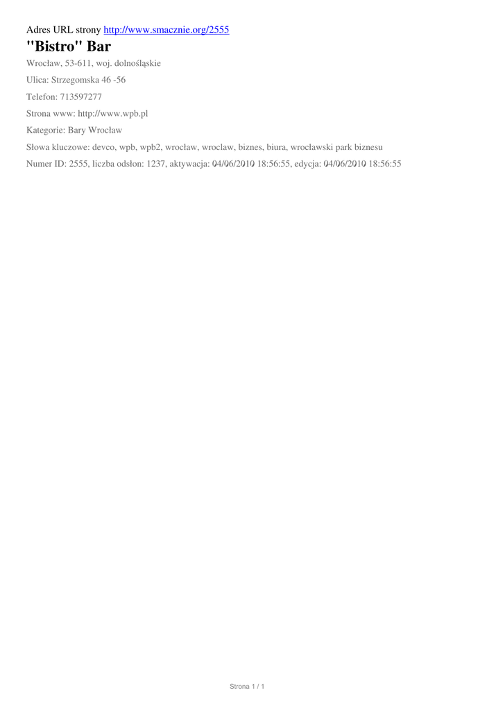 Adres URL strony http://www.smacznie.org/2555 "Bistro" Bar Wrocław, 53-611, woj. dolnośląskie Ulica: Strzegomska 46 -56 Telefon: 713597277 Strona www: http://www.wpb.pl Kategorie: Bary Wrocław Słowa kluczowe: devco, wpb, wpb2, wrocław, wroclaw, biznes, biura, wrocławski park biznesu Numer ID: 2555, liczba odsłon: 1237, aktywacja: 04/06/2010 18:56:55, edycja: 04/06/2010 18:56:55 Strona 1 / 1