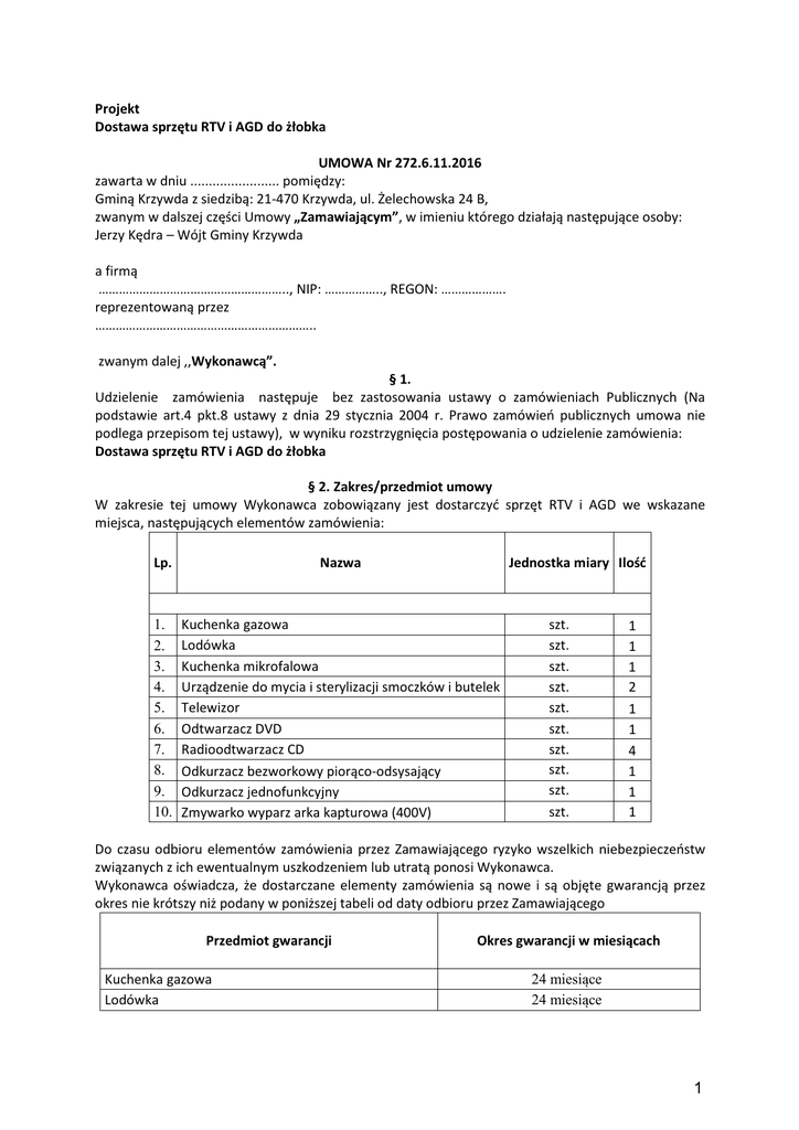 Projekt Dostawa sprzętu RTV i AGD do żłobka UMOWA Nr 272.6.11.2016 zawarta w dniu ........................ pomiędzy: Gminą Krzywda z siedzibą: 21-470 Krzywda, ul. Żelechowska 24 B, zwanym w dalszej części Umowy „Zamawiającym”, w imieniu którego działają następujące osoby: Jerzy Kędra – Wójt Gminy Krzywda a firmą ……………………………………………….., NIP: …………….., REGON: ………………. reprezentowaną przez ……………………………………………………….. zwanym dalej ,,Wykonawcą”. § 1. Udzielenie zamówienia następuje bez zastosowania ustawy o zamówieniach Publicznych (Na podstawie art.4 pkt.8 ustawy z dnia 29 stycznia 2004 r. Prawo zamówień publicznych umowa nie podlega przepisom tej ustawy), w wyniku rozstrzygnięcia postępowania o udzielenie zamówienia: Dostawa sprzętu RTV i AGD do żłobka § 2. Zakres/przedmiot umowy W zakresie tej umowy Wykonawca zobowiązany jest dostarczyć sprzęt RTV i AGD we wskazane miejsca, następujących elementów zamówienia: Lp. Nazwa Jednostka miary Ilość 1. 2. 3. 4. 5. 6. 7. 8. 9. 10. Kuchenka gazowa Lodówka Kuchenka mikrofalowa Urządzenie do mycia i sterylizacji smoczków i butelek Telewizor Odtwarzacz DVD Radioodtwarzacz CD Odkurzacz bezworkowy piorąco-odsysający Odkurzacz jednofunkcyjny Zmywarko wyparz arka kapturowa (400V) szt. szt. szt. szt. szt. szt. szt. szt. szt. szt. 1 1 1 2 1 1 4 1 1 1 Do czasu odbioru elementów zamówienia przez Zamawiającego ryzyko wszelkich niebezpieczeństw związanych z ich ewentualnym uszkodzeniem lub utratą ponosi Wykonawca. Wykonawca oświadcza, że dostarczane elementy zamówienia są nowe i są objęte gwarancją przez okres nie krótszy niż podany w poniższej tabeli od daty odbioru przez Zamawiającego Przedmiot gwarancji Kuchenka gazowa Lodówka Okres gwarancji w miesiącach 24 miesiące 24 miesiące 1 Kuchenka mikrofalowa Urządzenie do mycia i sterylizacji smoczków i butelek Telewizor Odtwarzacz DVD Radioodtwarzacz CD Odkurzacz bezworkowy piorąco-odsysający Odkurzacz jednofunkcyjny Zmywarko wyparzarka kapturowa (400V) 24 miesiące 24 miesiące 24 miesiące 24 miesiące 24 miesiące 24 miesiące 24 miesiące 24 miesiące Minimalne wymagania jakościowe elementów określone są w Zaproszeniu do złożenia ofert, na podstawie których Wykonawca złożył ofertę. § 3. Terminy realizacji umowy Wykonawca zobowiązuje się dostarczyć sprzęt RTV i AGD we wskazane miejsca, pełny zakres zamówienia w terminie do dnia 21 grudnia 2016 r. § 4. Wynagrodzenie 1. Zapłata następować będzie na podstawie faktycznie dostarczonego zakresu zamówienia wg cen jednostykowych poszczególnych elementów zamówienia. 2. Cena ogólna zamówienia została określona ofertą Wykonawcy i wynosi: brutto...............zł w tym podatek VAT…. %, (brutto słownie: ................................................................................................................................) 3. Ceny jednostkowe poszczególnych elementów zamówienia są następujące: Lp. 1. 2. 3. 4. 5. 6. 7. 8. 9. 10. Nazwa Kuchenka gazowa Lodówka Kuchenka mikrofalowa Urządzenie do mycia i sterylizacji smoczków i butelek Telewizor Odtwarzacz DVD Radioodtwarzacz CD Odkurzacz bezworkowy piorąco-odsysający Odkurzacz jednofunkcyjny Zmywarko wyparzarka kapturowa (400V) Razem Brutto: Jednostka miary Ilość szt. szt. szt. 1 1 1 szt. 2 szt. szt. szt. szt. szt. szt. 1 1 4 1 1 1 Cena Wartość jednostkowa brutto brutto 4. Zapłata za wykonanie przedmiotu umowy nastąpi na podstawie faktury wystawionej na płatnika, Gminy Krzywda, ul. Żelechowska 24B, 21-470 Krzywda, NIP 825-19-98-974. 2 5. Podstawę wystawienia faktury stanowić będzie poświadczenie przez przedstawiciela zamawiającego zakresu zamówienia wg cen jednostkowych określonych ofertą Wykonawcy. 6. Należność za wykonane zamówienie będzie uregulowana z konta Gminy Krzywda, w formie przelewu na rachunek Wykonawcy: …………..……………………………w terminie 30 dni od daty poświadczenia wykonania zamówienia, na podstawie faktury VAT lub rachunku z zastrzeżeniem § 7 pkt 8 umowy. 7. Błędnie wystawiona faktura VAT lub brak protokołu odbioru spowodują naliczenie ponownego 30 – dniowego terminu płatności od momentu dostarczenia poprawionych lub brakujących dokumentów. § 5. Odbiór przedmiotu umowy 1. Przedmiotem odbioru będą poszczególne elementy zamówienia poprzez poświadczenie przez przedstawiciela Zamawiającego dostarczonego, zamontowanych lub ustawionych elementów zamówienia. 2. Zamawiający nie dokona odbioru przedmiotu zamówienia i nie poniesie z tego tytułu żadnych konsekwencji, jeżeli stwierdzi, że nie spełnia wymaganych parametrów określonych w warunkach przetargu. 3. Zamawiający ma prawo kontroli dostarczonych zamontowanych lub ustawionych elementów zamówienia, i jeżeli stwierdzi, że nie spełniają one wymaganych parametrów określonych w warunkach przetargu, zamawiający sporządza na tą okoliczność protokół i pisemnie wzywa Wykonawcę do usunięcia nieprawidłowości w określonym w tym protokole terminie. Jeżeli Wykonawca nie usunie nieprawidłowości w określonym terminie zamawiający może naliczyć kary jak wskazano w § 7 pkt 1 umowy. § 6. Rozliczenia Rozliczenie odbywać się będzie na podstawie faktury za faktycznie wykonane zamówienie. Ceny jednostkowe nie będą ulegały zmianom przez okres obowiązywania umowy § 7. Kary umowne 1. Wykonawca zapłaci Zamawiającemu kary umowne za niedotrzymanie terminu wykonania zamówienia określonego w § 3 umowy, w wysokości 0,5% wartości całego zamówienia za każdy dzień zwłoki. 2. Za odstąpienie od umowy z przyczyn zależnych od Wykonawcy, Wykonawca zapłaci Zamawiającemu kary umowne w wysokości 2400,00 zł. 3. Zamawiający zapłaci Wykonawcy odsetki ustawowe za opóźnienie w zapłacie wynagrodzenia przedmiotu umowy, z wyłączeniem opóźnienia na podstawie pk