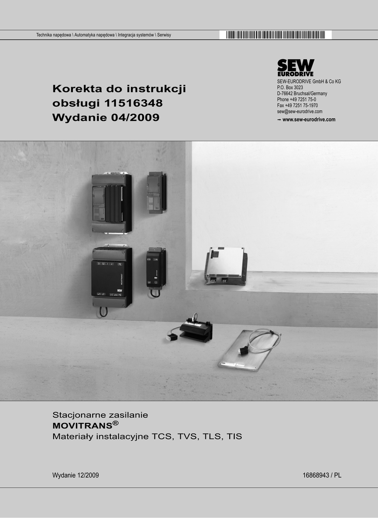 Technika napędowa \ Automatyka napędowa \ Integracja systemów \ Serwisy Korekta do instrukcji obsługi 11516348 Wydanie 04/2009 SEW-EURODRIVE GmbH & Co KG P.O. Box 3023 D-76642 Bruchsal/Germany Phone +49 7251 75-0 Fax +49 7251 75-1970 [email protected] www.sew-eurodrive.com Stacjonarne zasilanie MOVITRANS® Materiały instalacyjne TCS, TVS, TLS, TIS Wydanie 12/2009 16868943 / PL SEW-EURODRIVE—Driving the world Korekta 1 1 Korekta WSKAZÓWKA Niniejsza korekta obowiązuje dla instrukcji obsługi "MOVITRANS Materiały instalacyjne TCS, TVS, TLS, TIS", numer katalogowy 11516348, wydanie 04/2009. W opisanej powyżej instrukcji obsługi, rozdział "Instalacja / montaż komponentów instalacyjnych TIS10A008" zostaje całkowicie zastąpiony niniejszą korektą. Niniejszy rozdział uzupełniony został o dodatkowe informacje, których należy przestrzegać z uwagi na rozciągliwość materiału sztywnych listew profilowanych TIS...-P..-0 oraz elastycznych listew profilowanych TIS...-F..-0. Korekta – MOVITRANS® Materiały instalacyjne TCS, TVS, TLS, TIS 3 Montaż komponentów instalacyjnych TIS10A008... Wytyczne 2 2 Montaż komponentów instalacyjnych TIS10A008... 2.1 Wytyczne Komponenty instalacyjne TIS10A008... (uchwyty, listwy profilowane, blaszki mocujące, wyprowadzenia kablowe) przystosowane są do montowania na aluminiowych szynach profilowanych (np. przy elektrycznych przenośnikach podwieszanych) i do uniwersalnego montażu przy maszynach. Przy montowaniu na konstrukcji stalowej należy zastosować blaszkę ekranującą z aluminium. Przy montowaniu na aluminiowej szynie profilowanej i montowaniu uniwersalnym należy postępować w podany poniżej sposób: • • Do mocowania listew profilowanych TIS...-P..-0/TIS...-F..-0 należy zastosować następujące uchwyty TIS...-H..-0: Listwy profilowane Ilość potrzebnych mocowań Dla prostych odcinków: → sztywna listwa profilowana TIS...-P..-0 • • 2 sztuki / metry 1 sztuka / końcówka Dla łuków: → elastyczna listwa profilowana TIS...-F..-0 • • 3 sztuki / metry 1 sztuka / końcówka UWAGA! Wygięcie listwy profilowanej wskutek rozciągnięcia materiału pod wpływem wysokiej różnicy temperatur. Wydłużenie listwy profilowanej może prowadzić do odkształcenia falowego. – Zamontować pojedyncze segmenty listwy profilowanej z zachowaniem szczeliny pomiędzy elementami rzędu 10 mm (0,4 in). TIS 10A008-H02-0, TIS 10A008-XH2-0 TIS 10A008-P74-0 / TIS 10A008-F74-0 TIS 10A008-P33-0 / TIS 10A008-F33-0 Segment listwy profilowanej (prosty lub łuk) 10 mm (0,4 in) 2383653259 4 Korekta – MOVITRANS® Materiały instalacyjne TCS, TVS, TLS, TIS Montaż komponentów instalacyjnych TIS10A008... Sposób postępowania 2.2 2 Sposób postępowania Przy montowaniu na aluminiowej szynie profilowanej i montowaniu uniwersalnym należy postępować w podany poniżej sposób: 1. Wkręcić uchwyty TIS...-H..-0 w aluminiową szynę profilowaną lub w przypadku montowania uniwersalnego w uniwersalną blaszką mocującą TIS...-XH2-0. Na końcu i na początku każdego odcinka przesyłu energii należy umieścić po jednym uchwycie. Na danym odcinku, odległość pomiędzy uchwytami w linii prostej wynosi ok. 50 cm. Na odcinkach zakrzywionych, odstęp ten wynosi ok. 33 cm. 2. Należy upewnić się, że zamki obrotowe uchwytów są otwarte. 3. Wcisnąć listwy profilowane TIS...-P..-0/TIS...-F..-0 w uchwyty TIS...-H..-0, do zatrzaśnięcia blokady (patrz rysunek [A]). 4. Wyrównać listwy profilowane TIS...-P..-0/TIS...-F..-0. Uwzględnić przy tym odpowiednie odstępy z uwagi na rozciągliwość materiału (patrz Wytyczne (→ str. 4)). 5. Zamknąć zamki obrotowe uchwytów TIS...-H..-0 (patrz rys. [B]). [B] [A] [1] [2] [3] [4] [1] [2] [3] [4] 170157707 [1] [2] [3] [4] Aluminiowa szyna profilowana (w przypadku montowania uniwersalnego: konstrukcja z uniwersalną blaszką mocującą TIS10A008-XH2-0) Uchwyt TIS...-H..-0 Zamek obrotowy Listwa profilowana TIS...-P..-0/TIS...-F..-0 Korekta – MOVITRANS® Materiały instalacyjne TCS, TVS, TLS, TIS 5 Montaż komponentów instalacyjnych TIS10A008... Sposób postępowania 2 2.2.1 Montowanie na aluminiowej szynie profilowanej Poniższa ilustracja przedstawia komponenty instalacyjne TIS10A008... zamontowane na aluminiowej szynie profilowanej: [B] [A] [2] [1] [3] [9] [4] [5] [7] [6] [8] [9] 169915147 Wymiar montażowy [A] [B] Montowanie skrzynki kompensacyjnej TCS/rozdzielacza przyłączeniowego TVS Montowanie kompletnego systemu listew profilowanych TIS [1] [2] [3] [4] [5] [6] [7] [8] [9] Blaszka mocująca TIS10A008-X...-0 pasująca do stosowanej aluminiowej szyny profilowanej Tulejka wyprowadzenia kablowego TIS10A008-A00-0 Ramka wejściowa kabla TIS10A008-A74-0 do przewodów sterowniczych 8 mm2 Uchwyt TIS10A008-H..-0 pasujący do stosowanej aluminiowej szyny profilowanej sztywna listwa profilowana TIS10A008-P74-0 sztywna listwa profilowana TIS10A008-P33-0 elastyczna listwa profilowana TIS10A008-F33-0 elastyczna listwa profilowana TIS10A008-F74-0 Aluminiowa szyna profilowana (nie objęta dostawą) Na poniższej ilustracji przedstawiono wymiar montażowy dla zamontowanego systemu listew profilowanych, wymiary w mm (in): 74 (2.9) 74 (2.9) 33 (1.3) 33 (1.3) 180 (7.09) 33 (1.3) 74 (2.9) [A] [B] [C] 9007199424658315 [A] [B] [C] 6 Wymiar montażowy w przypadku profili AFT 180 z pasującym uchwytem (...-H00-0) i listwą profilowaną Wymiar montażowy w przypadku profili Cinetic 180 z pasującym uchwytem (...-H01-0) i listwą profilowaną Wymiar montażowy w przypadku profili Dürr 180 z pasującym (uniwersalnym) uchwytem (...-H02-0) i listwą profilowaną Korekta – MOVITRANS® Materiały instalacyjne TCS, TVS, TLS, TIS Montaż komponentów instalacyjnych TIS10A008... Sposób postępowania 2.2.2 2 Montowanie uniwersalne Na poniższej ilustracji przedstawiono zamontowane komponenty instalacyjne TIS10A008... • na konstrukcji aluminiowej [A] i • na konstrukcji stalowej [B]: [1] [2] [3] [9] [4] [5] [6] [7] [3] 