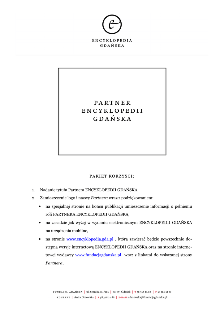 P A K I ET K O R ZY Ś CI : 1. Nadanie tytułu Partnera ENCYKLOPEDII GDAŃSKA. 2. Zamieszczenie logo i nazwy Partnera wraz z podziękowaniem: • na specjalnej stronie na końcu publikacji umieszczenie informacji o pełnieniu roli PARTNERA ENCYKLOPEDII GDAŃSKA, • na zasadzie jak wyżej w wydaniu elektronicznym ENCYKLOPEDII GDAŃSKA na urządzenia mobilne, • na stronie www.encyklopedia.gda.pl , która zawierać będzie powszechnie dostępna wersję internetową ENCYKLOPEDII GDAŃSKA oraz na stronie internetowej wydawcy www.fundacjagdanska.pl wraz z linkami do wskazanej strony Partnera, • we wszystkich materiałach promocyjnych, informacyjnych i prasowych związanych z promocją wydania ENCYKLOPEDII GDAŃSKA. 3. Promocja Partnera podczas oficjalnych wydarzeń związanych z wydaniem ENCYKLOPEDII GDAŃSKA. 4. Przekazanie 1 numerowanego egzemplarza ENCYKLOPEDII GDAŃSKA, ręcznie oprawionego w skórę safianową w kolorze czerwieni gdańskiej w edycji o nr … ze specjalnym ekslibrisem oraz specjalnym ręcznie wykonanym ozdobnym pudełkiem. 5. Przekazanie 5 numerowanych egzemplarzy w edycji od nr … do nr … ENCYKLOPEDII GDAŃSKA w wydaniu korporacyjnym w oprawie twardej płóciennej oraz specjalnie ręcznie wykonanym etui. 6. Przekazanie 5 egzemplarzy wydania w wersji podstawowej w oprawie twardej całopapierowej. 7. Otrzymanie 10 egzemplarzy ENCYKLOPEDII GDAŃSKA w wersji podstawowej w oprawie twardej całopapierowej na zrealizowanie akcji pod roboczym hasłem ENCYKLOPEDIA GDAŃSKA DLA SZKÓŁ z dodatkowym ekslibrisem darczyńcy. Wartość: 20 tys. zł netto