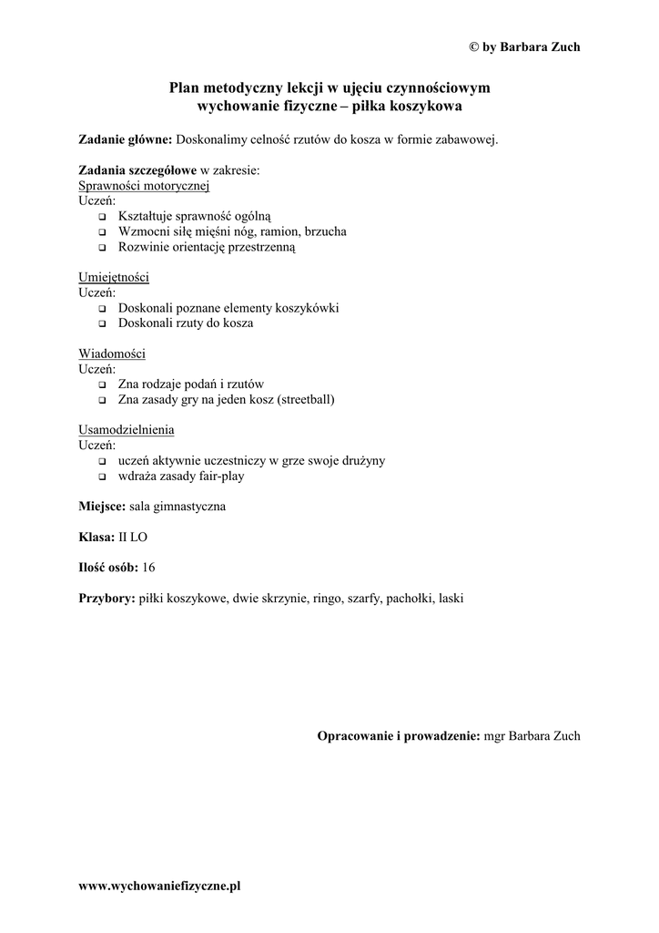 E\%DUEDUD=XFK 3ODQPHWRG\F]Q\OHNFMLZXM FLXF]\QQRFLRZ\P Z\FKRZDQLHIL]\F]QH± SLáNDNRV]\NRZD =DGDQLHJáyZQH 'RVNRQDOLP\FHOQRüU]XWyZGRNRV]DZIRUPLH]DEDZRZHM =DGDQLDV]F]HJyáRZHZ]DNUHVLH 6SUDZQRFLPRWRU\F]QHM 8F]H .V]WDáWXMHVSUDZQRüRJyOQ :]PRFQLVLá PL QLQyJUDPLRQEU]XFKD 5R]ZLQLHRULHQWDFM SU]HVWU]HQQ 8PLHM WQRFL 8F]H 'RVNRQDOLSR]QDQHHOHPHQW\NRV]\NyZNL 'RVNRQDOLU]XW\GRNRV]D :LDGRPRFL 8F]H =QDURG]DMHSRGD LU]XWyZ =QD]DVDG\JU\QDMHGHQNRV]VWUHHWEDOO 8VDPRG]LHOQLHQLD 8F]H XF]H DNW\ZQLHXF]HVWQLF]\ZJU]HVZRMHGUX*\Q\ ZGUD*D]DVDG\IDLUSOD\ 0LHMVFH VDODJLPQDVW\F]QD .ODVD ,,/2 ,ORüRVyE 3U]\ERU\ SLáNLNRV]\NRZHGZLHVNU]\QLHULQJRV]DUI\SDFKRáNLODVNL 2SUDFRZDQLHLSURZDG]HQLH PJU%DUEDUD=XFK ZZZZ\FKRZDQLHIL]\F]QHSO E\%DUEDUD=XFK &] ü OHNFML &=û :673 1$ &=û $ &=û % 'RFHORZH &]\QQRFL RUJDQL]DF\MQR SRU]GNRZH 8PRW\ZRZDQLH GR]DM ü 3V\FKLF]QHL IL]MRORJLF]QH R*\ZLHQLHJUXS\ 3U]\JRWXMHDSDUDW UXFKXGR Z]PR*RQHJR Z\VLáNX 8F]HVWQLF]\Z ]DEDZDFK &]\QQRFLXF]QLD =DGDQLD =ELyUNDSRZLWDQLHVSUDZG]HQLH REHFQRFLNRQWURODVWURMX 8]DVDGQLHQLH GODF]HJRVNXWHF]QRü U]XWyZMHVWWDNZD*Q\PHOHPHQWHPJU\ ZNRV]\NyZN 8FLHNDMFDEUDPND ZSU]HFLZQ\FK GUX*\QDFKGZyFKüZLF]F\FKWU]\PD ODVN VWDQRZL RQLEUDPN JUDF]HPDM ]D]DGQLHWUDILüSLáN ZZLDWáREUDPNL SU]HFLZQLNDSRUXV]DMFVL SR RNUHORQ\PZF]HVQHMSROX :SDUDFK ND*G\üZLF]F\PDSLáN MHGQDRVRED]SDU\SURZDG]LUR]JU]HZN GUXJDM QDODGXMHSRPLQ]PLDQD± SURZDG]LGUXJLüZLF]F\ .WRSLHUZV]\± XVWDZLDP\SLáNL NRV]\NRZHQDOLQLLURGNRZHMERLVNDZ NyáNDFKULQJR1DOLQLDFKPQD Z\VRNRFLND*GHMSLáNLXVWDZLDM VL RGSRZLHGQLR]HVSRá\$L%1DV\JQDá VWDUWGRVZRMHMSLáNL]HEUDQLHSLáNL NR]áRZDQLHZELHJXSRGVZyMNRV]L RGGDQLHU]XWX2VREDNWyUDQLH]HEUDáD SLáNLGRVWDMH]DGDQLHGRGDWNRZH± RGSRZLHG( QDS\WDQLH]]DNUHVX SU]HSLVyZJU\ZNRV]D6WDUWGRSLáNL RGE\ZDVL Uy*Q\FKSR]\FML Z\MFLRZ\FKQS SRVWDZDW\áHPGRSLáNL SU]\VLDGSRGSDUW\W\áHPGRSLáNL OH*HQLHSU]RGHP55ZJyU XF]QLRZLHZ\NRQXM üZQD0% &]\QQRFL QDXF]\FLHOD 6SUDZG]DVWDQ NODV\ 0RW\ZXMHGR]DM ü .RQWUROXMHSU]HELHJ ]DEDZ\ =ZUDFDXZDJ QD EH]SLHF]HVWZR GDMHV\JQDáGR VWDUWX .RQWUROXMH SRSUDZQRü Z\NRQDQLD]DGDQLD 2GPLHU]DF]DV NRQWUROXMH SRSUDZQRüJU\ 6 G]LXMHNRQWUROXMH JU &]XZDQDG EH]SLHF]HVWZHP 3U]\SRPLQD]DVDG\ ZVND]XMH ]Z\FL ]F 8VWDZLDP\GZLHVNU]\QLH± RWZDUWHSRG :\áDQLD]Z\FL VNL NRV]DPLZND*GHMVNU]\QLMHVWSLáHN ]HVSyá 'UX*\Q\$L%VWDM SOHFDPLGRVLHELHQD OLQLLURGNRZHMERLVND1DV\JQDáQOD GUX*\Q\VWDUXM GRVNU]\ LSU]HQRV] SLáNL]HVNU]\QLSU]HFLZQLNDGRVZRMHM VWRVXMFSU]HSLV\JU\%LHJ]JRGQLH]H ZVND]yZNDPL]HJDUD ZZZZ\FKRZDQLHIL]\F]QHSO 0HWRG\ E\%DUEDUD=XFK 1DURGNXVDOLXVWDZLDP\VNU]\QL RWZDUW'UX*\QD$± DWDNXMFD XVWDZLRQDZUR]V\SFHGUX*\QD% EURQLFDXVWDZLRQDQDNROH± ZRNyá VNU]\QL QLHZROQRZFKRG]LüGRURGND NRáD1DV\JQDá]DZRGQLF\GUX*\QD$ ]ELHUDM UR]V\SDQHSLáNLSR6DOLL VWRVXMFSU]HSLV\JU\VWDUDWUDILüSLáN GR VNU]\QL'UX*\QD%EURQLGRVW SX ]JRGQLH]SU]HSLVDPL &=û 8VSRNRL .2&2 RUJDQL]PSR :$ Z\VLáNX .RV]\NDUVNLSDODQW± 'UX*\QD$L% VWRM QDOLQLLU]XWyZ]DSNWQD SU]HFLZOHJá\FKERLVNDFK=DZRGQLN GUX*\Q\$]URJXVDOLZ\U]XFDSLáN Z GRZROQHPLHMVFHZNLHUXQNXGUX*\Q\% MHGQRF]HQLHVWDUWXM LVWDUDVL RELHF ERLVNRGRNRáD± GRPLHMVFDZ\U]XWX Z MDNQDMNUyWV]\PF]DVLH*G\SLáNDPLQLH SRáRZ ERLVNDGUX*\QD$VWDUXMHZ NLHUXQNXNRV]DGUX*\Q\%LSU]HV]NDG]D LPZ]GRE\FLXNRV]D&]DVUR]HJUDQLD GOD]HVSRáX%Z\]QDF]DELHJ]DZRGQLND $-HOLGUX*\QD%]G*\]GRE\üNRV]WR ]GRE\ZDSNWMHOLQLHGUX*\QD$ ]GRE\ZDSNW-HOLGUX*\QD$ SU]HFKZ\FLSLáN ZF]DVLHELHJXVZRMHJR ]DZRGQLNDL]GRE G]LHNRV] WR]GRE\ZD SNW 'RZROQHU]XW\GRNRV]D Ä0LQXWND´ RFHQLSR]LRPZáDVQ\FKXPLHM WQRFL ZZZZ\FKRZDQLHIL]\F]QHSO 2PyZLOHNFM 2FHQLLSRGVXPXMH DNW\ZQRüXF]QLyZ QDOHNFML