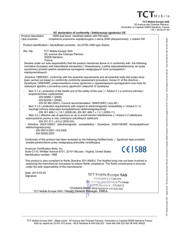 Product description Opis produktu : EC declaration of conformity / Deklararacja zgodności CE GSM dual band handheld station with FM radio Urządzenie przenośne współpracujące z siecią GSM (dwupasmowo), z radiem FM Product identification / Identyfikator produktu: ALCATEL1060 type Zidane We / My TCT Mobile Europe SAS 55, avenue des Champs Pierreux 92000 Nanterre France Declare under our sole responsibility that the product mentioned above is in conformity with the following normative European and International standard(s):/ Oświadczamy z pełną odpowiedzialnością, że wyżej wymieniony produkt spełnia zasadnicze wymagania następujących norm europejskich i międzynarodowych: -Directive 1999/5/EC, conformity with the essential requirements and all essential radio test suites have been carried out based on conformity conformity assessment procedure :Annex IV of the directive. Dyrektywa 1999/5/WE, przeprowadzono ocenę zgodności z najważniejszymi wymaganiami oraz testy fal radiowych zgodnie z procedurą oceny zgodności: załącznik IV dyrektywy. Item 3.1.a ( protection of the health and of the safety of the user ) / Artykuł 3.1.a (ochrona zdrowia i bezpieczeństwa użytkownika) - EN 60950-1 (2006) - EN 62209-1 (2006) - EN 50 360 (2001), Council recommendation 1999/519/EC (July 99 ) Item 3.1.b ( protection requirements with respect to electromagnetic compatibility ) / Artykuł 3.1.b (wymogi ochrony dotyczące kompatybilności elektromagnetycznej) - EN 301 489-1 v.1.8.1 (2008-04), EN 301 489-7 v.1.3.1 (2005-11) - Item 3.2 ( effective use of spectrum so as to avoid harmful interferences ) / Artykuł 3.2 (efektywne wykorzystanie pasma w celu uniknięcia szkodliwych zakłóceń) - EN 301 511 v.9.0.2 (2003-03), - Directive 2004/108/EC (electromagnetic compatibility)./ Dyrektywy 2004/108/WE (kompatybilności elektromagnetycznej) - EN 55013:2001 +A2:2006 - EN 55020:2007 - Conformity of this product has been reviewed by the following Notified body. / Zgodność tego produktu została potwierdzona przez następującą jednostkę certyfikującą. American Certification Body, Inc. Suite C110, Whittier Avenue 6731, 22101 McLean, Virginia, United States Identification number: 1588 This product is also compliant to RoHs Directive 2011/65/EU. The Notified body has not been involved in assessing the manufacturer processes to ensure RoHs compliance. The RoHs complicance is ensured under the sole responsibility of the manufacturer. Date :2013-03-22 Signature Christophe Benoit TCT Mobile Europe SAS / Deputy General Manager, EMEA. ____________________________________________________________________________________________________________________ TCT Mobile Europe SAS - Siège social : 55 Avenue des Champs Pierreux, Immeuble Le Capitole 92000 Nanterre France SAS au capital de 23 031 072 euros - RCS Nanterre B 440 038 222 - Siret 440 038 222 000 38 APE 4652Z TCT Mobile Europe SAS - Siège social : 55 Avenue des Champs Pierreux, Immeuble Le Capitole 92000 Nanterre France SAS au capital de 23 031 072 euros - RCS Nanterre B 440 038 222 - Siret 440 038 222 000 38 APE 4652Z TCT Mobile Europe SAS 55 Avenue des Champs Pierreux, Immeuble Le Capitole 92000 Nanterre, France +33 1 46 52 61 00