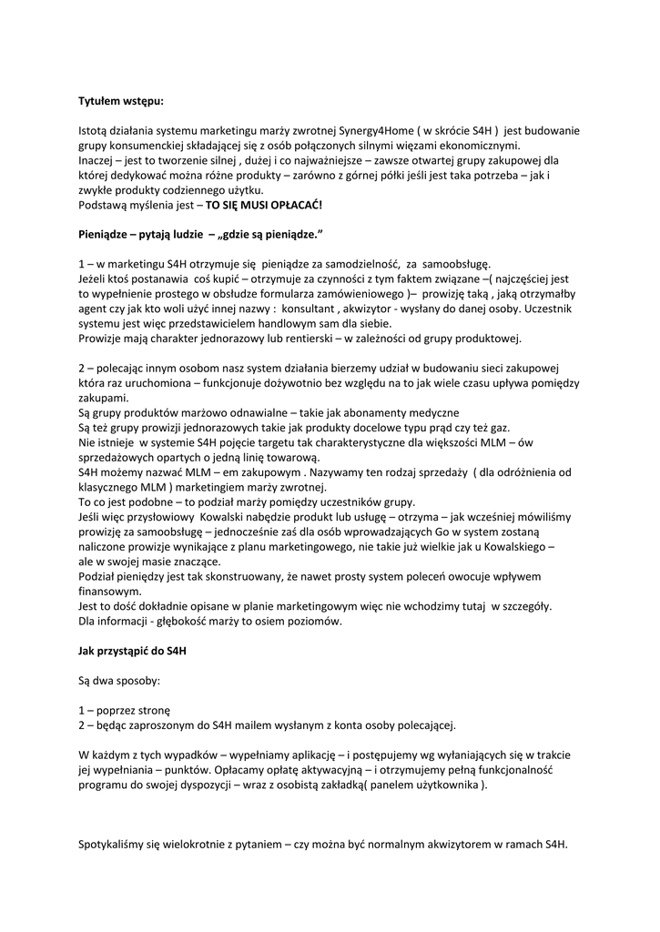 Tytułem wstępu: Istotą działania systemu marketingu marży zwrotnej Synergy4Home ( w skrócie S4H ) jest budowanie grupy konsumenckiej składającej się z osób połączonych silnymi więzami ekonomicznymi. Inaczej – jest to tworzenie silnej , dużej i co najważniejsze – zawsze otwartej grupy zakupowej dla której dedykować można różne produkty – zarówno z górnej półki jeśli jest taka potrzeba – jak i zwykłe produkty codziennego użytku. Podstawą myślenia jest – TO SIĘ MUSI OPŁACAĆ! Pieniądze – pytają ludzie – „gdzie są pieniądze.” 1 – w marketingu S4H otrzymuje się pieniądze za samodzielność, za samoobsługę. Jeżeli ktoś postanawia coś kupić – otrzymuje za czynności z tym faktem związane –( najczęściej jest to wypełnienie prostego w obsłudze formularza zamówieniowego )– prowizję taką , jaką otrzymałby agent czy jak kto woli użyć innej nazwy : konsultant , akwizytor - wysłany do danej osoby. Uczestnik systemu jest więc przedstawicielem handlowym sam dla siebie. Prowizje mają charakter jednorazowy lub rentierski – w zależności od grupy produktowej. 2 – polecając innym osobom nasz system działania bierzemy udział w budowaniu sieci zakupowej która raz uruchomiona – funkcjonuje dożywotnio bez względu na to jak wiele czasu upływa pomiędzy zakupami. Są grupy produktów marżowo odnawialne – takie jak abonamenty medyczne Są też grupy prowizji jednorazowych takie jak produkty docelowe typu prąd czy też gaz. Nie istnieje w systemie S4H pojęcie targetu tak charakterystyczne dla większości MLM – ów sprzedażowych opartych o jedną linię towarową. S4H możemy nazwać MLM – em zakupowym . Nazywamy ten rodzaj sprzedaży ( dla odróżnienia od klasycznego MLM ) marketingiem marży zwrotnej. To co jest podobne – to podział marży pomiędzy uczestników grupy. Jeśli więc przysłowiowy Kowalski nabędzie produkt lub usługę – otrzyma – jak wcześniej mówiliśmy prowizję za samoobsługę – jednocześnie zaś dla osób wprowadzających Go w system zostaną naliczone prowizje wynikające z planu marketingowego, nie takie już wielkie jak u Kowalskiego – ale w swojej masie znaczące. Podział pieniędzy jest tak skonstruowany, że nawet prosty system poleceń owocuje wpływem finansowym. Jest to dość dokładnie opisane w planie marketingowym więc nie wchodzimy tutaj w szczegóły. Dla informacji - głębokość marży to osiem poziomów. Jak przystąpić do S4H Są dwa sposoby: 1 – poprzez stronę 2 – będąc zaproszonym do S4H mailem wysłanym z konta osoby polecającej. W każdym z tych wypadków – wypełniamy aplikację – i postępujemy wg wyłaniających się w trakcie jej wypełniania – punktów. Opłacamy opłatę aktywacyjną – i otrzymujemy pełną funkcjonalność programu do swojej dyspozycji – wraz z osobistą zakładką( panelem użytkownika ). Spotykaliśmy się wielokrotnie z pytaniem – czy można być normalnym akwizytorem w ramach S4H. Odpowiedź brzmi – można , jak najbardziej . Spisujemy wówczas umowę agencyjną. Jedyne co jednakowoż jest potrzebne ( jeśli chodzi o obliczenia - wręcz niezbędne ) to zapisanie danego agenta w systemie. Unikamy , jak tylko to jest możliwe , nadmiaru kosztów. Nie chcemy prowadzić podwójnych systemów rozliczeń. W tym przypadku postępujemy zgodnie z ogólnymi zasadami z tym, że wysyłamy dodatkowo pismo na temat chęci bycia przedstawicielem handlowym na adres biuro@............ podany na stronie. Jacek Gajewski – dyr. ds. marketingu
