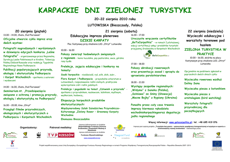KARPACKIE DNI ZIELONEJ TURYSTYKI 20-22 sierpnia 2010 roku LUTOWISKA (Bieszczady, Polska) 20 sierpnia (piątek) 13.00 – 14.00, Chata „Pod Florianem“ Oficjalne otwarcie cyklu imprez oraz dwóch wystaw: Fotografii nagrodzonych i wyróznionych w dziewięciu edycjach konkursu „Leśne fotografie” - organizowanego przez Regionalną Dyrekcję Lasów Państwowych w Krośnie, Telewizję Polską Oddział Rzeszów oraz redakcję Tygodnika Regionalnego Nowe Podkarpacie Publikacji popularyzujących przyrodę, ekologię i ekoturystykę Podkarpacia i Karpat Wschodnich – spotkania z autorami i wydawcami Plac festynowy przy stadionie LKS „Otryt“ Lutowiska 10.00 – 16.00 Seminarium nt. „Przedsięwzięcia związane z ochroną i promocją przyrody, ekologią i ekoturystyką na Podkarpaciu“ 16.00 – 20.00, Kino „Otryt“ Przegląd filmów przyrodniczych, ekologicznych i ekoturystycznch o Podkarpaciu i Karpatach Wschodnich „GoToCarpathia“ - w ramach I pilotażowej edycji certyfikacji usług i produktów turystyki przyjaznej środowisku w Karpatach Wschodnich Pokazy zwierząt hodowlanych związanych z regionem - konie huculskie, psy pasterskie, owce, górskie rasy bydła Prelekcje, zajęcia edukacyjne i konkursy na tematy: Ssaki karpackie - niedźwiedź, ryś, wilk, żbik, żubr... Flora Karpat i Podkarpacia - przyszkolne arboretum w Lutowiskach, rozpoznawanie roślin zielnych, praktyczne wykorzystanie ziół i roślin jadalnych 14.00 – 16.00, Chata „Pod Florianem“ Organizatorzy: 21 sierpnia (sobota) 16.00 – 17.00 Edukacyjna impreza plenerowa Uroczyste wręczenie certyfikatów DZIKIE KARPATY Prelekcje i pogadanki na temat „Człowiek a przyroda” spotkania z przyrodnikem, naukowcem, leśnikiem, myśliwym, wędkarzem, hodowcą... Ekspozycja karpackich produktów ekoturystycznych: Międzynarodowy Szlak Dziedzictwa PrzyrodniczoKulturowego „Zielony Rower – Greenway Karpaty Wschodnie Ekomuzea Bieszczadzkie Patronat medialny: Impreza dofinansowana ze środków Wojewódzkiego Funduszu Ochrony Środowiska i Gospodarki Wodnej w Rzeszowie mpreza dofinansowana ze środków 22 sierpnia (niedziela) Wycieczki edukacyjne i warsztaty terenowe pod hasłem ZIELONA TURYSTYKA W PRAKTYCE 10.00 – 16.00, zbiórka na placu festynowym przy stadionie LKS „Otryt“ Lutowiska 17.00 – 18.00 Pokazy akrobacji rowerowych oraz prezentacja zasad i sprzętu do uprawiania parolotniarstwa 18.00 – 21.00 Występy zespołów regionalnych: „Widymo“ z Sanoka (Polska), „Sziniawa“ ze Sniny (Słowacja) „Mocne Bojky“ z Rypiany (Ukraina) Ponadto przez cały czas trwania imprezy kiermasz rękodzieła wschodniokarpackiegooraz degustacja jadła regionalnego Opcjonalnie na podstawie zgłoszeń w poprzednich dwóch dniach cyklu: Wycieczka rowerowa wzdłuż Doliny Sanu Wycieczka piesza z botanikiem Wycieczka piesza z ornitologiem (bird watching) Warsztaty fotografii przyrodniczej dla początkujących Więcej informacji: www.gotocarpathia.pl; tel. +48 695 419 076 Impreza jest częścią projektu „Turystyka bez granic – wzmocnienie współpracy transgranicznej w turystyce w oparciu o zrównoważony rozwój środowiska” realiowanego przez: Funduszu Wyszehradzkiego www.visegradfund.org Projekt współfinansowany przez Unię Europejską z Europejskiego Funduszu Rozwoju Regionalnego w ramach Programu Współpracy Transgranicznej Rzeczpospolita Polska – Republika Słowacka 2007- 2013
