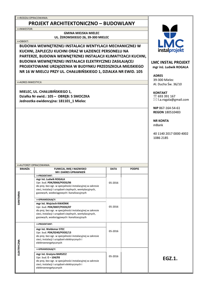 >>RODZAJ OPRACOWANIA: PROJEKT ARCHITEKTONICZNO – BUDOWLANY >>INWESTOR: GMINA MIEJSKA MIELEC UL. ŻEROMSKIEGO 26, 39-300 MIELEC >>OBIEKT: BUDOWA WEWNĘTRZNEJ INSTALACJI WENTYLACJI MECHANICZNEJ W KUCHNI, ZAPLECZU KUCHNI ORAZ W ŁAZIENCE PERSONELU NA PARTERZE, BUDOWA WEWNĘTRZNEJ INSTALACJI KLIMATYZACJI KUCHNI, BUDOWA WEWNĘTRZNEJ INSTALACJI ELEKTRYCZNEJ ZASILAJĄCEJ PROJEKTOWANE URZĄDZENIA W BUDYNKU PRZEDSZKOLA MIEJSKIEGO NR 16 W MIELCU PRZY UL. CHAŁUBIŃSKIEGO 1, DZIALKA NR EWID. 105 LMC INSTAL PROJEKT mgr inż. Ludwik ROGALA ADRES 39-300 Mielec Al. Ducha Św. 36/10 >>ADRES INWESTYCJI: MIELEC, UL. CHAŁUBIŃSKIEGO 1, Działka Nr ewid.: 105 – OBRĘB: 5 SMOCZKA Jednostka ewidencyjna: 181101_1 Mielec KONTAKT ℡ 693 391 167 [email protected] NIP 867-164-54-61 REGON 180510483 NR KONTA mBank 40 1140 2017 0000 4002 1086 2185 >>AUTORZY OPRACOWANIA: BRANŻA FUNKCJA, IMIĘ I NAZWISKO NR I ZAKRES UPRAWNIEŃ DATA PODPIS SANITARNA >>PROJEKTANT: mgr inż. Ludwik ROGALA Upr. bud. PDK/0066/POOS/06 do proj. bez ogr. w specjalności instalacyjnej w zakresie sieci, instalacji i urządzeń cieplnych, wentylacyjnych, gazowych, wodociągowych i kanalizacyjnych 05-2016 >>SPRAWDZAJĄCY: mgr inż. Wojciech KWAŚNIK Upr. bud. PDK/0007/POOS/07 do proj. bez ogr. w specjalności instalacyjnej w zakresie sieci, instalacji i urządzeń cieplnych, wentylacyjnych, gazowych, wodociągowych i kanalizacyjnych 05-2016 ELEKTRYCZNA >>PROJEKTANT: mgr inż. Waldemar STEC Upr. bud. PDK/0240/POOE/13 do proj. bez ogr. w specjalności instalacyjnej w zakresie sieci, instalacji i urządzeń elektrycznych i elektroenergetycznych 05-2016 >>SPRAWDZAJĄCY: mgr inż. Grażyna BARSZCZ Upr. bud. E – 104/93 do proj. bez ogr. w specjalności instalacyjnej w zakresie sieci, instalacji i urządzeń elektrycznych i elektroenergetycznych 05-2016 EGZ.1. Spis zawartości opracowania projektu ETAP – projekt architektoniczno – budowlany 1.Spis zawartości opracowania projektu budowlanego 2.Oświadczenie projektantów 3. Informacja BIOZ 4. Projekt architektoniczno – budowlany wewnętrznej instalacji wentylacji i klimatyzacji 4.1. Część opisowa 4.2. Część rysunkowa 5. Projekt architektoniczno – budowlany wewnętrznej instalacji elektrycznej zasilającej projektowane urządzenia 5.1. Część opisowa 5.2. Część rysunkowa str. 2 str. 3 str. 4 str. 9 str. 9 str. 16 str. 24 str. 24 str. 29 Opracował: mgr inż. Ludwik Rogala OŚWIADCZENIE Po zapoznaniu się z przepisami ustawy z dnia 7 lipca 1994r. PRAWO BUDOWLANE (DZ.U.06.156.1118 z późniejszymi zmianami) zgodnie z art. 20 ust. 4 tej ustawy OŚWIADCZAMY, ŻE PROJEKT BUDOWLANY POD NAZWĄ: „Budowa wewnętrznej instalacji wentylacji mechanicznej w kuchni, zapleczu kuchni oraz w łazience personelu na parterze, budowa wewnętrznej instalacji klimatyzacji kuchni, budowa wewnętrznej instalacji elektrycznej zasilającej projektowane urządzenia w Budynku Przedszkola Miejskiego Nr 16 w Mielcu przy ul. Chałubińskiego 1, dz. Nr ewid. 105” Adres inwestycji: Mielec, ul. Chałubińskiego 1 Dz. Nr ewid. 105 – Obręb: 5 Smoczka Jedn. ewid.: 181101_1 – Mielec Inwestor: GMINA MIEJSKA MIELEC ul. Żeromskiego 26 39-300 Mielec ZOSTAŁ SPORZĄDZONY ZGODNIE Z OBOWIĄZUJĄCYMI PRZEPISAM ORAZ ZASADAMI WIEDZY TECHNICZNEJ. 1. Branża sanitarna: mgr inż. Ludwik Rogala Upr.nr. PDK/0066/POOS/06 2. Branża sanitarna: mgr inż. Wojciech Kwaśnik Upr.nr. PDK/0007/POOS/07 3. Branża elektryczna: mgr inż. Waldemar Stec Upr.nr. PDK/0240/POOE/13 4. Branża elektryczna: mgr inż. Grażyna Barszcz Upr.nr. E – 104/93 Maj 20016 r. INFORMACJA BEZPIECZEŃSTWA I OCHRONY ZDROWIA I . Nazwa inwestycji: „Budowa wewnętrznej instalacji wentylacji mechanicznej w kuchni, zapleczu kuchni oraz w łazience personelu na parterze, budowa wewnętrznej instalacji klimatyzacji kuchni, budowa wewnętrznej instalacji elektrycznej zasilającej projektowane urządzenia w Budynku Przedszkola Miejskiego Nr 16 w Mielcu przy ul. Chałubińskiego 1, dz. Nr ewid. 105” II . Adres inwestycji: Mielec, ul. Chałubińskiego 1 Dz. Nr ewid. 105 – Obręb: 5 Smoczka Jedn. ewid.: 181101_1 – Mielec III . Inwestor: GMINA MIEJSKA MIELEC ul. Żeromskiego 26 39-300 Mielec IV . Autor: mgr inż. Ludwik Rogala Upr. nr PDK/0066/POOS/06 Maj 2016 r. Spis treści 1. Podstawa prawna 2. Zakres robót 3. Wykaz istniejących obiektów budowlanych podlegających adaptacji i rozbiórce 4. Wskazanie elementów które mogą stwarzać zagrożenie bezpieczeństwa i zdrowia ludzi 5. Zagrożenia występujące podczas realizacji robót budowlanych 6. Wydzielenie i oznakowanie miejsca prowadzenia robót 7. Instruktaż pracowników 8. Środki techniczne i organizacyjne zapobiegające niebezpieczeństwom wynikającym z wykonywana robót budowlanych w strefach szczególnego zagrożenia zdrowia 9. Przechowywanie i przemieszczanie materiałów na terenie budowy 1. Podstawa prawna 1.1. Ustawa z dnia 7 lipca 1994 r. Prawo budowlane (Dz.U. z 2000 r. Nr 106, poz. 1126, z późniejszymi zmianami) 1.2. Rozporządzenie Ministra Infrastruktury z dnia 23. 06. 2003 r. w sprawie informacji dotyczącej bezpieczeństwa i ochrony zdrowia oraz planu bezpieczeństwa i ochrony zdrowia Dz.U. z 2003r. Nr 120 poz. 1126 2. Zakres robót Budowa wewnętrznej instalacji wentylacji mechanicznej w kuchni, zapleczu kuchni oraz w łazience personelu na parterze, budowa wewnętrznej instalacji klimatyzacji kuchni, budowa wewnętrznej instalacji elektrycznej zasilającej projektowane urządzenia w Budynku Przedszkola Miejskiego Nr 16 w Mielcu przy ul. Chałubińskiego 1, dz. Nr ewid. 105”. 3. Wykaz istniejących obiektów budowlanych podlegających adaptacji i rozbiórce Nie przewiduje się. 4. Wskazanie elementów które mogą stwarzać zagrożenie bezpieczeństwa i zdrowia ludzi Elementy stwarzające zagrożenie to: - kable wewnętrznej instalacji elektroenergetycznej, 5. Zagrożenia występujące podczas realizacji robót budowlanych Roboty budowlane, których charakter, organizacja lub