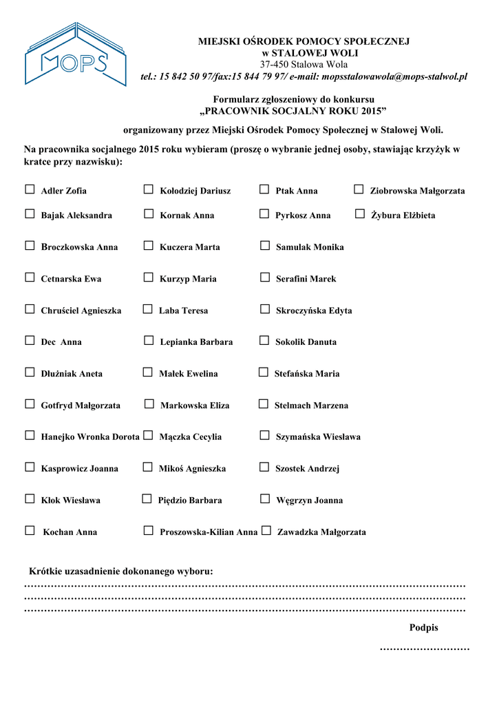 MIEJSKI OŚRODEK POMOCY SPOŁECZNEJ w STALOWEJ WOLI 37-450 Stalowa Wola tel.: 15 842 50 97/fax:15 844 79 97/ e-mail: [email protected] Formularz zgłoszeniowy do konkursu „PRACOWNIK SOCJALNY ROKU 2015” organizowany przez Miejski Ośrodek Pomocy Społecznej w Stalowej Woli. Na pracownika socjalnego 2015 roku wybieram (proszę o wybranie jednej osoby, stawiając krzyżyk w kratce przy nazwisku): □ Adler Zofia □ Bajak Aleksandra □ Kołodziej Dariusz □ Kornak Anna □ Ptak Anna □ Pyrkosz Anna □ Broczkowska Anna □ Kuczera Marta □ Samulak Monika □ Cetnarska Ewa □ Kurzyp Maria □ Serafini Marek □ Chruściel Agnieszka □ Laba Teresa □ Skroczyńska Edyta □ Dec Anna □ Lepianka Barbara □ Sokolik Danuta □ Dłużniak Aneta □ Małek Ewelina □ Stefańska Maria □ Gotfryd Małgorzata □ Markowska Eliza □ Stelmach Marzena □ Ziobrowska Małgorzata □ Żybura Elżbieta □ Hanejko Wronka Dorota □ Mączka Cecylia □ Szymańska Wiesława □ Kasprowicz Joanna □ Mikoś Agnieszka □ Szostek Andrzej □ Kłok Wiesława □ Piędzio Barbara □ Węgrzyn Joanna □ □ Proszowska-Kilian Anna □ Zawadzka Małgorzata Kochan Anna Krótkie uzasadnienie dokonanego wyboru: …………………………………………………………………………………………………………………… …………………………………………………………………………………………………………………… …………………………………………………………………………………………………………………… Podpis ………………………