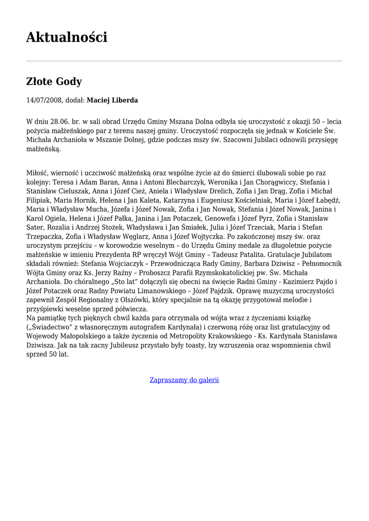 Aktualności Złote Gody 14/07/2008, dodał: Maciej Liberda W dniu 28.06. br. w sali obrad Urzędu Gminy Mszana Dolna odbyła się uroczystość z okazji 50 – lecia pożycia małżeńskiego par z terenu naszej gminy. Uroczystość rozpoczęła się jednak w Kościele Św. Michała Archanioła w Mszanie Dolnej, gdzie podczas mszy św. Szacowni Jubilaci odnowili przysięgę małżeńską. Miłość, wierność i uczciwość małżeńską oraz wspólne życie aż do śmierci ślubowali sobie po raz kolejny: Teresa i Adam Baran, Anna i Antoni Blecharczyk, Weronika i Jan Chorągwiccy, Stefania i Stanisław Cieluszak, Anna i Józef Cież, Aniela i Władysław Drelich, Zofia i Jan Drąg, Zofia i Michał Filipiak, Maria Hornik, Helena i Jan Kaleta, Katarzyna i Eugeniusz Kościelniak, Maria i Józef Łabędź, Maria i Władysław Mucha, Józefa i Józef Nowak, Zofia i Jan Nowak, Stefania i Józef Nowak, Janina i Karol Ogiela, Helena i Józef Pałka, Janina i Jan Potaczek, Genowefa i Józef Pyrz, Zofia i Stanisław Sater, Rozalia i Andrzej Stożek, Władysława i Jan Śmiałek, Julia i Józef Trzeciak, Maria i Stefan Trzepaczka, Zofia i Władysław Węglarz, Anna i Józef Wojtyczka. Po zakończonej mszy św. oraz uroczystym przejściu – w korowodzie weselnym – do Urzędu Gminy medale za długoletnie pożycie małżeńskie w imieniu Prezydenta RP wręczył Wójt Gminy – Tadeusz Patalita. Gratulacje Jubilatom składali również: Stefania Wojciaczyk – Przewodnicząca Rady Gminy, Barbara Dziwisz – Pełnomocnik Wójta Gminy oraz Ks. Jerzy Raźny – Proboszcz Parafii Rzymskokatolickiej pw. Św. Michała Archanioła. Do chóralnego „Sto lat” dołączyli się obecni na święcie Radni Gminy - Kazimierz Pajdo i Józef Potaczek oraz Radny Powiatu Limanowskiego – Józef Pajdzik. Oprawę muzyczną uroczystości zapewnił Zespół Regionalny z Olszówki, który specjalnie na tą okazję przygotował melodie i przyśpiewki weselne sprzed półwiecza. Na pamiątkę tych pięknych chwil każda para otrzymała od wójta wraz z życzeniami książkę („Świadectwo” z własnoręcznym autografem Kardynała) i czerwoną różę oraz list gratulacyjny od Wojewody Małopolskiego a także życzenia od Metropolity Krakowskiego - Ks. Kardynała Stanisława Dziwisza. Jak na tak zacny Jubileusz przystało były toasty, łzy wzruszenia oraz wspomnienia chwil sprzed 50 lat. Zapraszamy do galerii