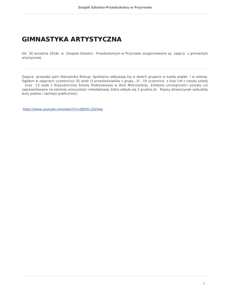 Zespół Szkolno-Przedszkolny w Przyrowie GIMNASTYKA ARTYSTYCZNA Od 30 września 2016r. w Zespole Szkolno - Przedszkolnym w Przyrowie zorganizowane są zajęcia z gimnastyki artystycznej. Zajęcia prowadzi pani Aleksandra Biskup. Spotkania odbywają się w dwóch grupach w każdy piątek i w sobotę. Ogółem w zajęciach uczestniczy 35 osób (3 przedszkolaków z grupy ,,0”, 19 uczennice z klas I-III z naszej szkoły oraz 13 osób z Niepublicznej Szkoły Podstawowej w Woli Mokrzeskiej. Zdobyte umiejętności zostały już zaprezentowane na szkolnej uroczystości mikołajkowej, która odbyła się 2 grudnia br. Popisy dziewczynek wzbudziły duży podziw i zachwyt publiczności. https://www.youtube.com/watch?v=QEKXL1GeVeg 1