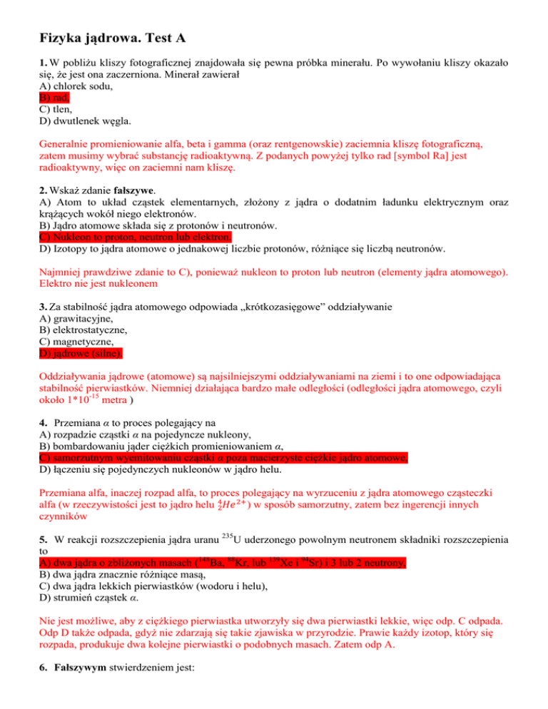 Fizyka jądrowa. Test A 1. W pobliżu kliszy fotograficznej znajdowała się pewna próbka minerału. Po wywołaniu kliszy okazało się, że jest ona zaczerniona. Minerał zawierał A) chlorek sodu, B) rad, C) tlen, D) dwutlenek węgla. Generalnie promieniowanie alfa, beta i gamma (oraz rentgenowskie) zaciemnia kliszę fotograficzną, zatem musimy wybrać substancję radioaktywną. Z podanych powyżej tylko rad [symbol Ra] jest radioaktywny, więc on zaciemni nam kliszę. 2. Wskaż zdanie fałszywe. A) Atom to układ cząstek elementarnych, złożony z jądra o dodatnim ładunku elektrycznym oraz krążących wokół niego elektronów. B) Jądro atomowe składa się z protonów i neutronów. C) Nukleon to proton, neutron lub elektron. D) Izotopy to jądra atomowe o jednakowej liczbie protonów, różniące się liczbą neutronów. Najmniej prawdziwe zdanie to C), ponieważ nukleon to proton lub neutron (elementy jądra atomowego). Elektro nie jest nukleonem 3. Za stabilność jądra atomowego odpowiada „krótkozasięgowe” oddziaływanie A) grawitacyjne, B) elektrostatyczne, C) magnetyczne, D) jądrowe (silne). Oddziaływania jądrowe (atomowe) są najsilniejszymi oddziaływaniami na ziemi i to one odpowiadająca stabilność pierwiastków. Niemniej działająca bardzo małe odległości (odległości jądra atomowego, czyli około 1*10-15 metra ) 4. Przemiana α to proces polegający na A) rozpadzie cząstki α na pojedyncze nukleony, B) bombardowaniu jąder ciężkich promieniowaniem α, C) samorzutnym wyemitowaniu cząstki α poza macierzyste ciężkie jądro atomowe, D) łączeniu się pojedynczych nukleonów w jądro helu. Przemiana alfa, inaczej rozpad alfa, to proces polegający na wyrzuceniu z jądra atomowego cząsteczki alfa (w rzeczywistości jest to jądro helu ) w sposób samorzutny, zatem bez ingerencji innych czynników 5. W reakcji rozszczepienia jądra uranu 235U uderzonego powolnym neutronem składniki rozszczepienia to A) dwa jądra o zbliżonych masach (148Ba, 88Kr, lub 139Xe i 94Sr) i 3 lub 2 neutrony, B) dwa jądra znacznie różniące masą, C) dwa jądra lekkich pierwiastków (wodoru i helu), D) strumień cząstek α. Nie jest możliwe, aby z ciężkiego pierwiastka utworzyły się dwa pierwiastki lekkie, więc odp. C odpada. Odp D także odpada, gdyż nie zdarzają się takie zjawiska w przyrodzie. Prawie każdy izotop, który się rozpada, produkuje dwa kolejne pierwiastki o podobnych masach. Zatem odp A. 6. Fałszywym stwierdzeniem jest: A) Izotopem najlepiej nadającym się do wykorzystania w reaktorze jądrowym jest uran 238U. B) Woda w reaktorze spełnia podwójną rolę, odbiera ciepło od prętów paliwowych i spowalnia neutrony. C) Powolny neutron ma większą szansę rozbicia jądra uranu niż szybki neutron. D) Pręty sterujące dobrze pochłaniają neutrony, spowalniając w ten sposób proces reakcji. To pytanie jest trudne . Na 100% zdania B i D są poprawne. Woda jest jednym z lepszych MODERATORÓW [tu o moderatorach http://www.if.pw.edu.pl/~liwinski/mitj/procesy/fiz05.html ], zatem na pewno spowalnia neutrony. Pręty sterujące są po to w reaktorze, aby pochłaniać neutrony i w ten sposób nadzorować pracę reaktora. Co do odpowiedzi A: Uran 238 jest izotopem uranu, którego na ziemi jest najwięcej. Niemniej to uran 235 (wzbogacony uran) lepiej nadaje się do reakcji jądrowych. Z uranu 238, najpierw tworzy się Pluton 239 i ten dopiero rozpada się. Co do odp. C: Większość izotopów można rozszczepić TYLKO za pomocą neutronów powolnych, a jednak neutrony szybkie (wysokoenergetyczne) także mogą rozszczepić niektóre jądra atomowe. Więcej tutaj: http://www.nuclear.pl/?dzial=podstawy&plik=rozpad Z powyższego linku wynika, że izotop U235 można rozszczepić neutronem o dowolnej prędkości (energii), natomiast U236 i U238 (ten najbardziej powszechny izotop uranu) tylko neutronami powolnymi. Według mnie to zadanie jest niedoprecyzowane. Nie potrafię stwierdzić jednoznacznie, która odpowiedź jest prawidłowa, stawiam jednak, iż fałszywym zdaniem jest mimo wszystko A 7. Zapis oznacza jądro ołowiu zawierające A) 208 protonów i 82 neutrony, B) 82 protony i 126 neutronów, C) 82 neutrony i 126 protonów, D) 82 protony i 208 neutronów. Krótki wstęp: A- liczba masowa. Pokazuje ilość NUKLEONÓW w jądrze atomowym, zatem neutronów i protonów. Z – liczba atomowa. Liczba PROTONÓW w jądrze atomowym. Liczba elektronów w izotopach naturalnie występujących, jest identyczna co do liczby protonów. Zatem liczba neutronów to A-Z. Z tego wynika, że ołów zawiera 82 PROTONY, 82 ELEKTRONY i 208-82 NEUTRONY 8. Masa jądra helu jest A) większa, B) taka sama, C) mniejsza, D) nieznacznie większa w porównaniu z masą jego składników (2 protonów i 2 neutronów). Wydaje mi się, że odpowiedź D powinna brzmieć ‘nieznacznie mniejsza’ i to byłaby dobra odpowiedź. Masy jąder atomowych są nieznacznie mniejsze od ich składników, a wynika to z deficytu masy [http://pl.wikipedia.org/wiki/Deficyt_masy]. Ale skoro odp D jest taka, jaka jest, poprawną odpowiedzią jest C 9. Jakie jądro powstaje wskutek przemiany α jądra A) B) C) D) ? Proste zadanie. Rozpad alfa to nic innego jak odłączenie się cząstki alfa [patrz zadanie 4]. Po wyrzuceniu cząsteczki alfa zostanie nam (polon). 10. Schemat przedstawia rozpad promieniotwórczy jądra toru, któremu towarzyszy emisja cząstki α. Wskaż błędne przyporządkowanie. A) x = 232, B) y = 2, C) z = 92, D) X = I kolejne zadanie z cząstką alfa. Skoro cząstka alfa to być 228 + 4 = 232, a z = 90 – 2 = 88. Odpowiedź poprawna to odpowiedź C. - to y musi być równe 2, X musi być α, x musi 11. Skorzystaj z zasad zachowania i znajdź brakujący produkt x reakcji syntezy jądrowej. A) x = (proton) B) x = (neutron) C) x = (elektron) D) x = (deuter) Synteza jądrowa, inaczej fuzja, wyzwala ze dwa razy więcej energii niż reakcje rozpadu. W wyniku łączenia się deuteru ( )