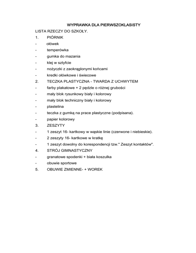 WYPRAWKA DLA PIERWSZOKLASISTY LISTA RZECZY DO SZKOŁY. 1. PIÓRNIK - ołówek - temperówka - gumka do mazania - klej w sztyfcie - nożyczki z zaokrąglonymi końcami - kredki ołówkowe i świecowe 2. TECZKA PLASTYCZNA - TWARDA Z UCHWYTEM - farby plakatowe + 2 pędzle o różnej grubości - mały blok rysunkowy biały i kolorowy - mały blok techniczny biały i kolorowy - plastelina - teczka z gumką na prace plastyczne (podpisana). - papier kolorowy 3. ZESZYTY - 1 zeszyt 16- kartkowy w wąskie linie (czerwone i niebieskie). - 2 zeszyty 16- kartkowe w kratkę - 1 zeszyt dowolny do korespondencji tzw." Zeszyt kontaktów". 4. STRÓJ GIMNASTYCZNY - granatowe spodenki + biała koszulka - obuwie sportowe 5. OBUWIE ZMIENNE- + WOREK